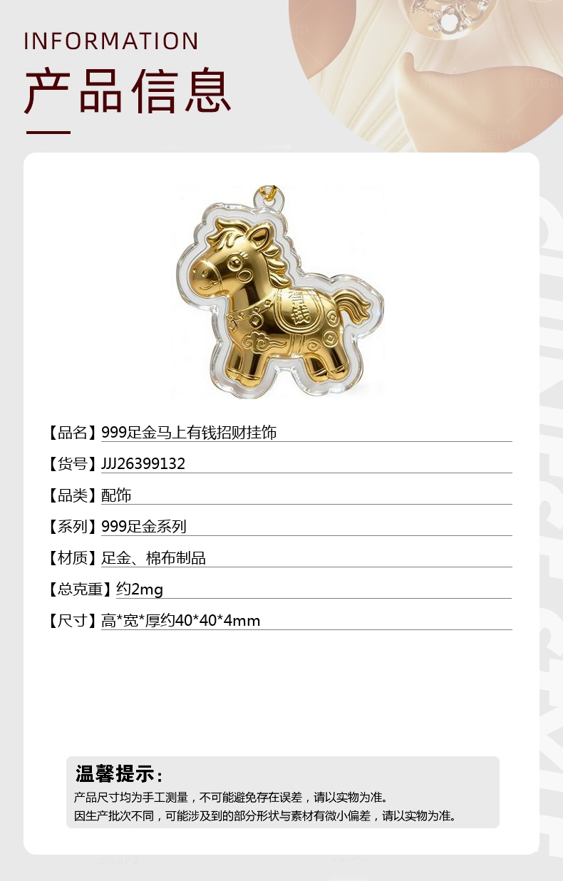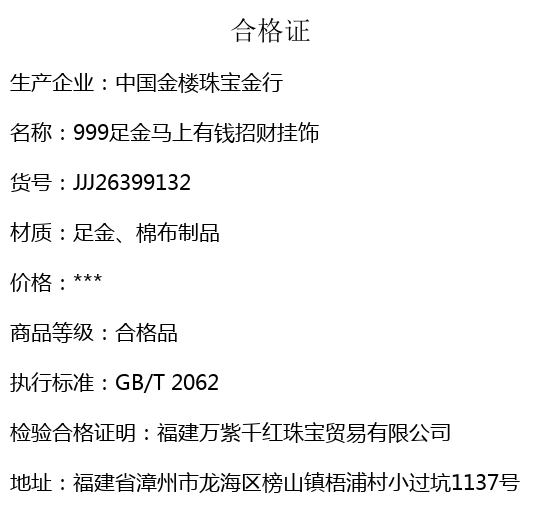 【品名】中国金楼999足金马上有钱招财挂饰