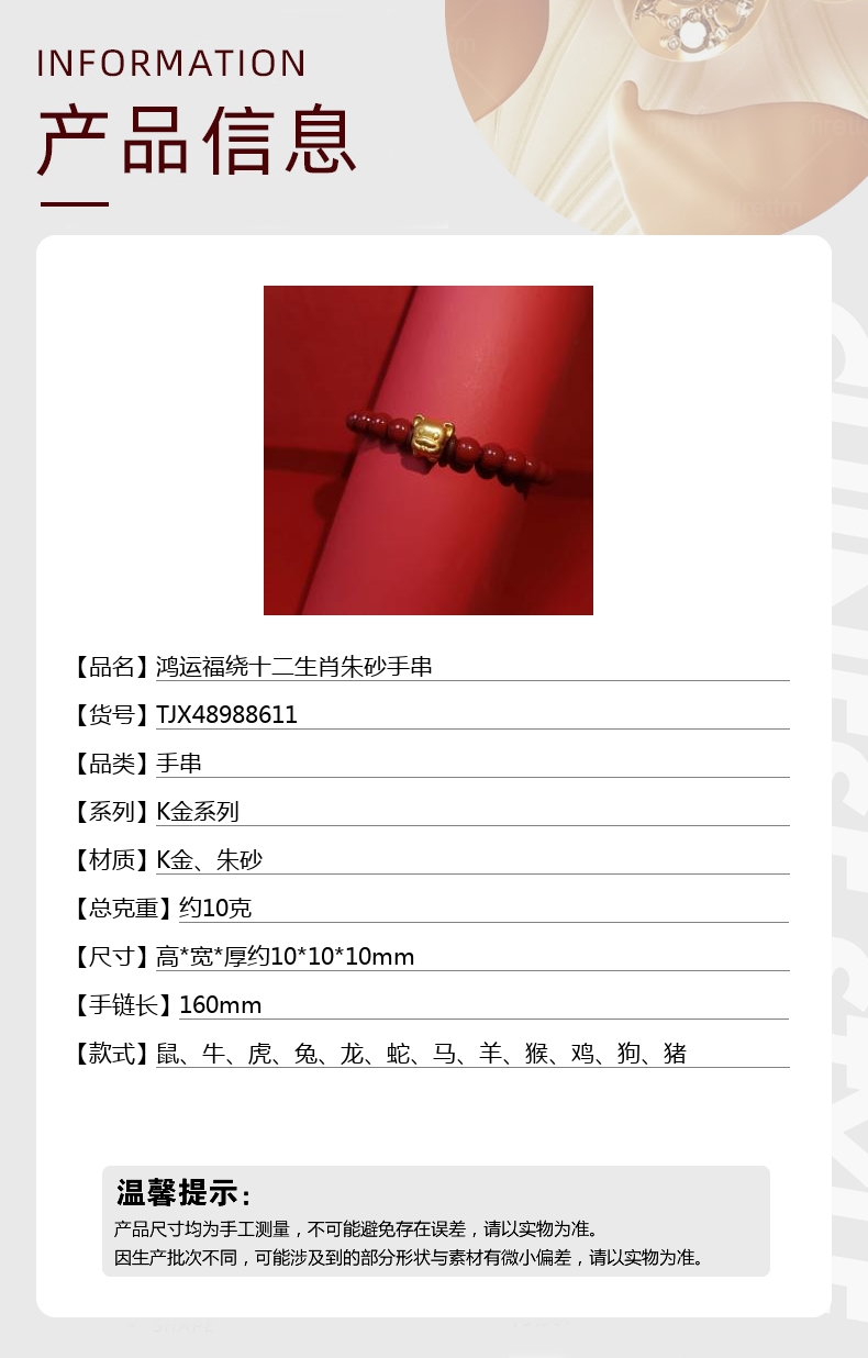 【品名】中国金楼鸿运福绕十二生肖朱砂手串