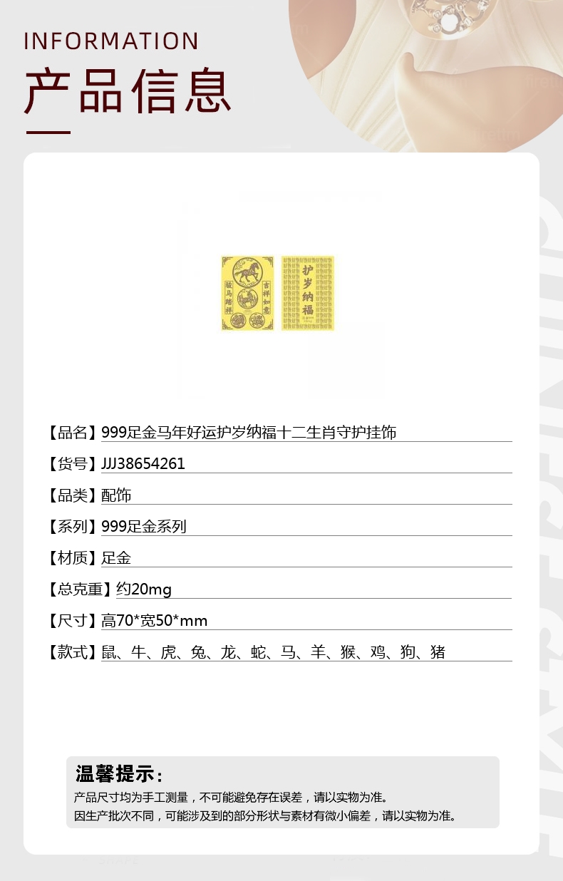 【品名】中国金楼999足金马年好运护岁纳福十二生肖守护挂饰