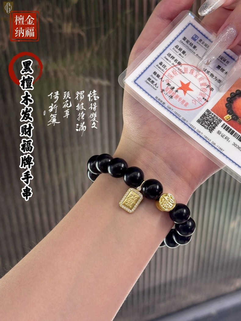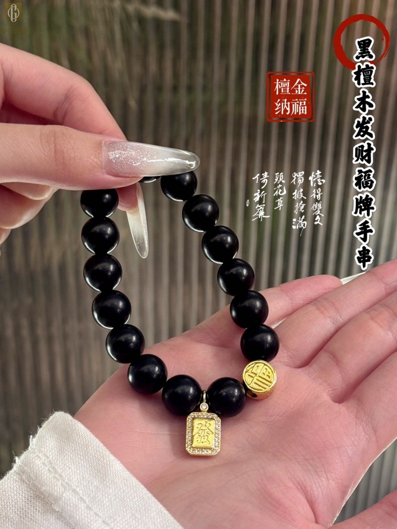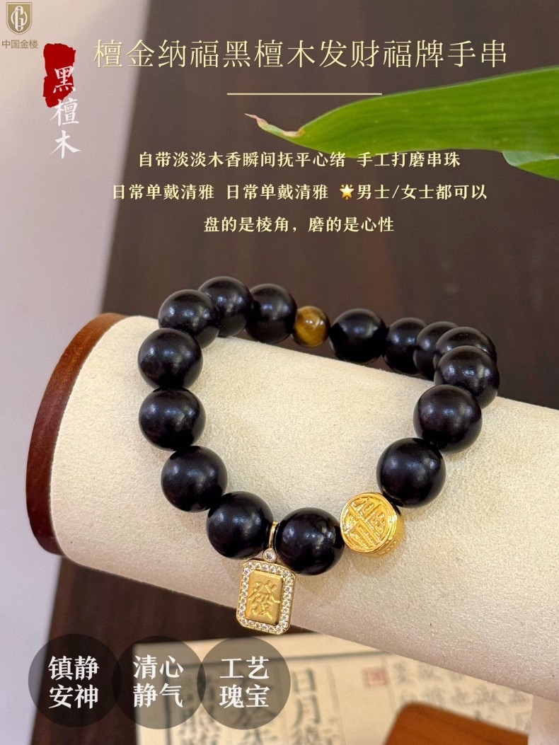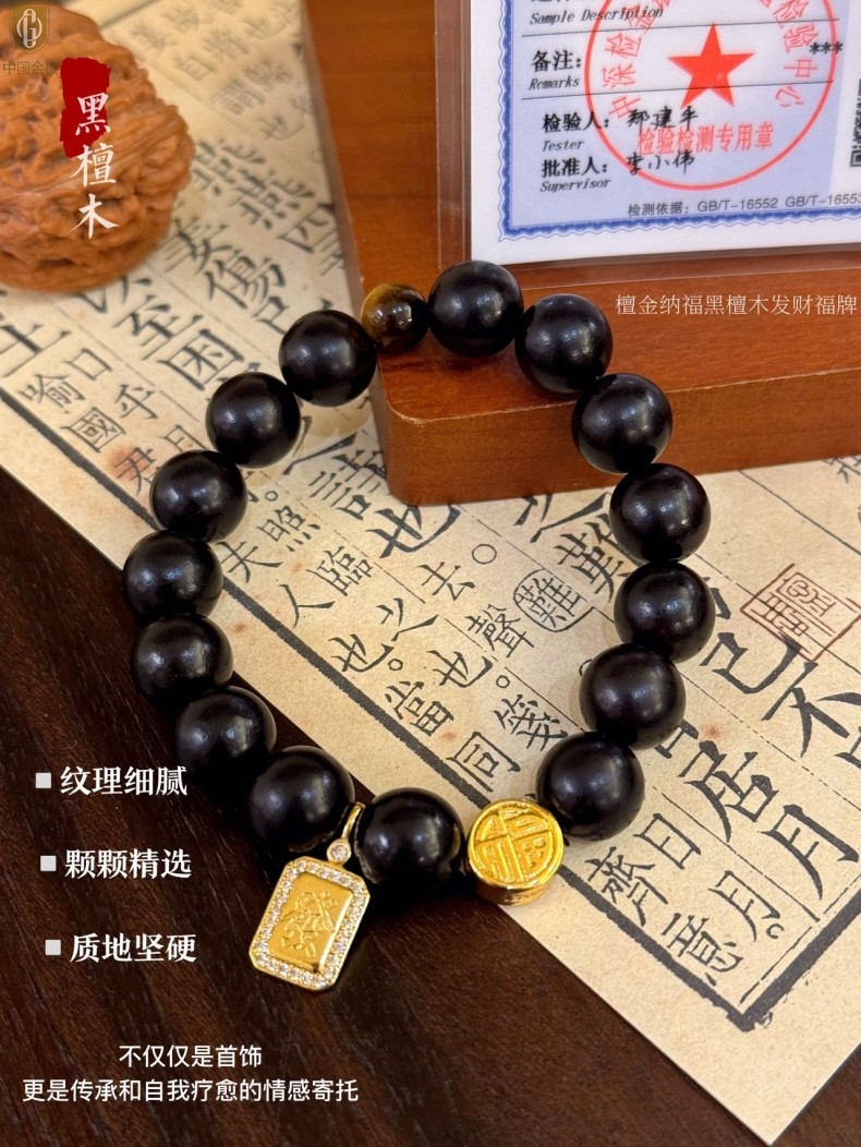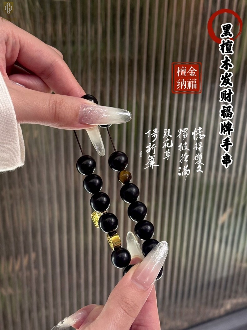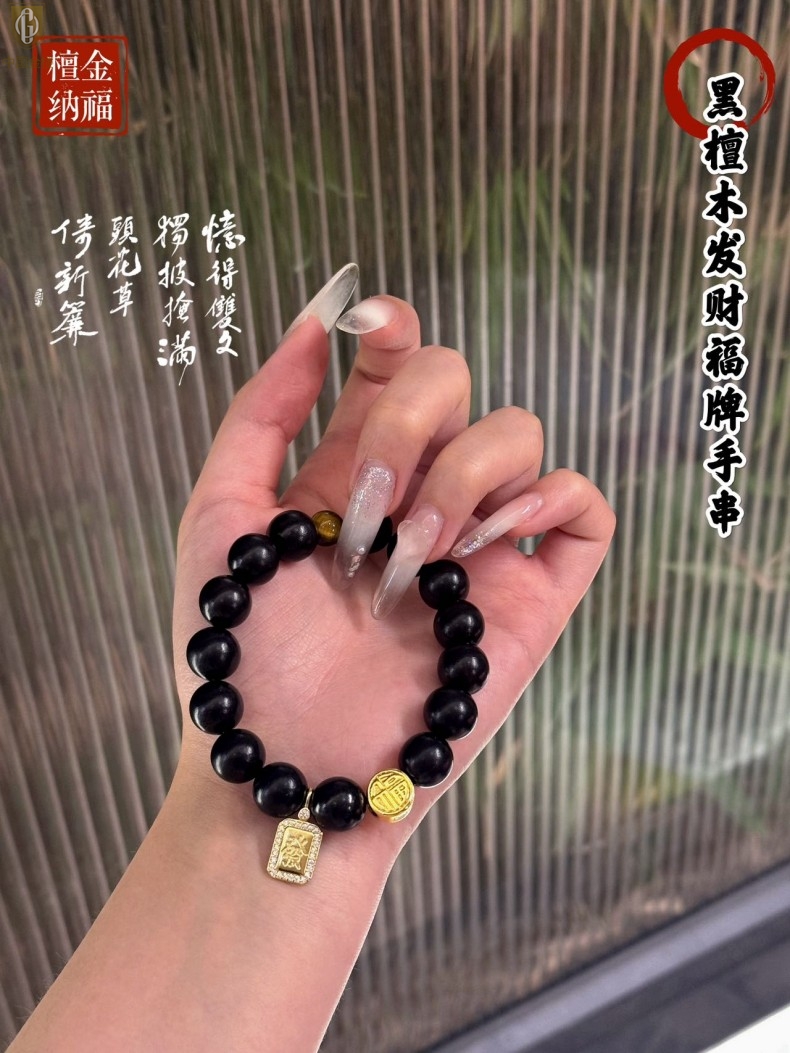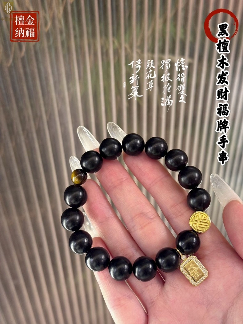 【品名】中国金楼檀金纳福黑檀木发财福牌手串