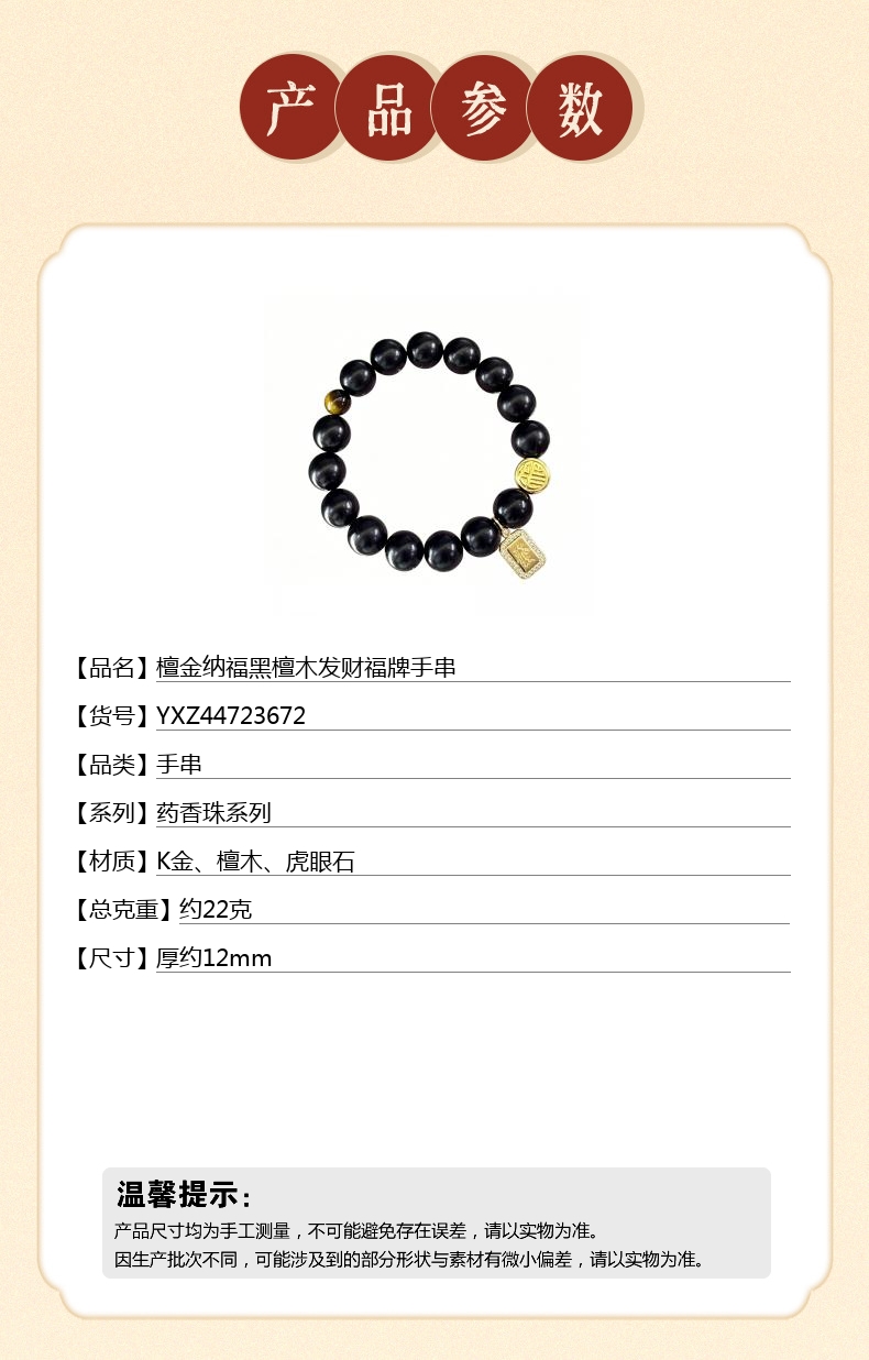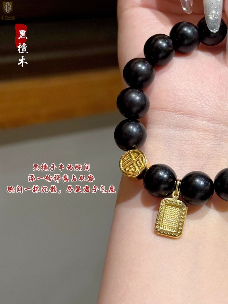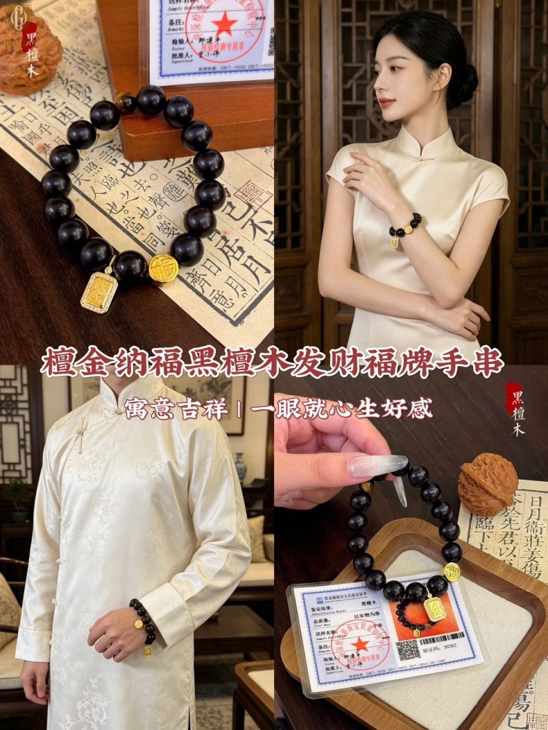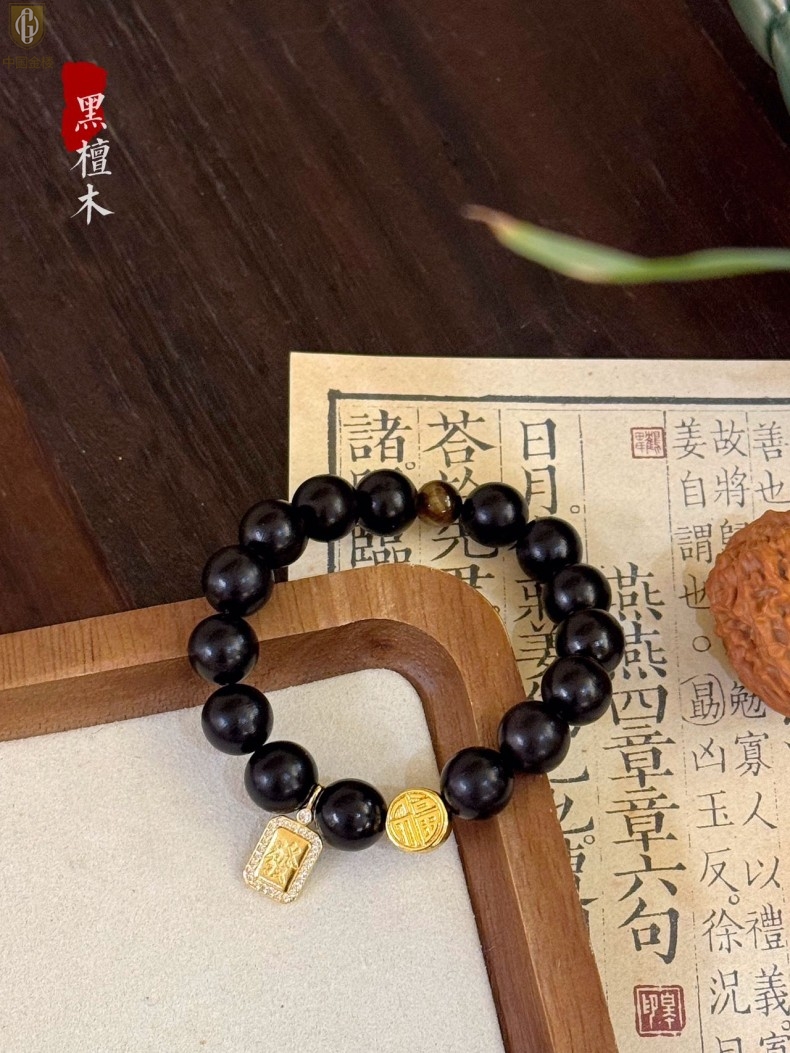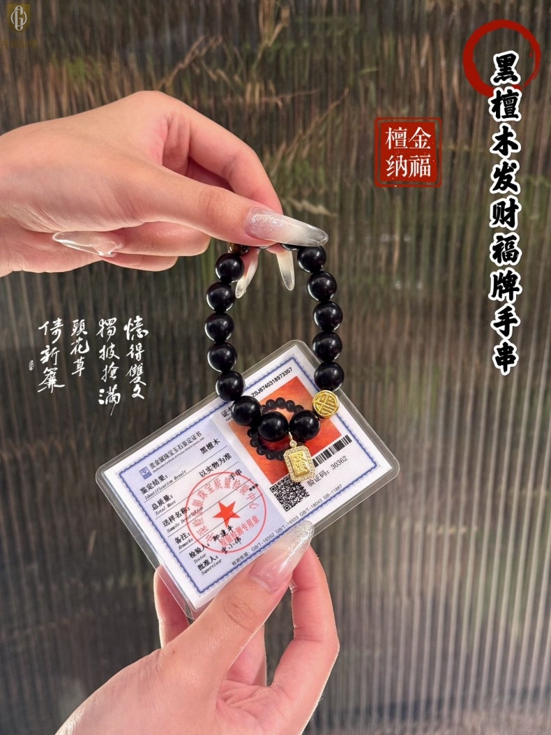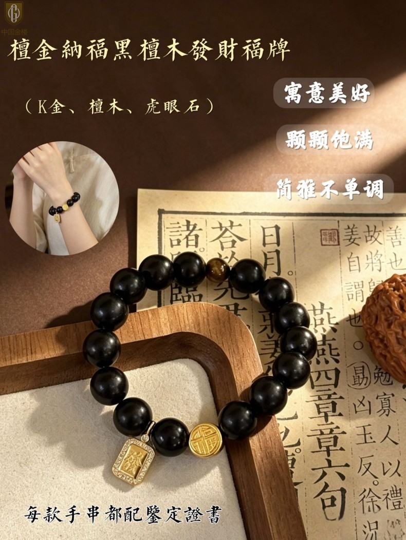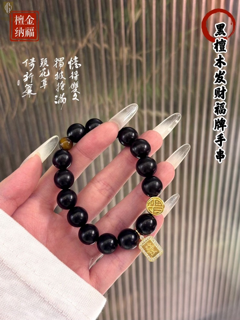 【品名】中国金楼檀金纳福黑檀木发财福牌手串