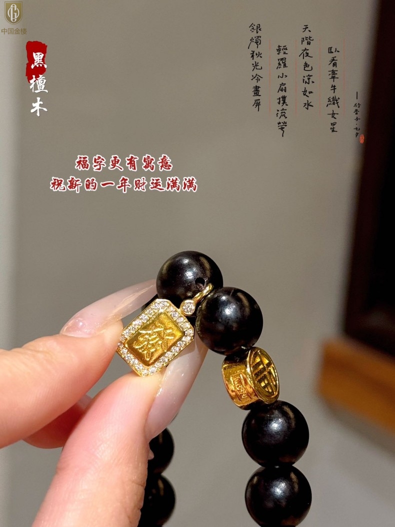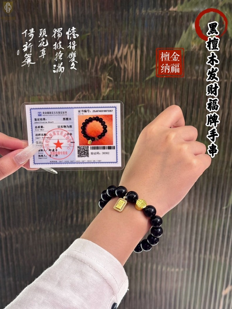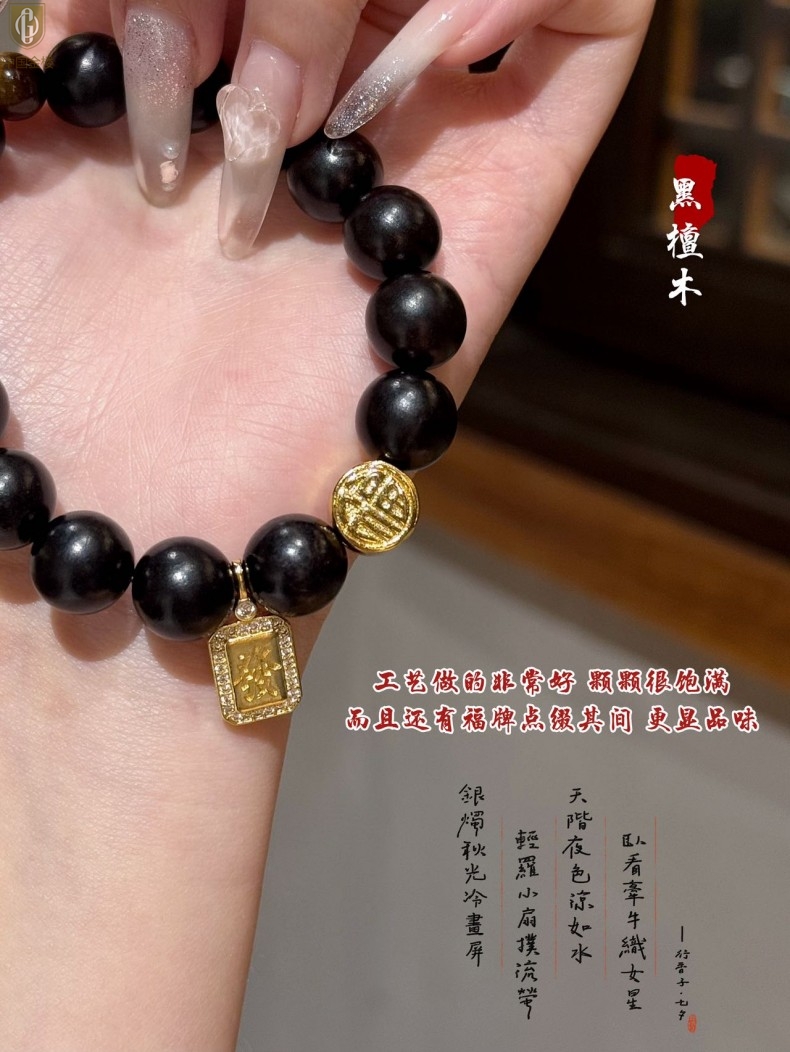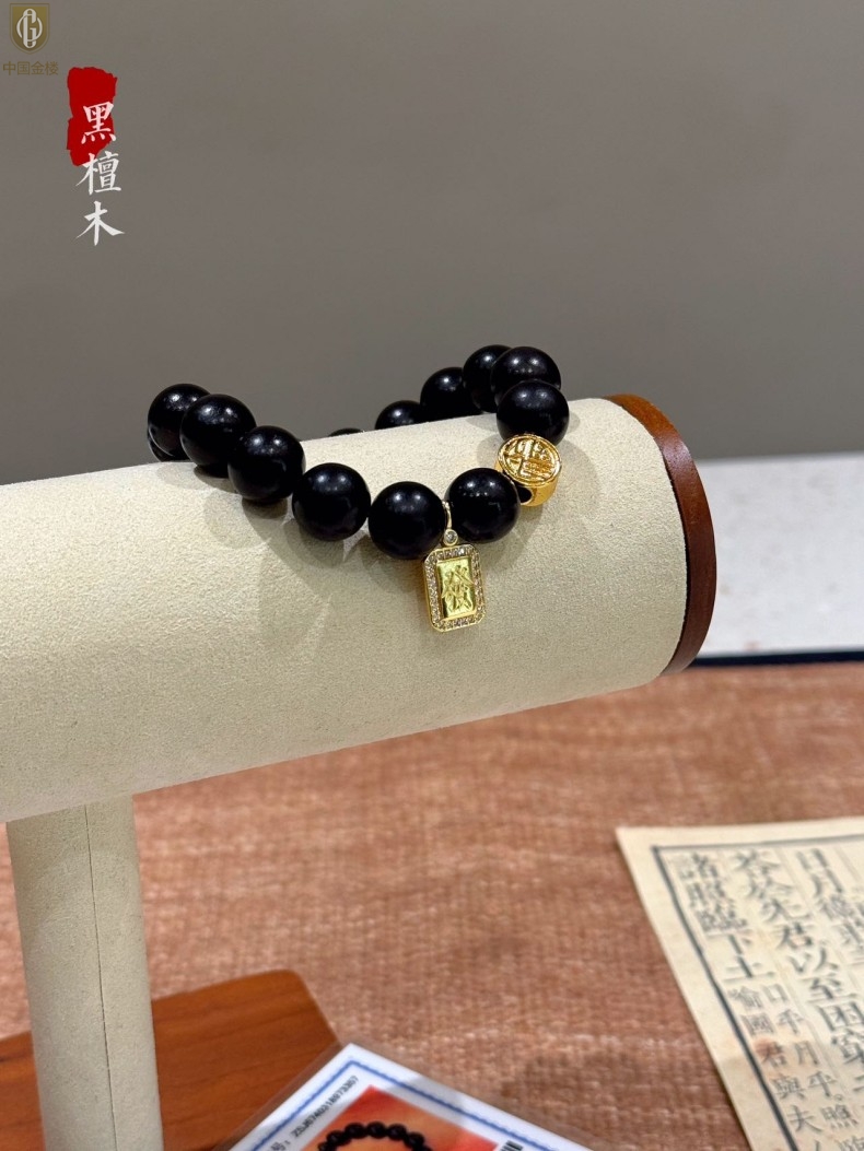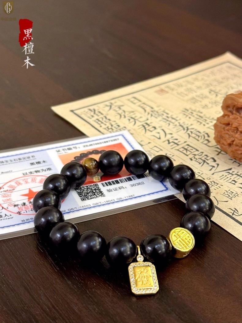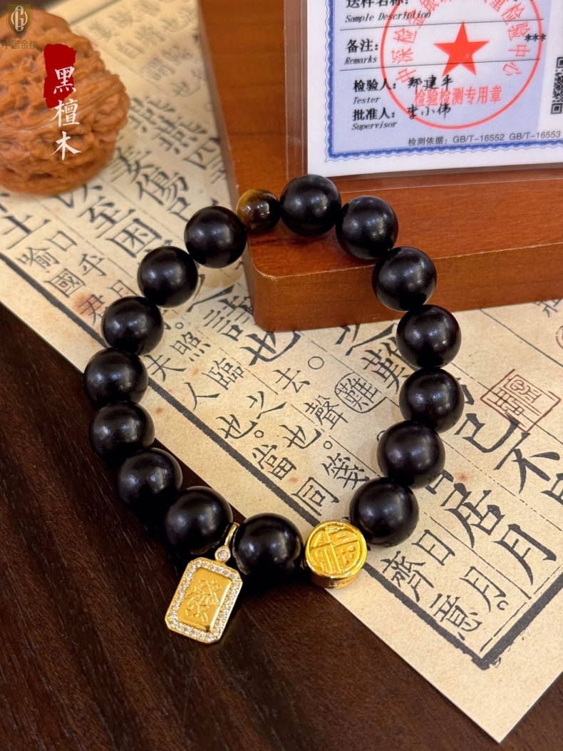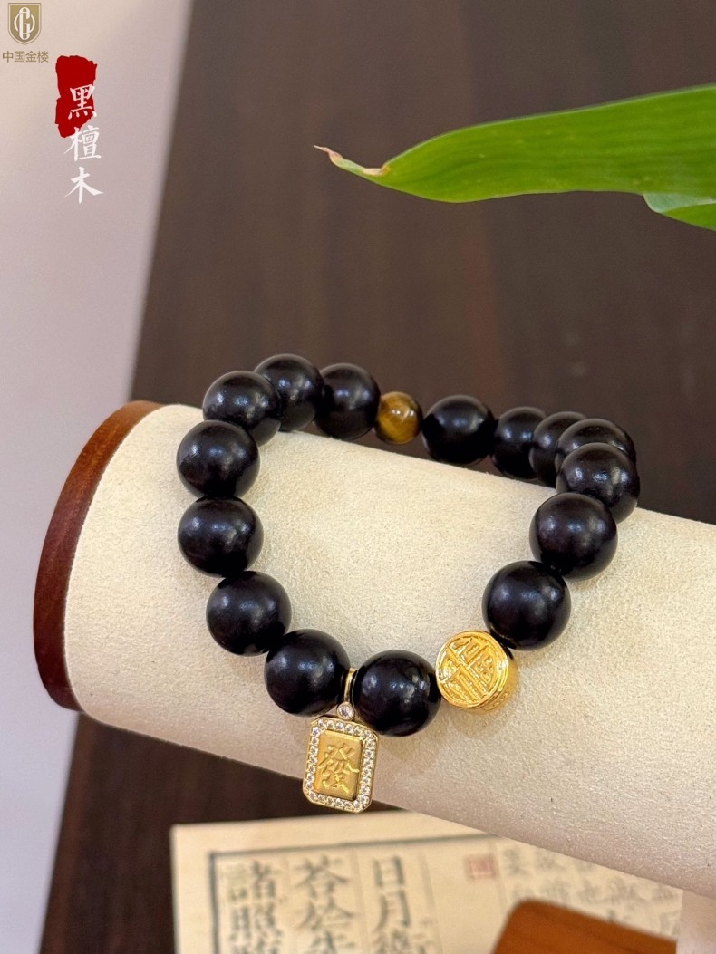 【品名】中国金楼檀金纳福黑檀木发财福牌手串