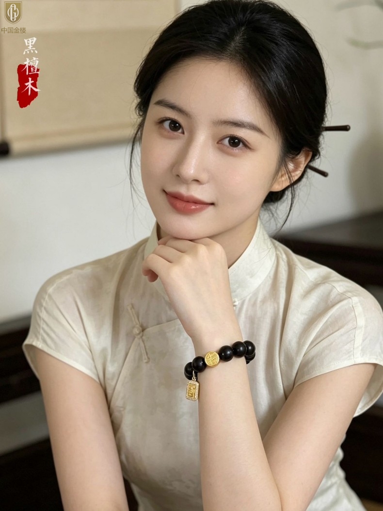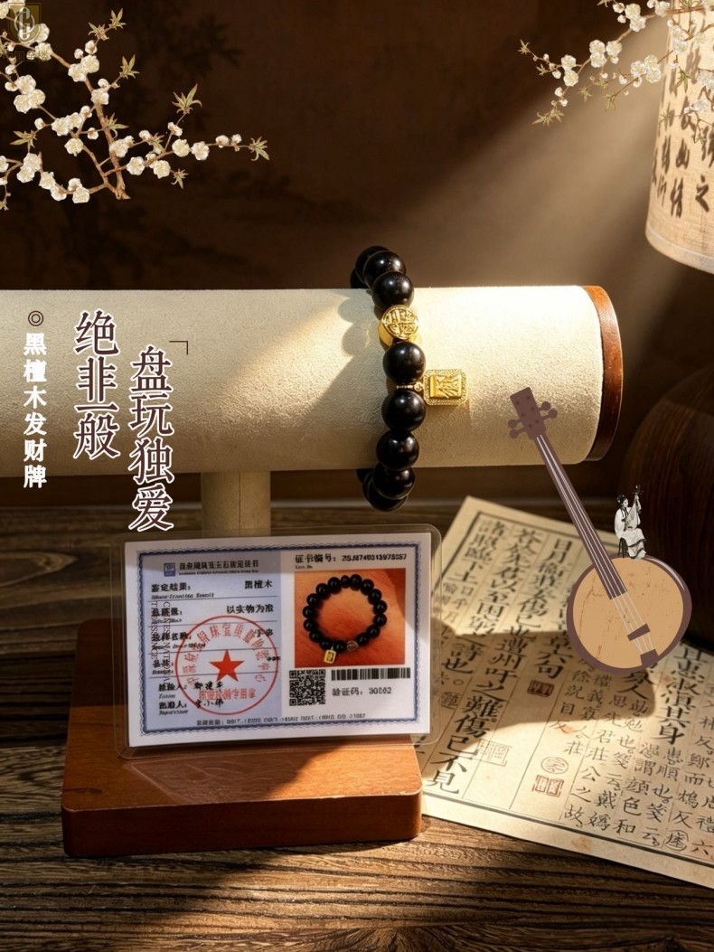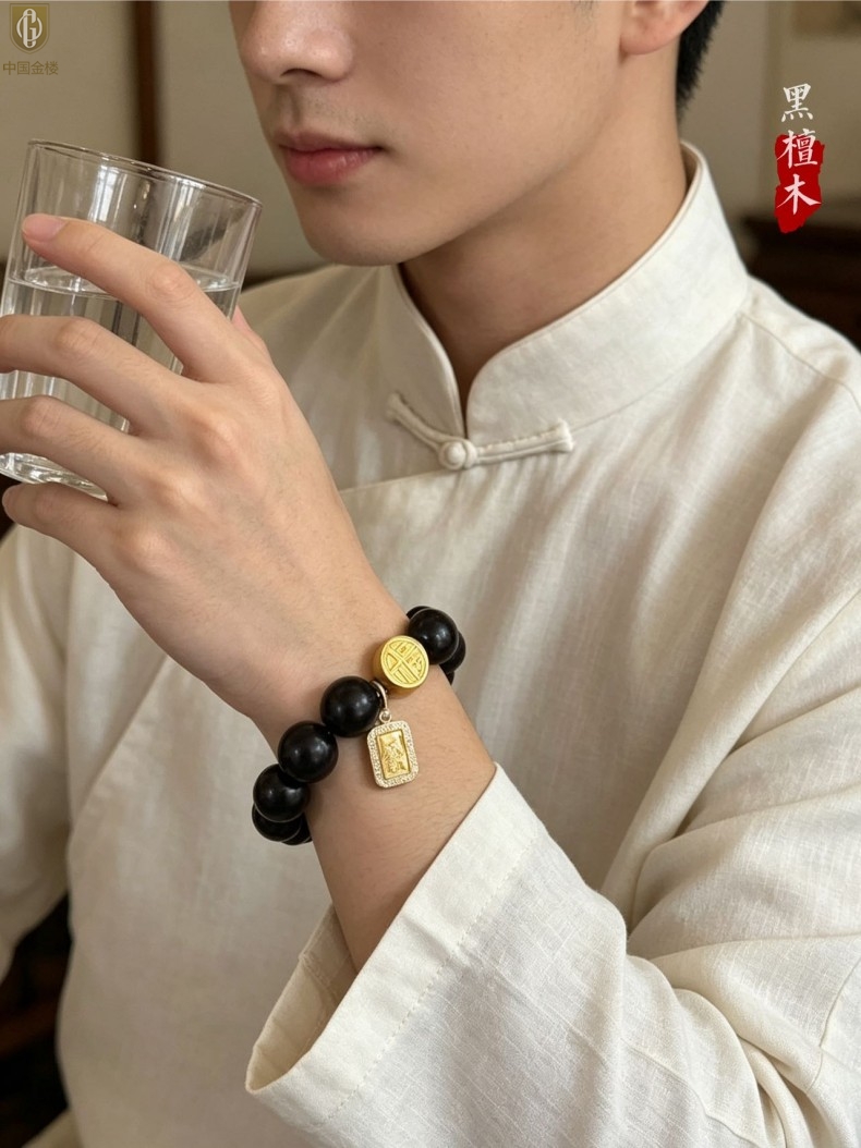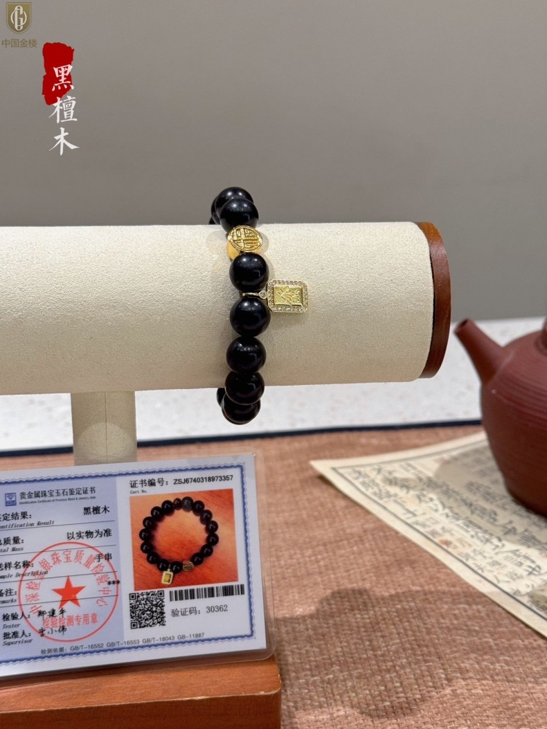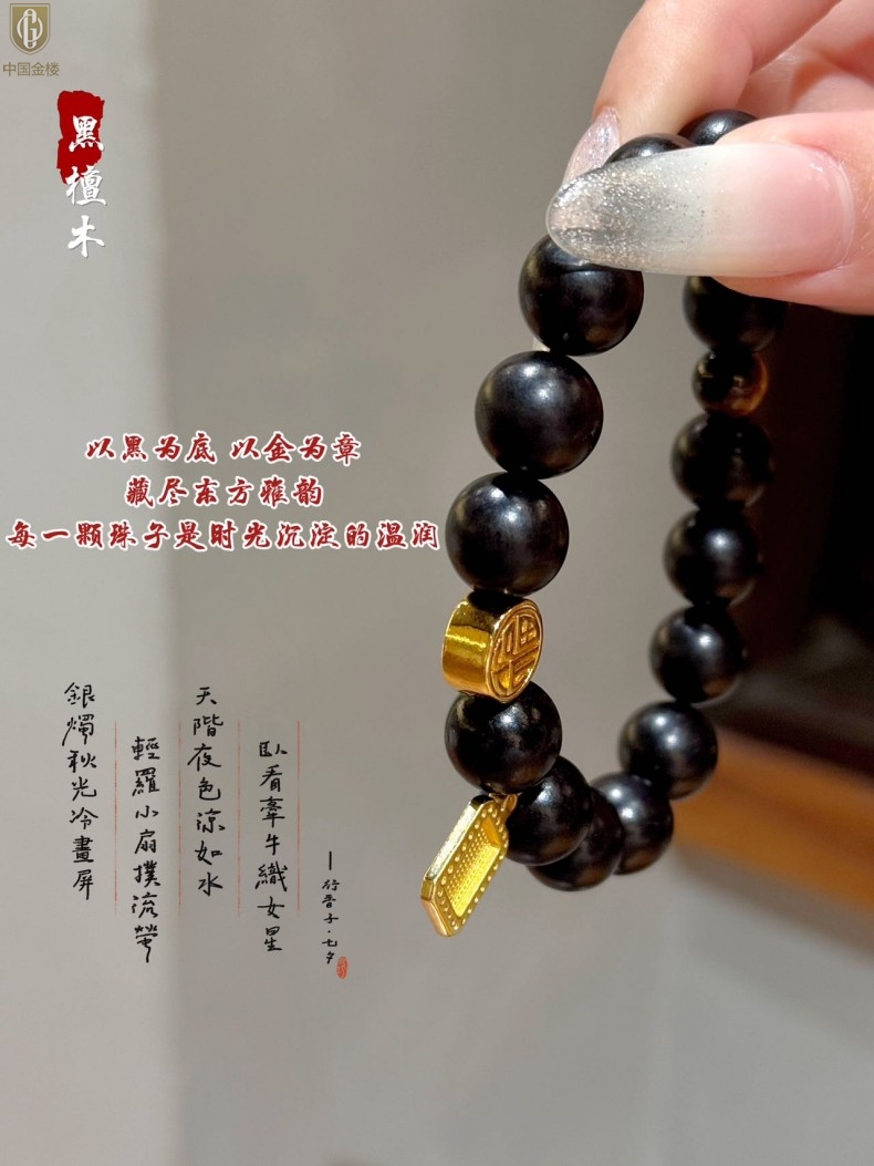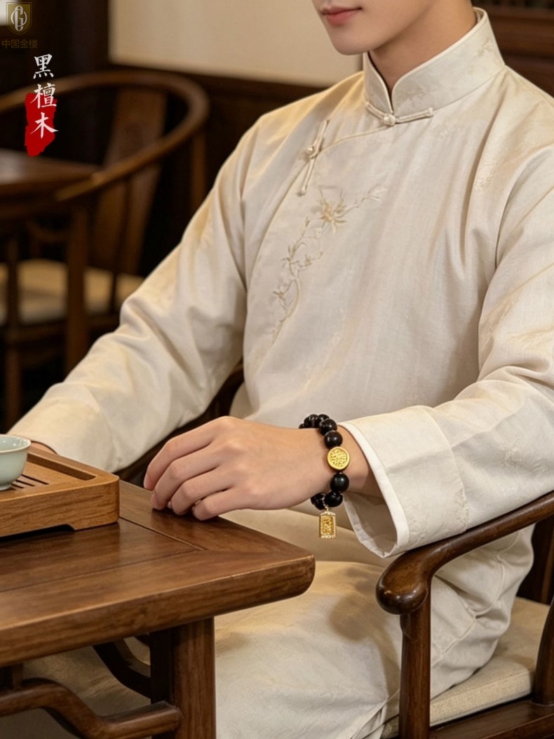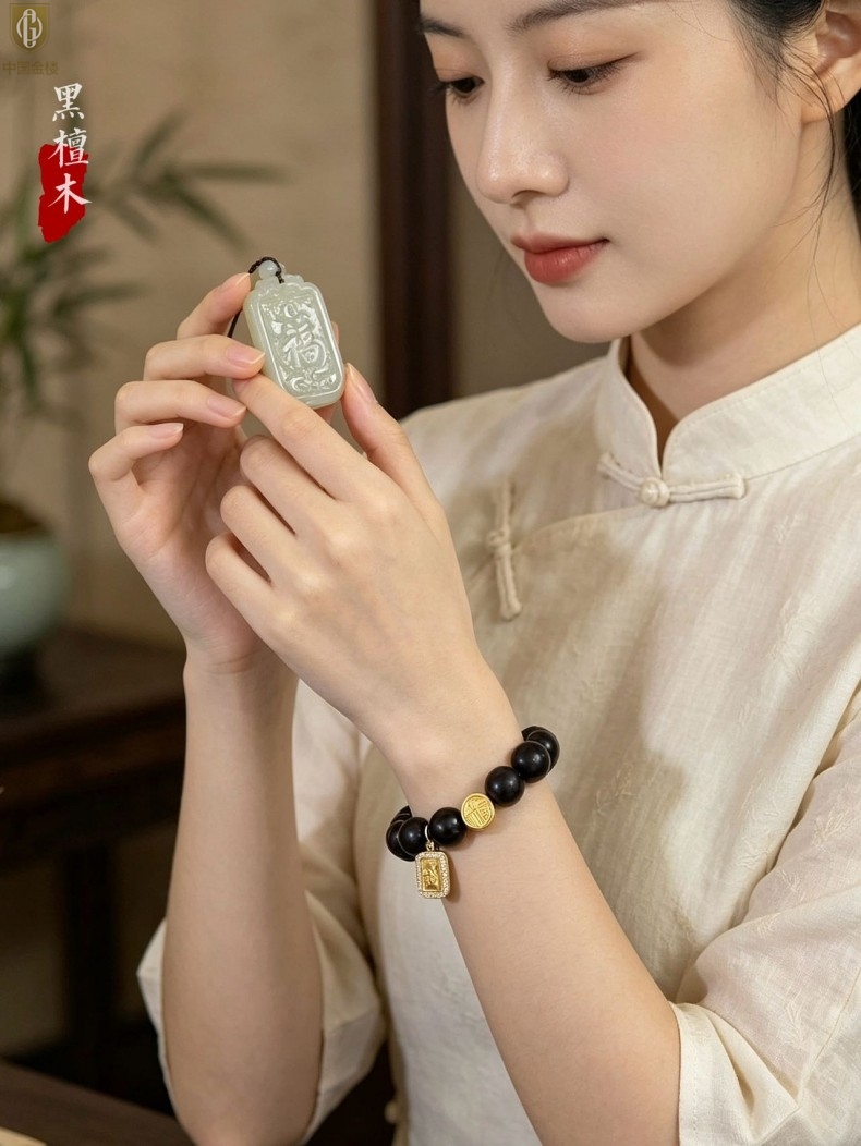 【品名】中国金楼檀金纳福黑檀木发财福牌手串