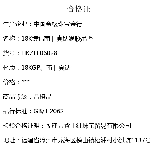 【品名】中国金楼18K镶钻南非真钻滴胶吊坠