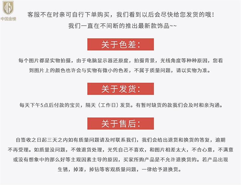 4、 运输过程中难免有些小瑕疵,珠宝首饰是贵重货品,务必要求当场签收!!!