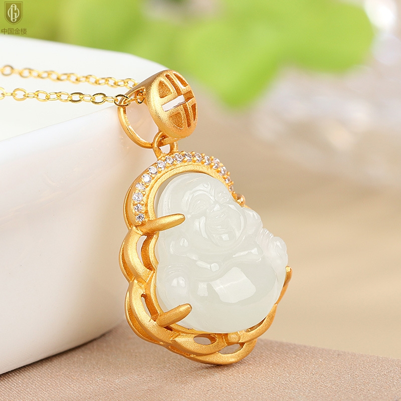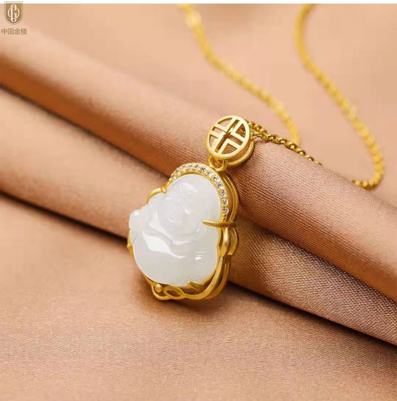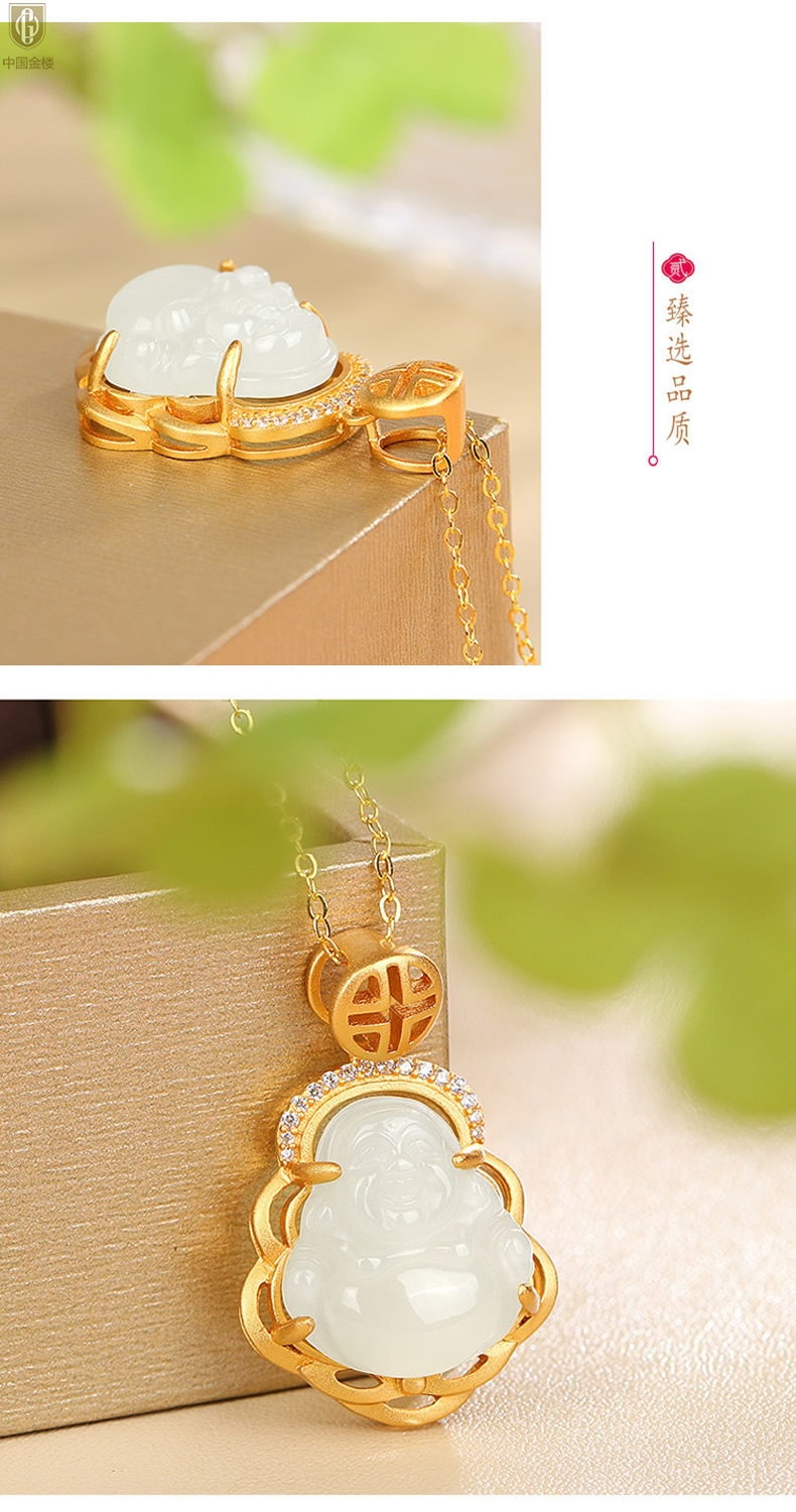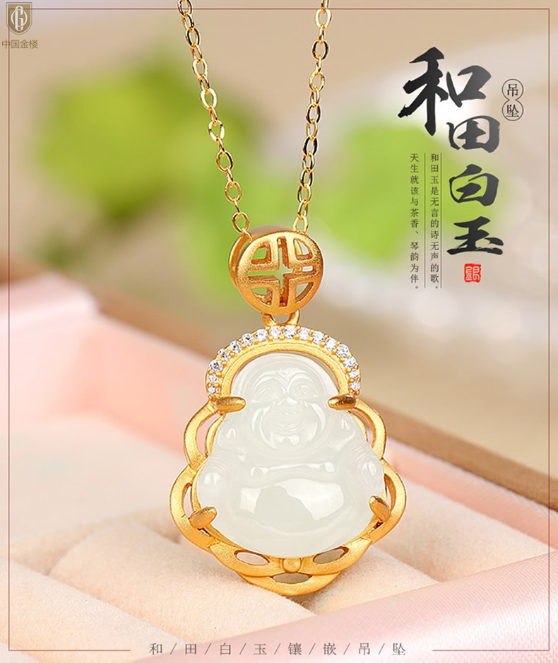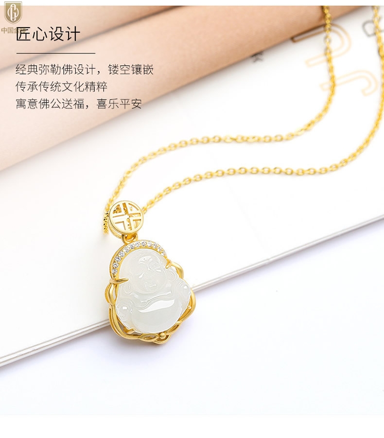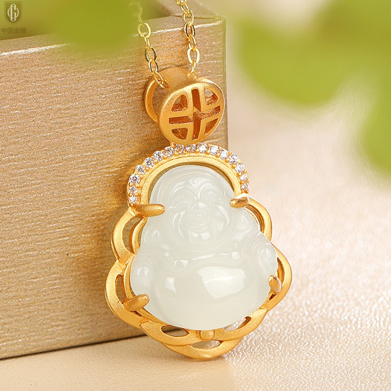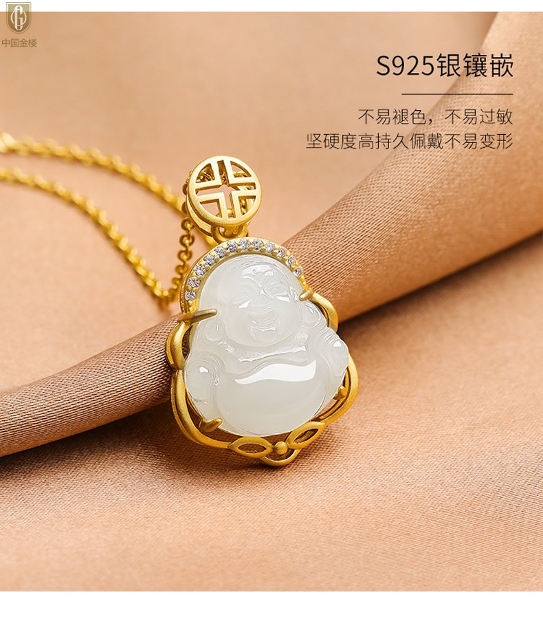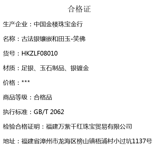 【品名】中国金楼古法银镶嵌和田玉-笑佛