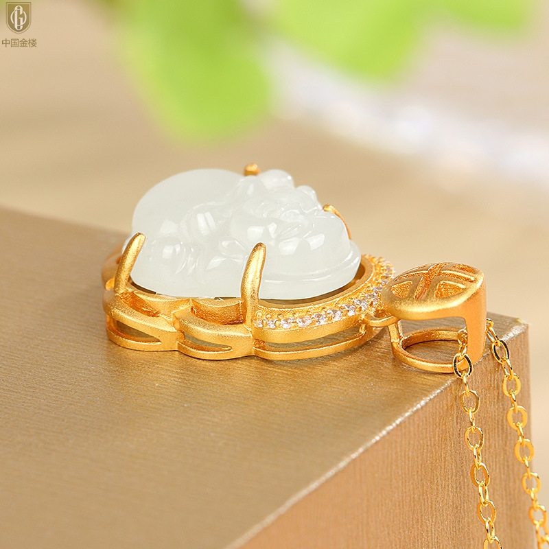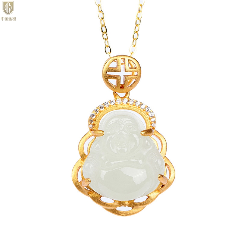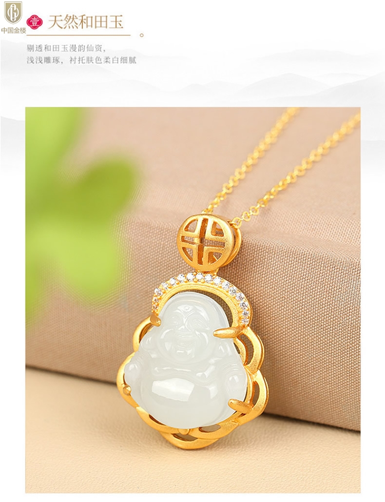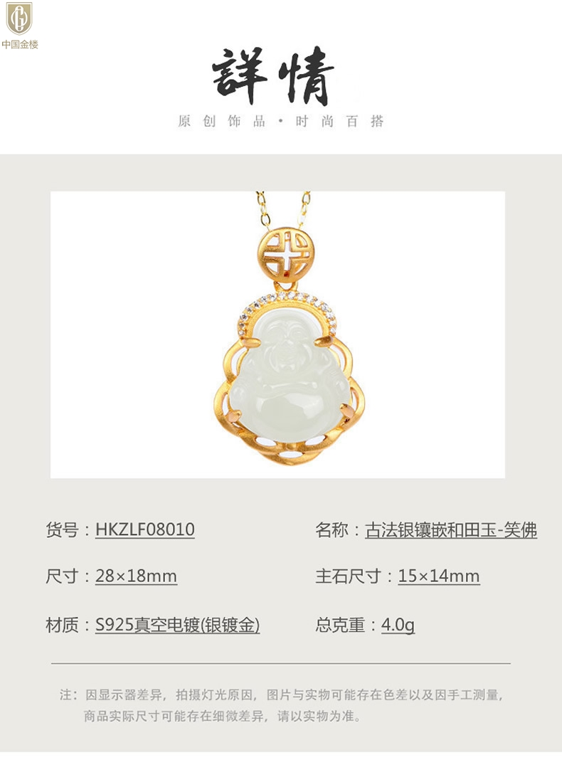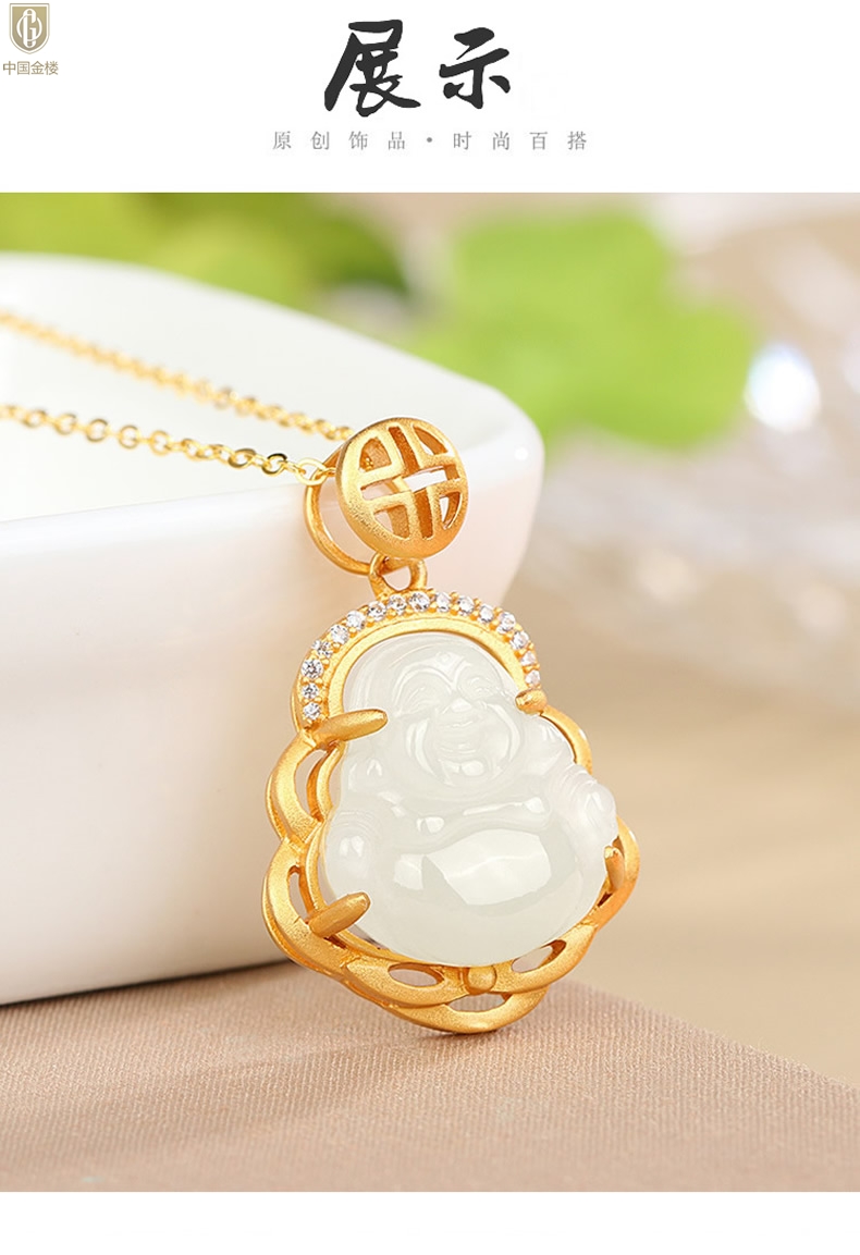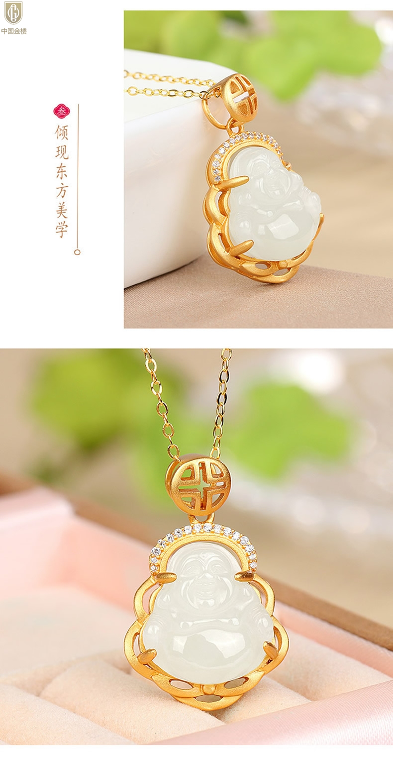 【品名】中国金楼古法银镶嵌和田玉-笑佛