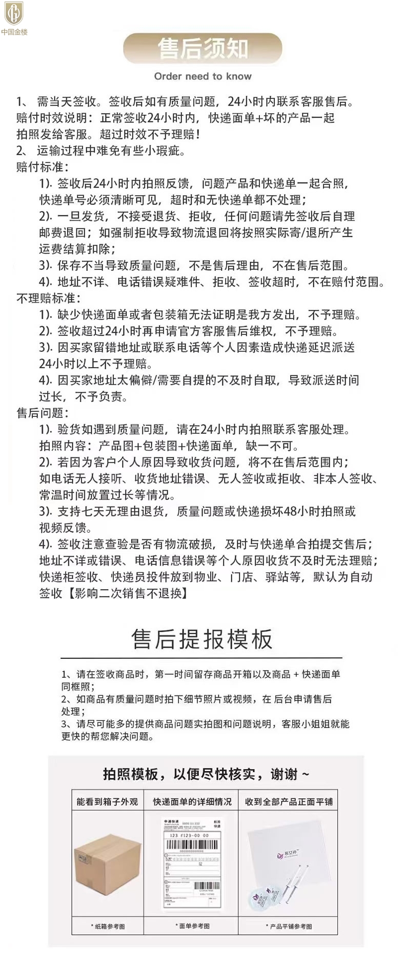 4、 运输过程中难免有些小瑕疵,珠宝首饰是贵重货品,务必要求当场签收!!!
