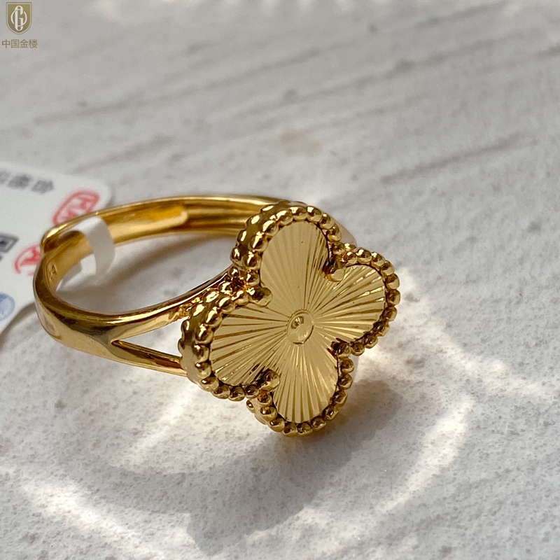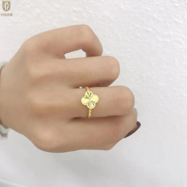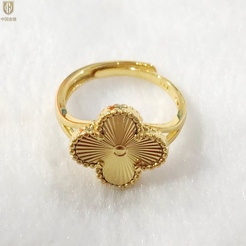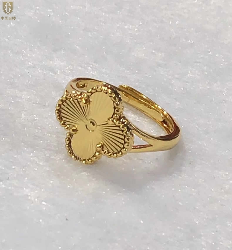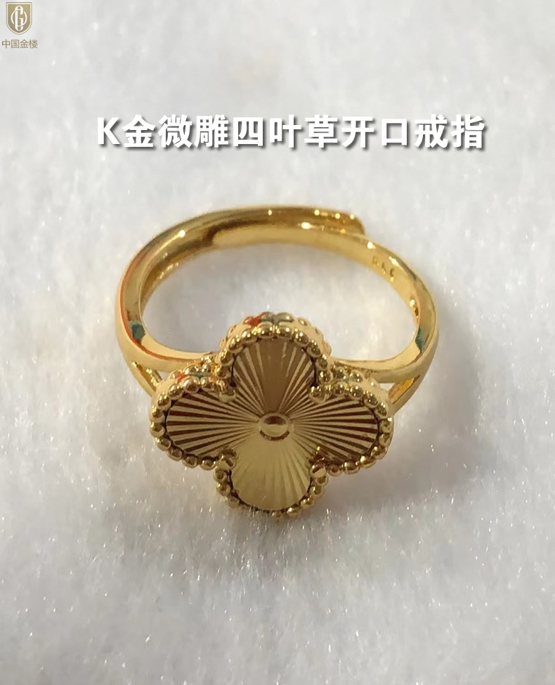 【品名】中国金楼K金微雕四叶草开口戒指