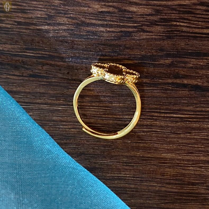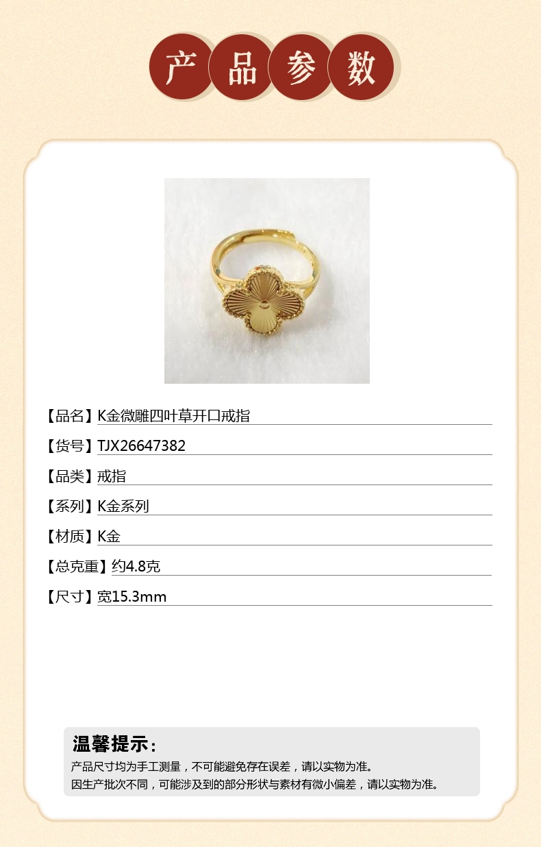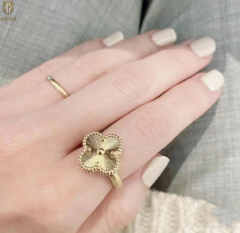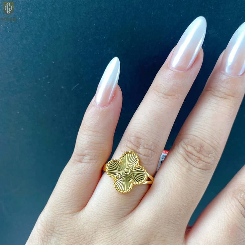 【品名】中国金楼K金微雕四叶草开口戒指