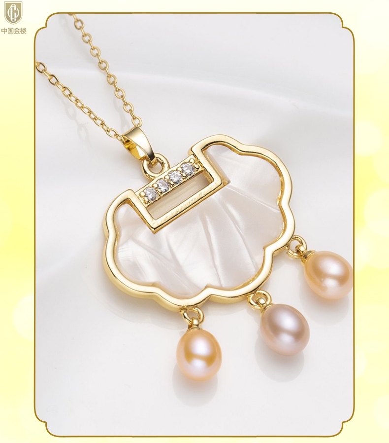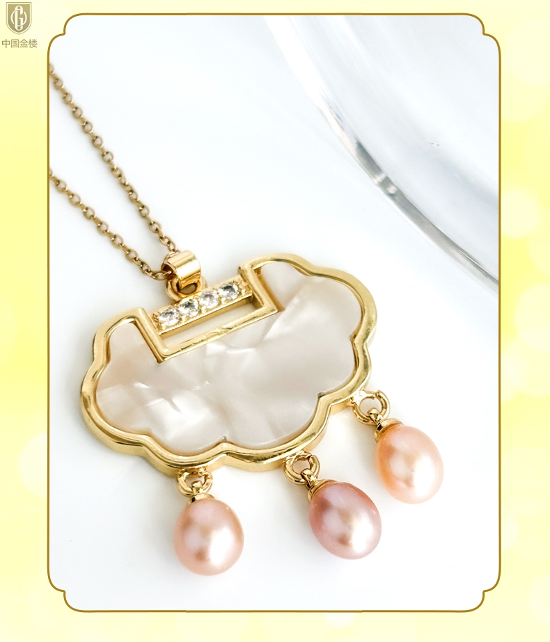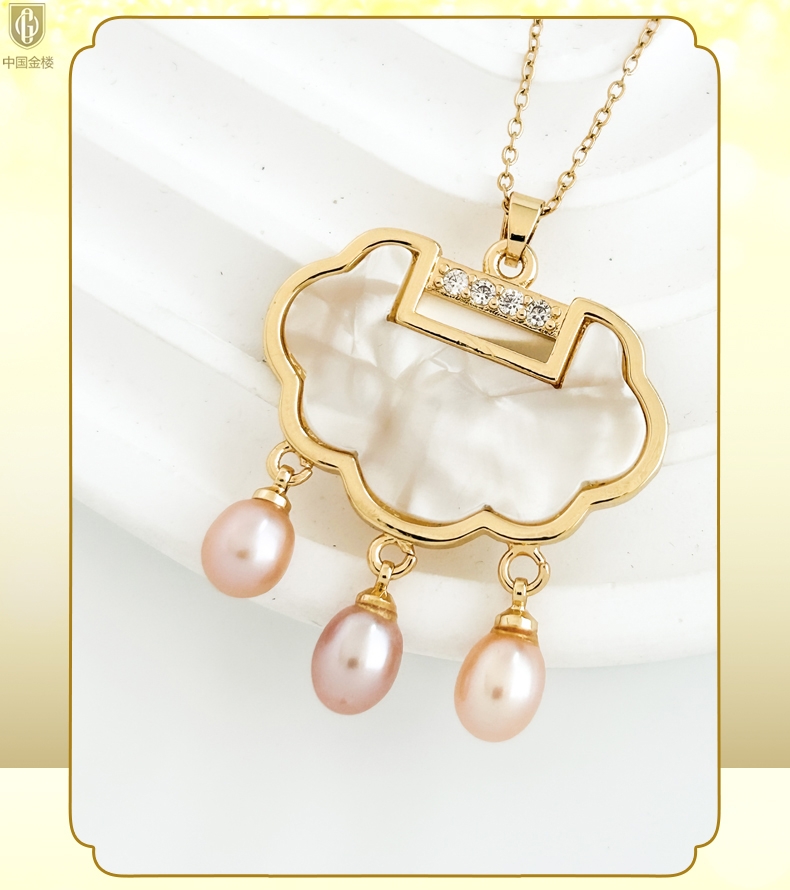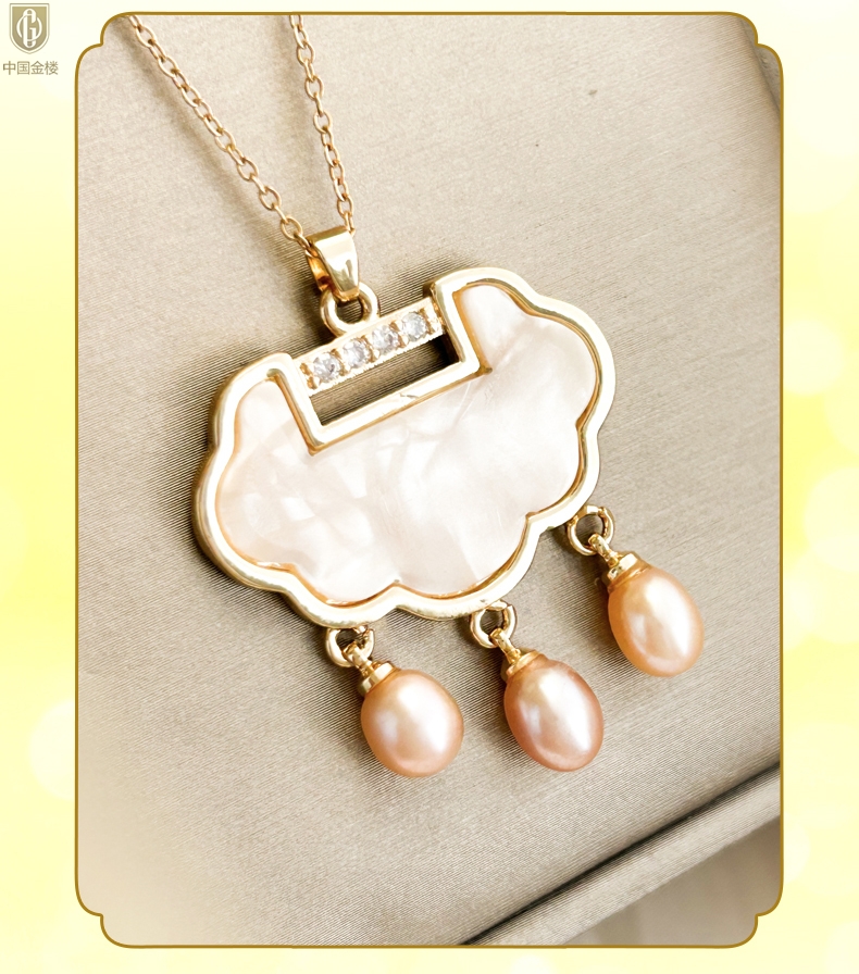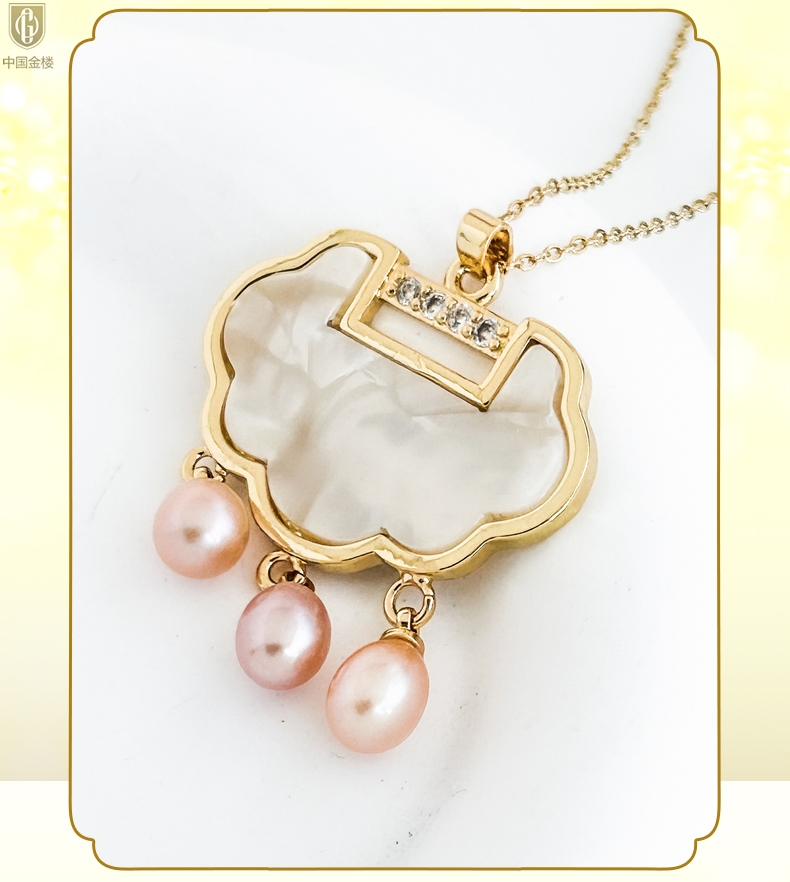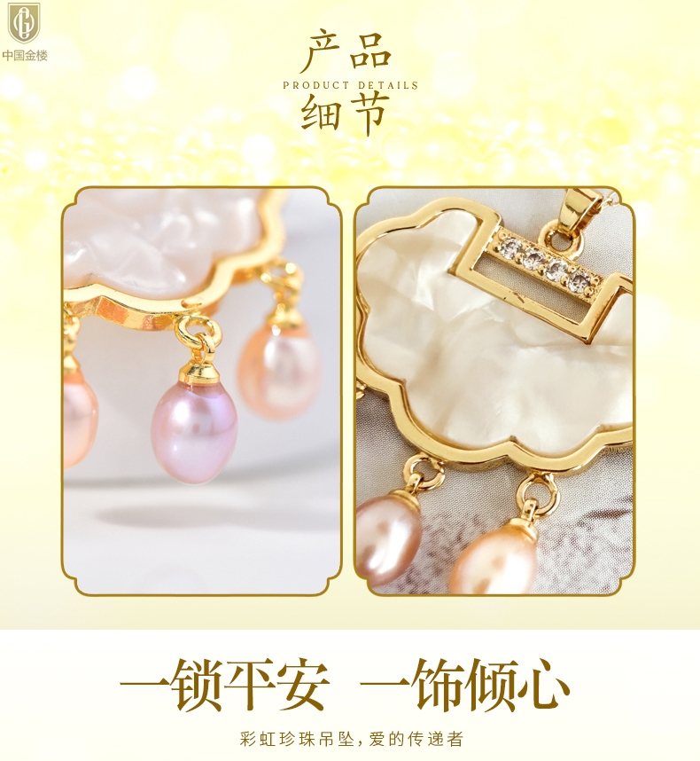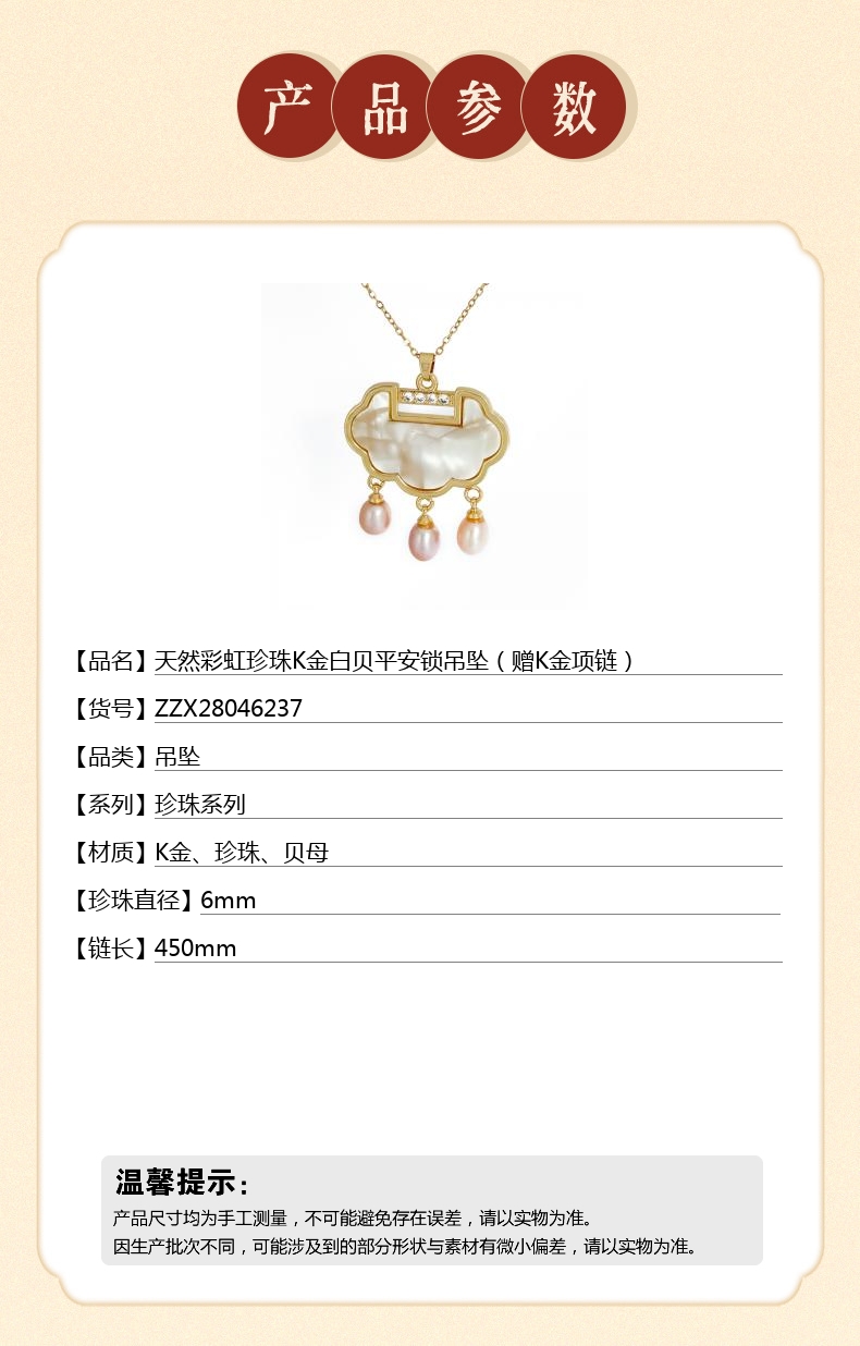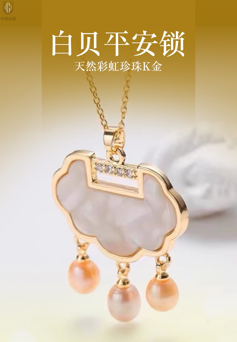 【品名】中国金楼天然彩虹珍珠K金白贝平安锁吊坠(赠K金项链)