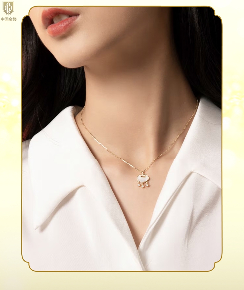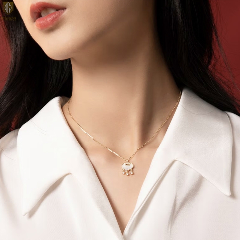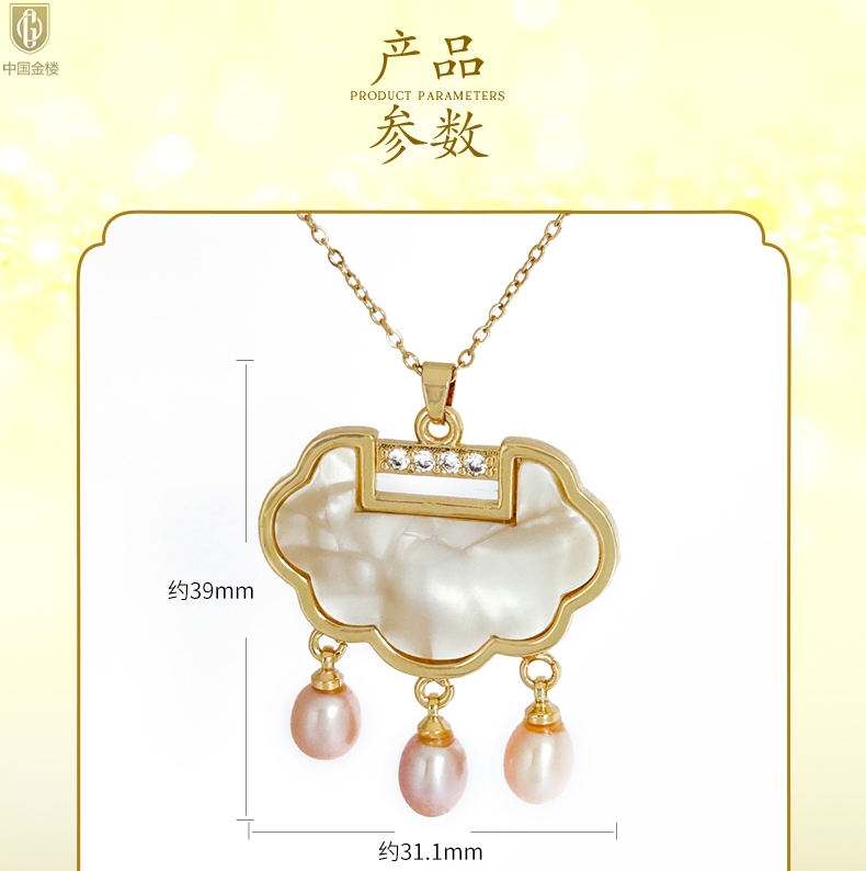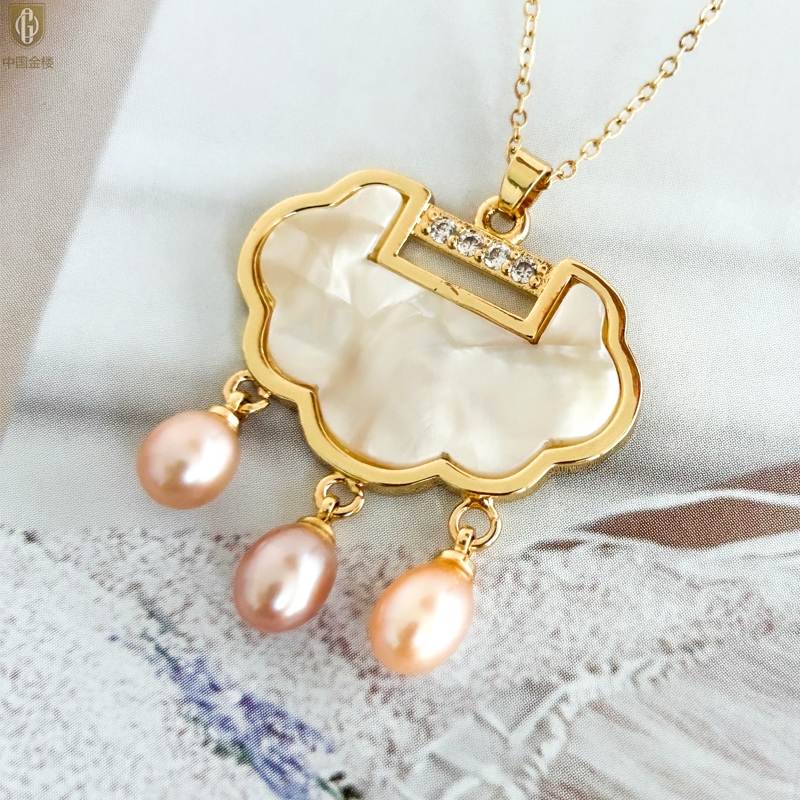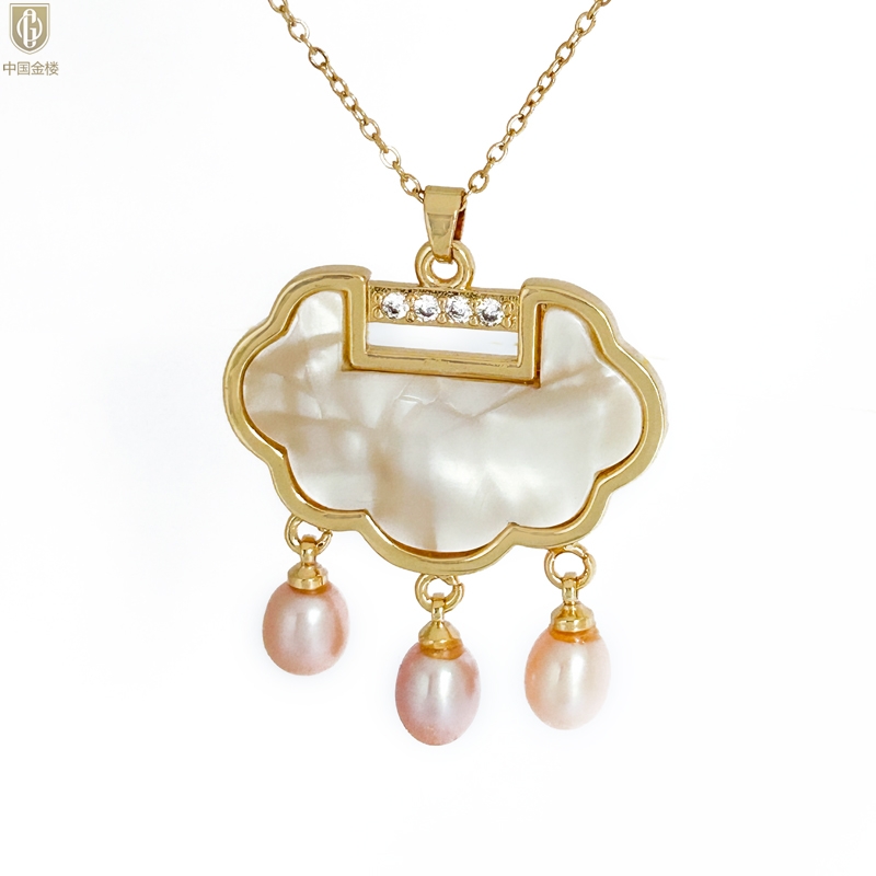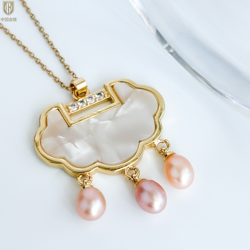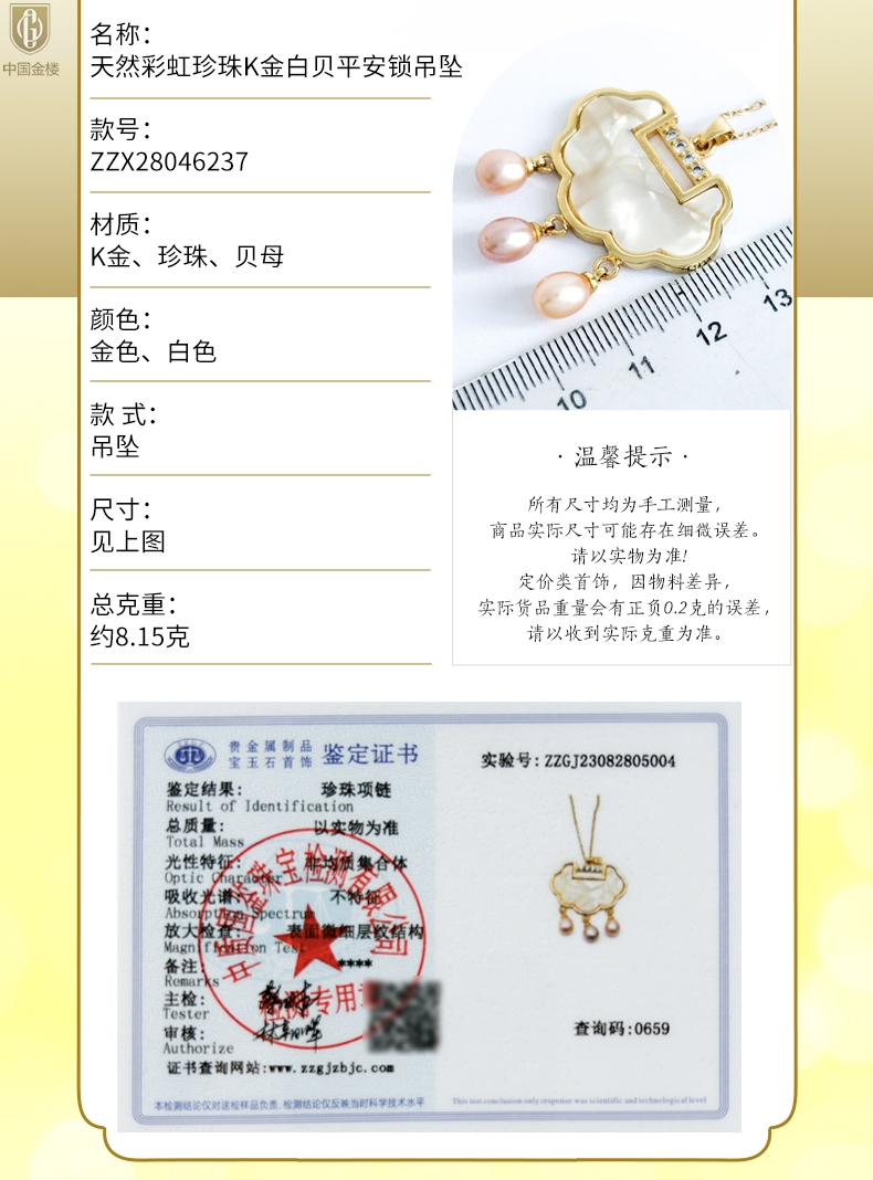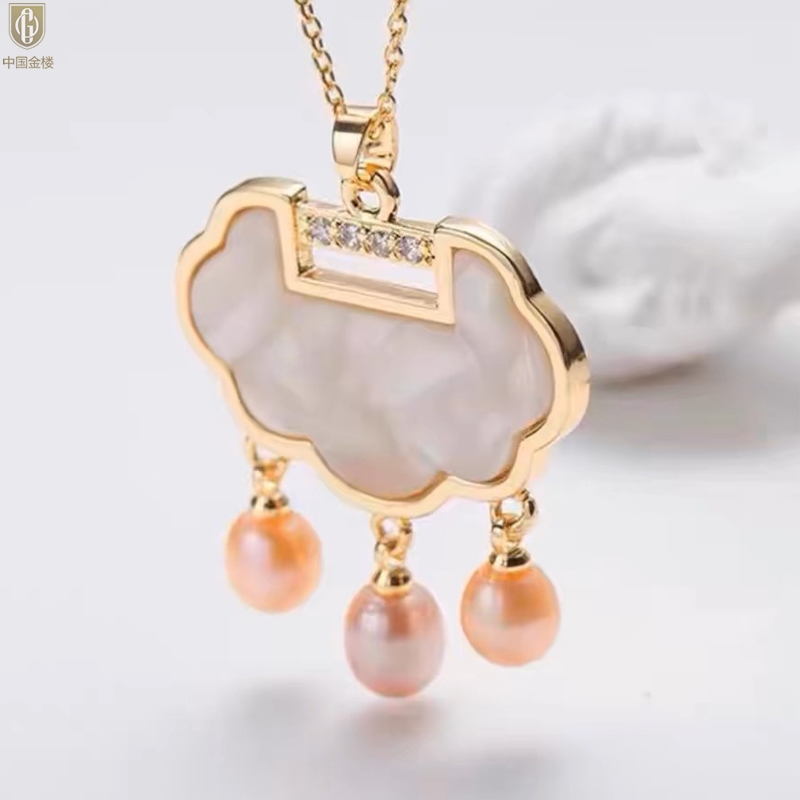 【品名】中国金楼天然彩虹珍珠K金白贝平安锁吊坠(赠K金项链)
