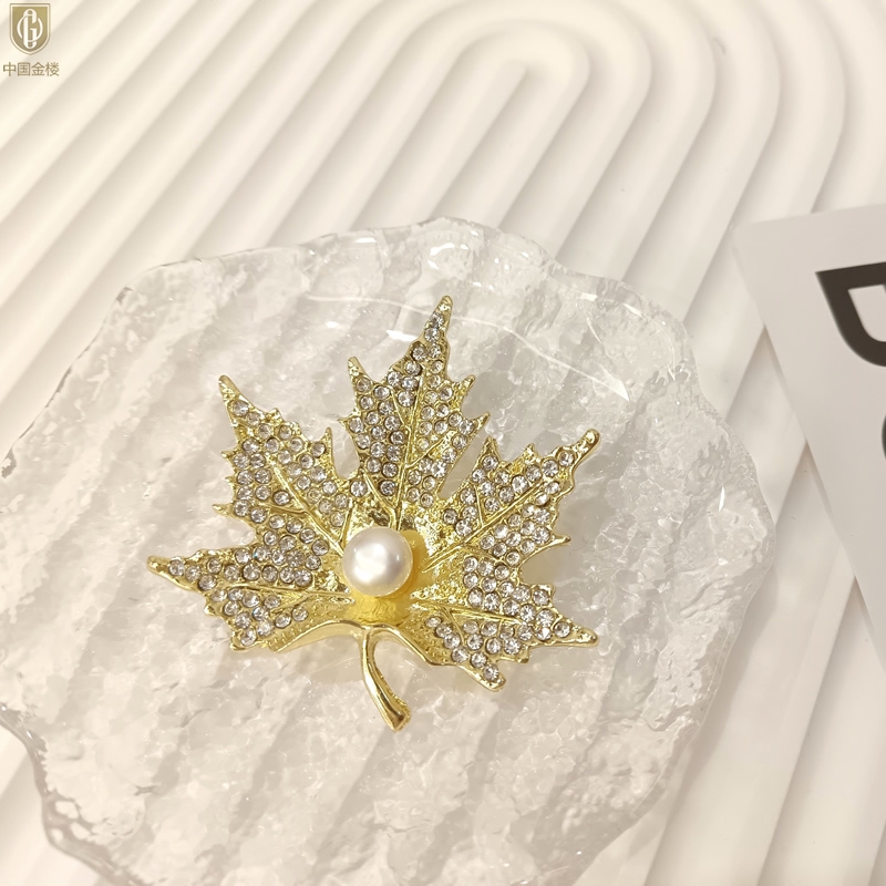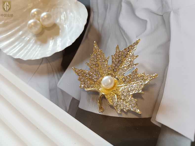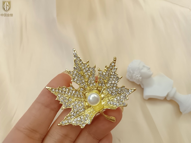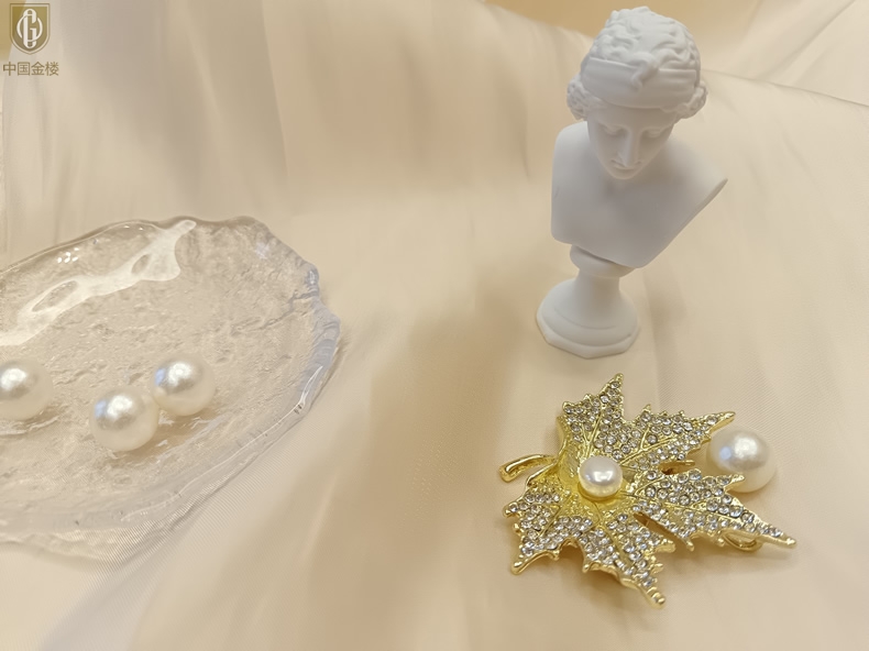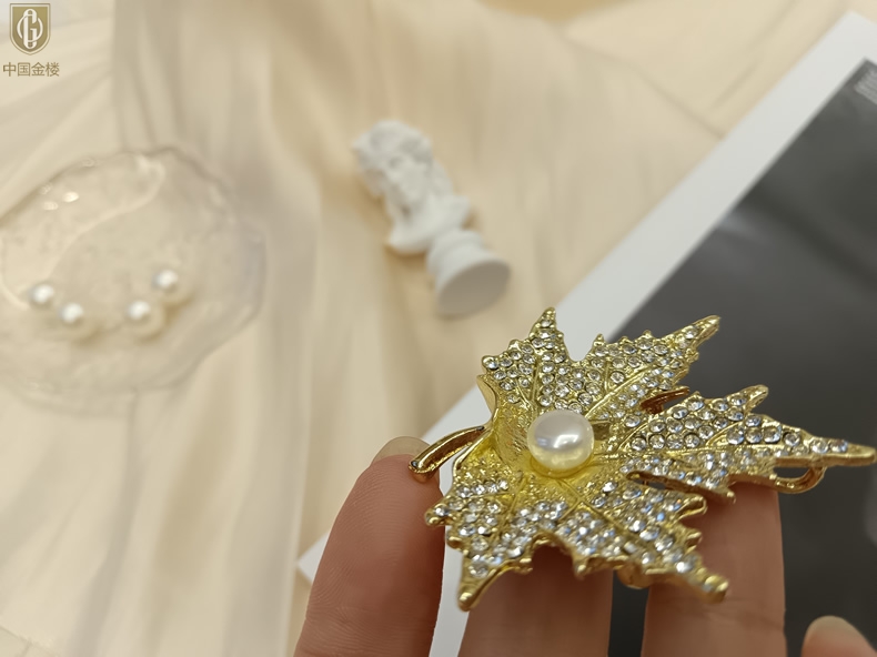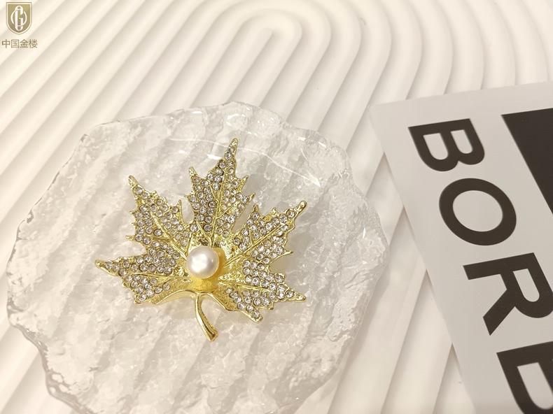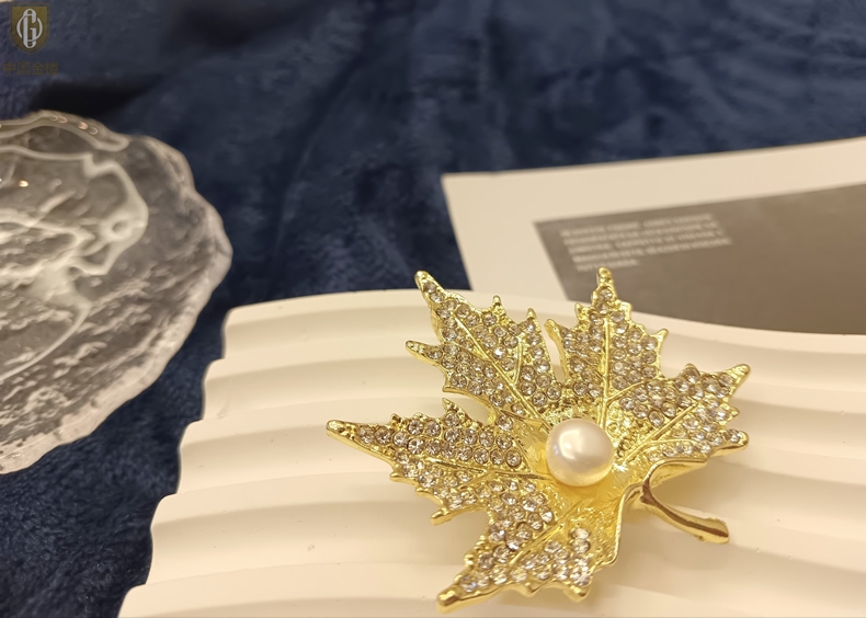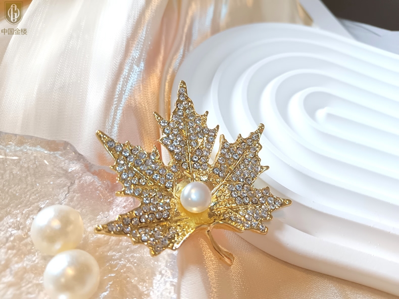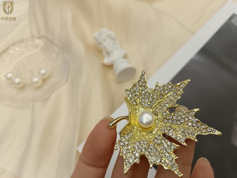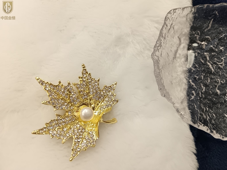 【品名】中国金楼天然珍珠闪钻枫叶胸针