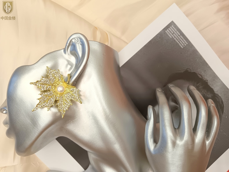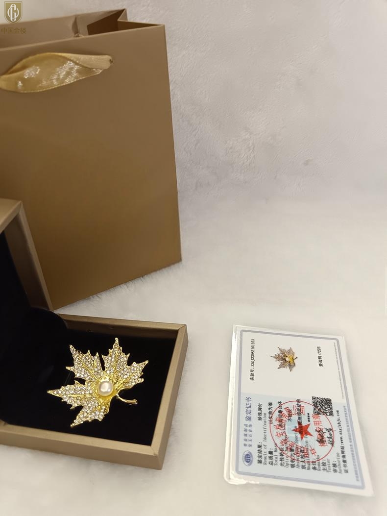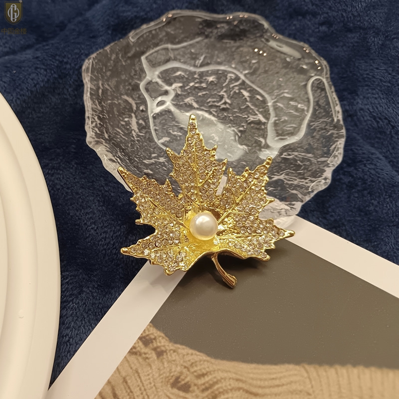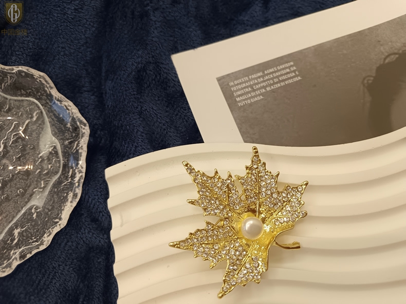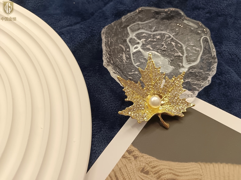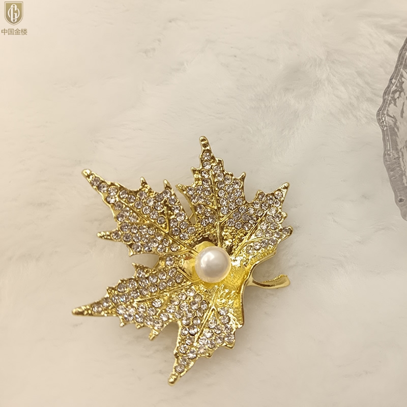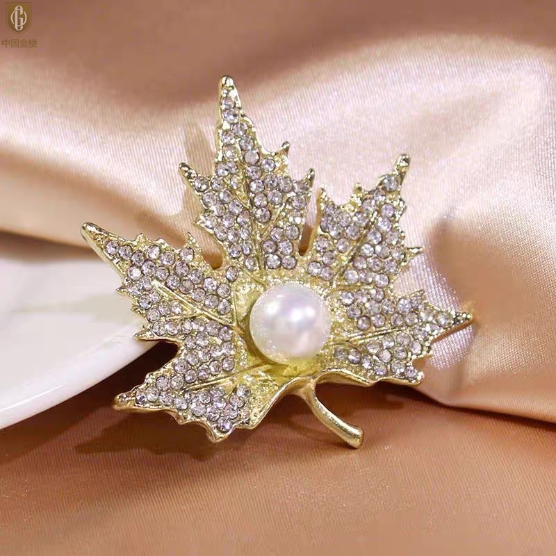 【品名】中国金楼天然珍珠闪钻枫叶胸针