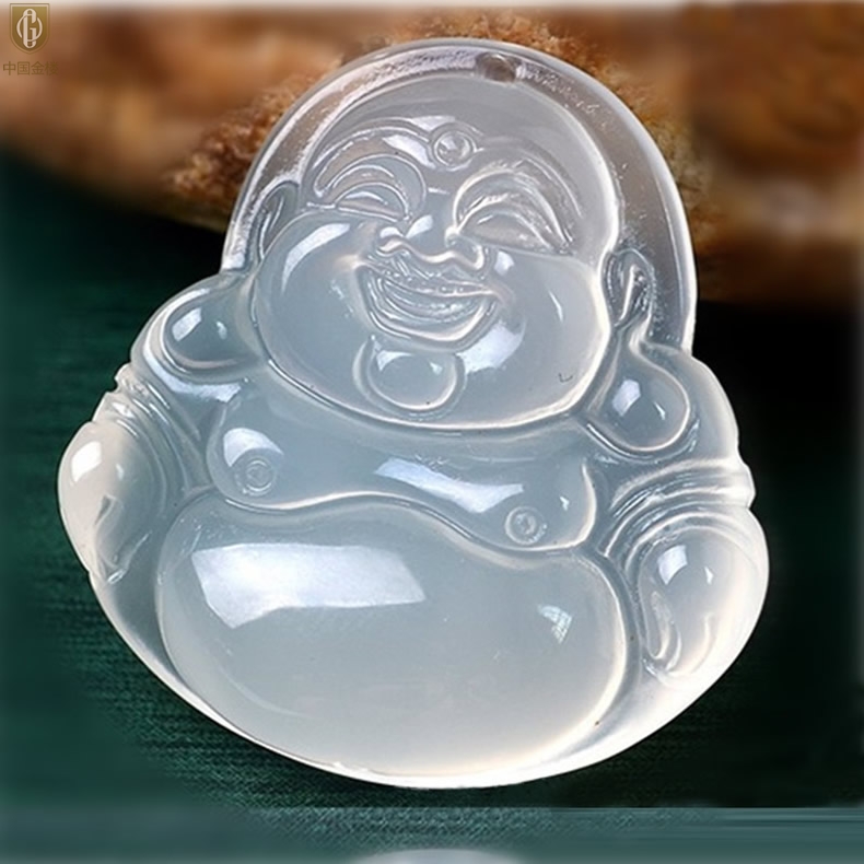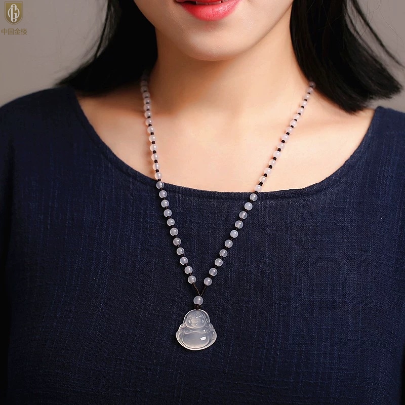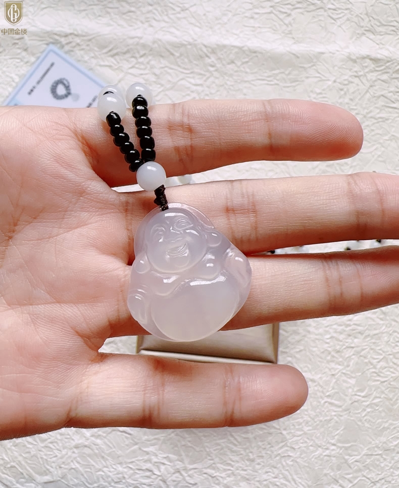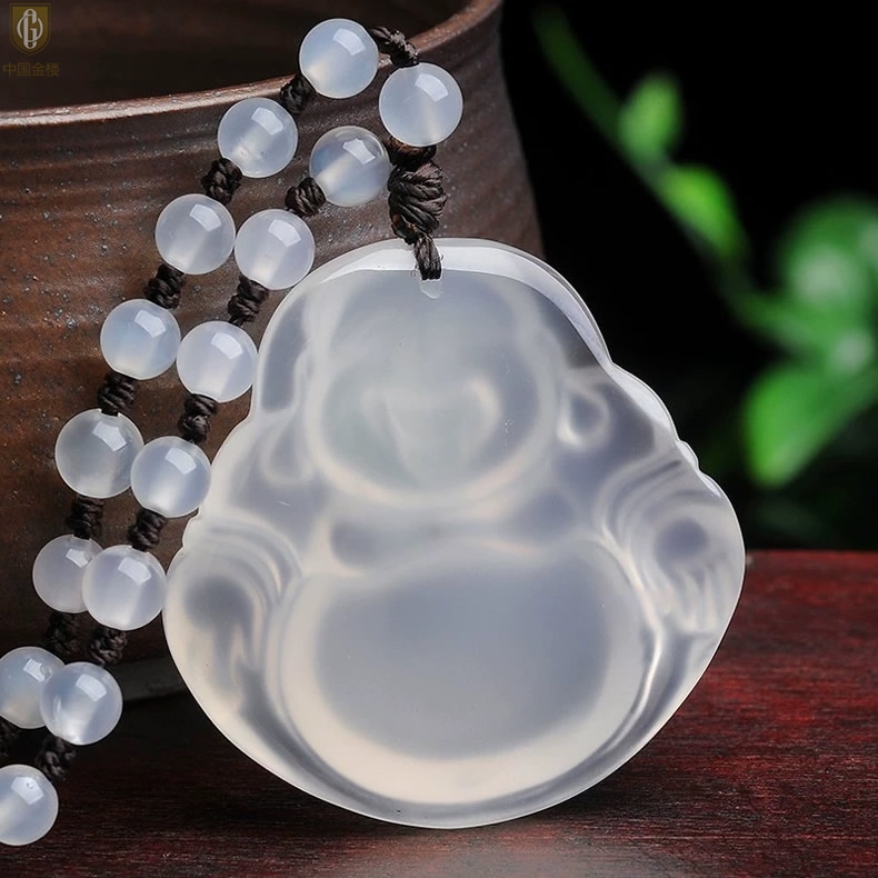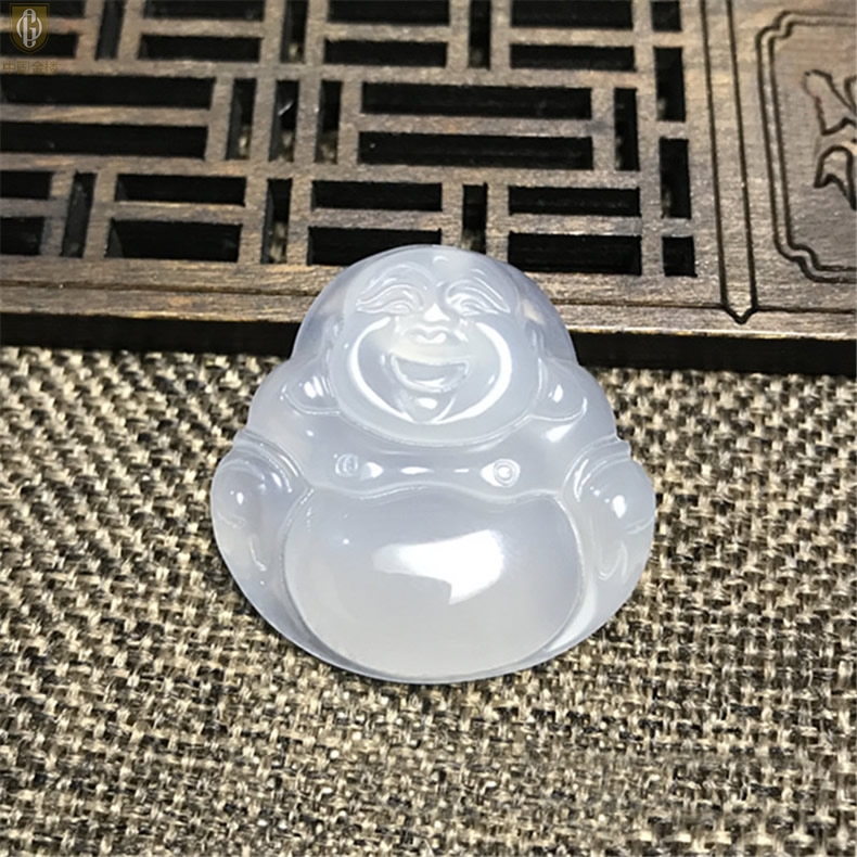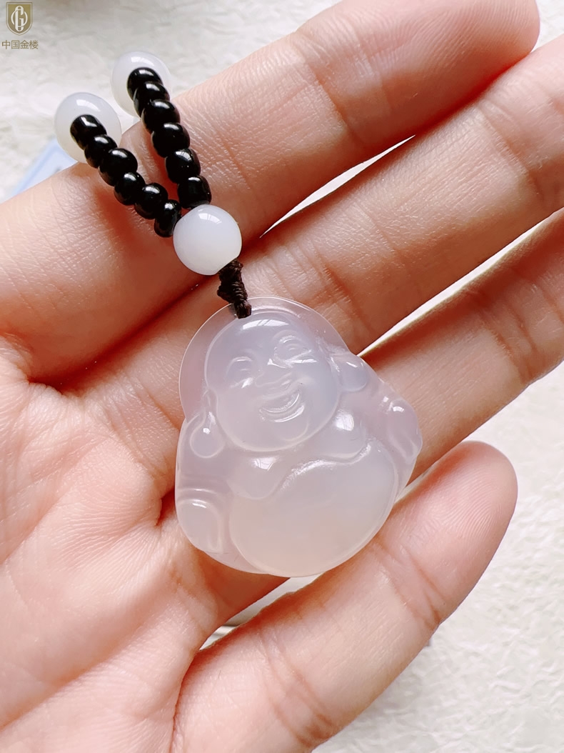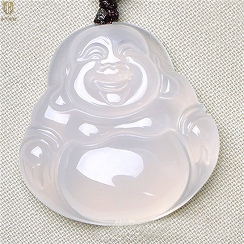 【品名】中国金楼巴西高冰玉髓弥勒笑佛吊坠(附赠汉白玉毛衣链)