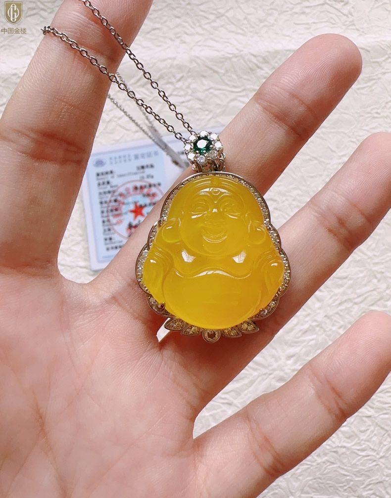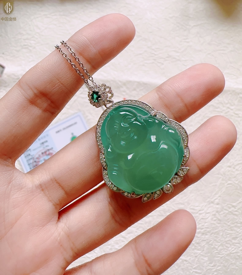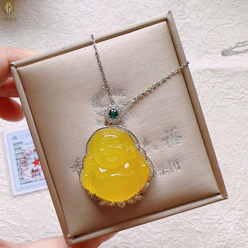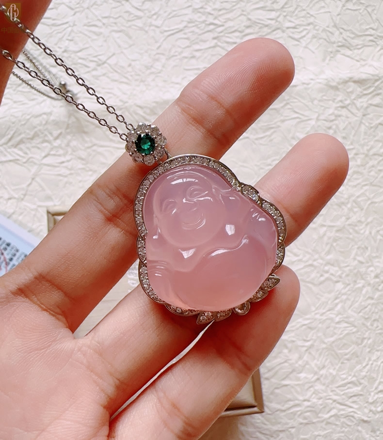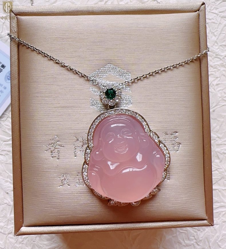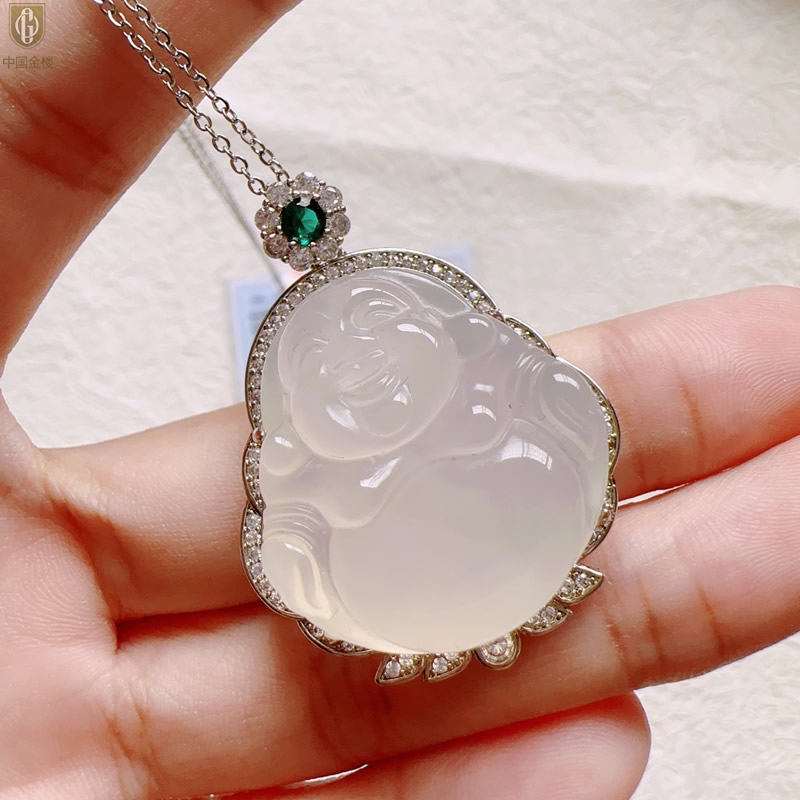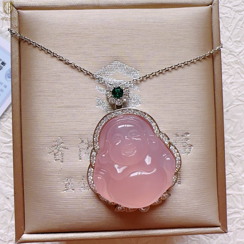 【品名】中国金楼巴西高冰玉髓豪镶满钻弥勒笑佛吊坠