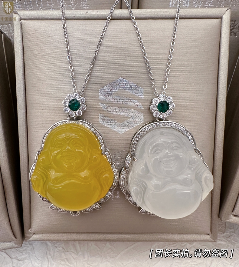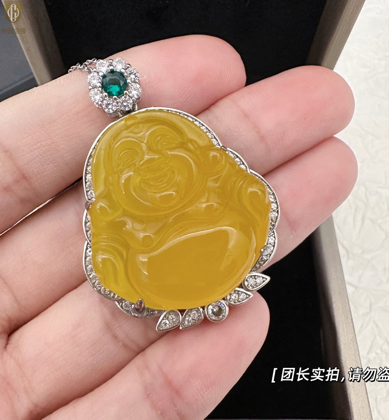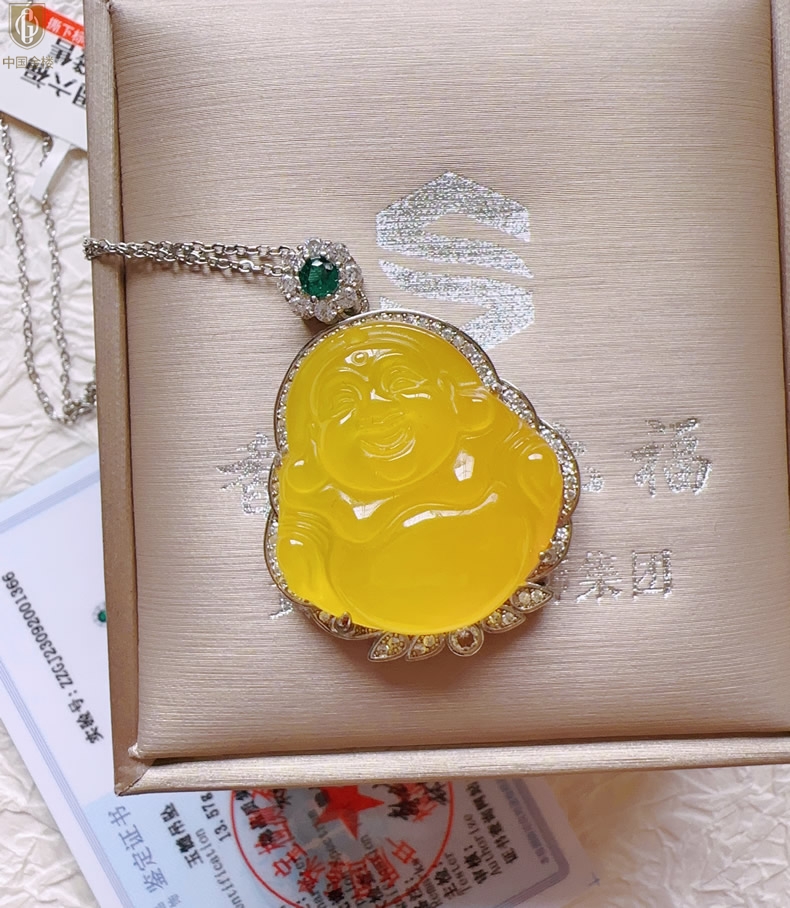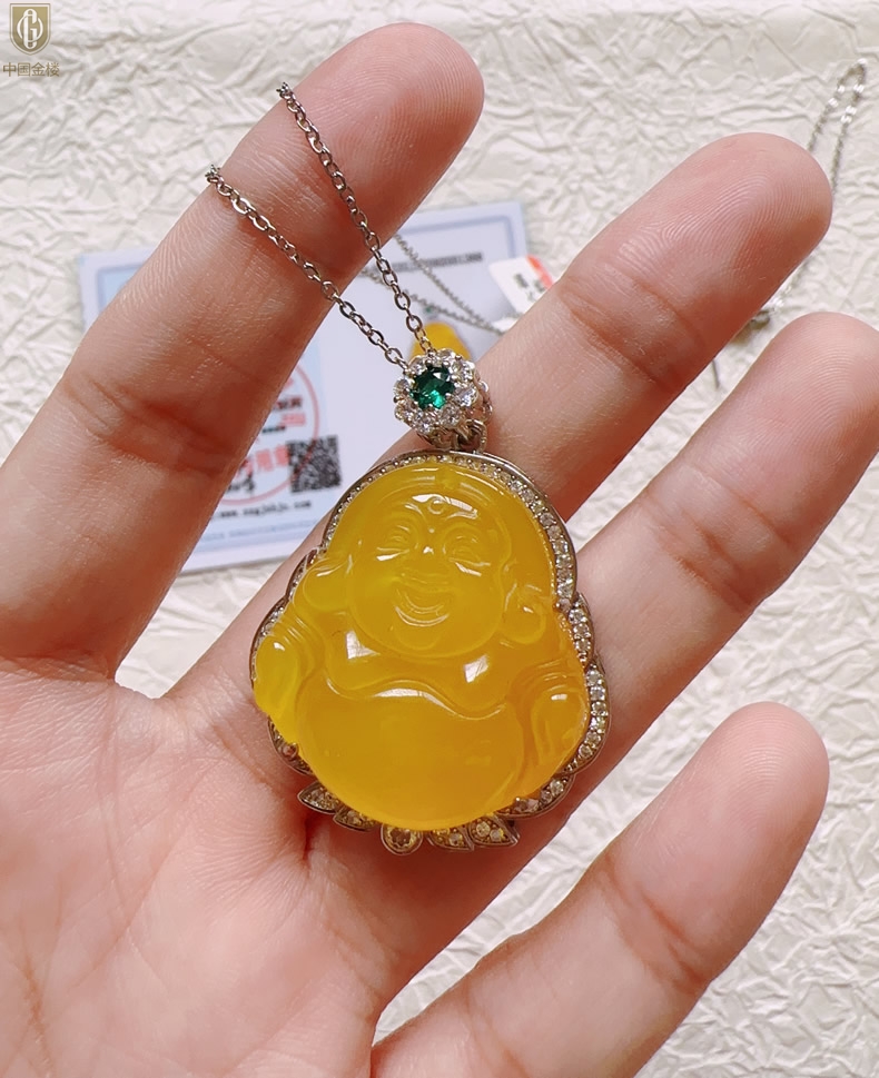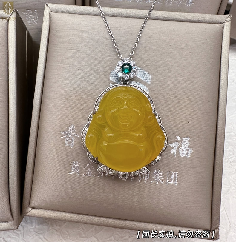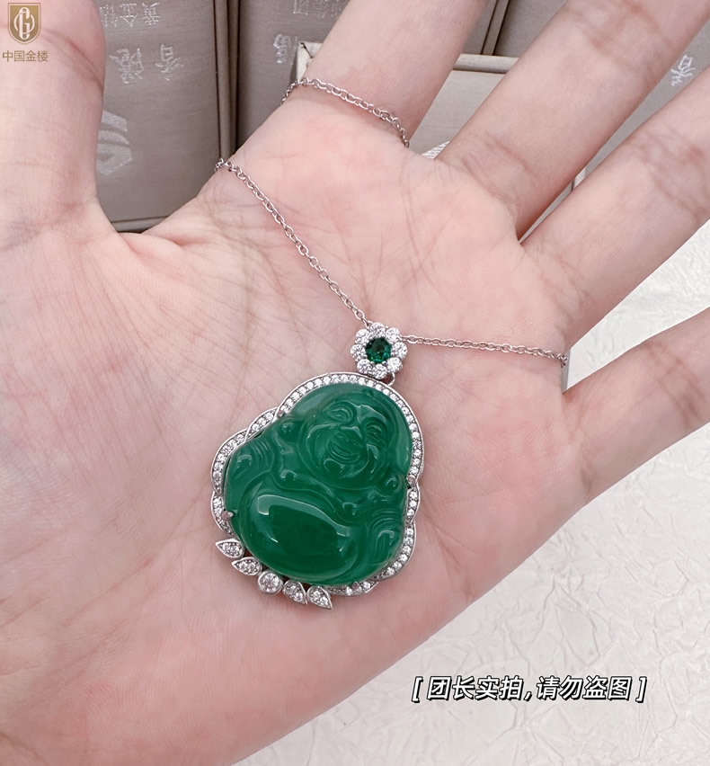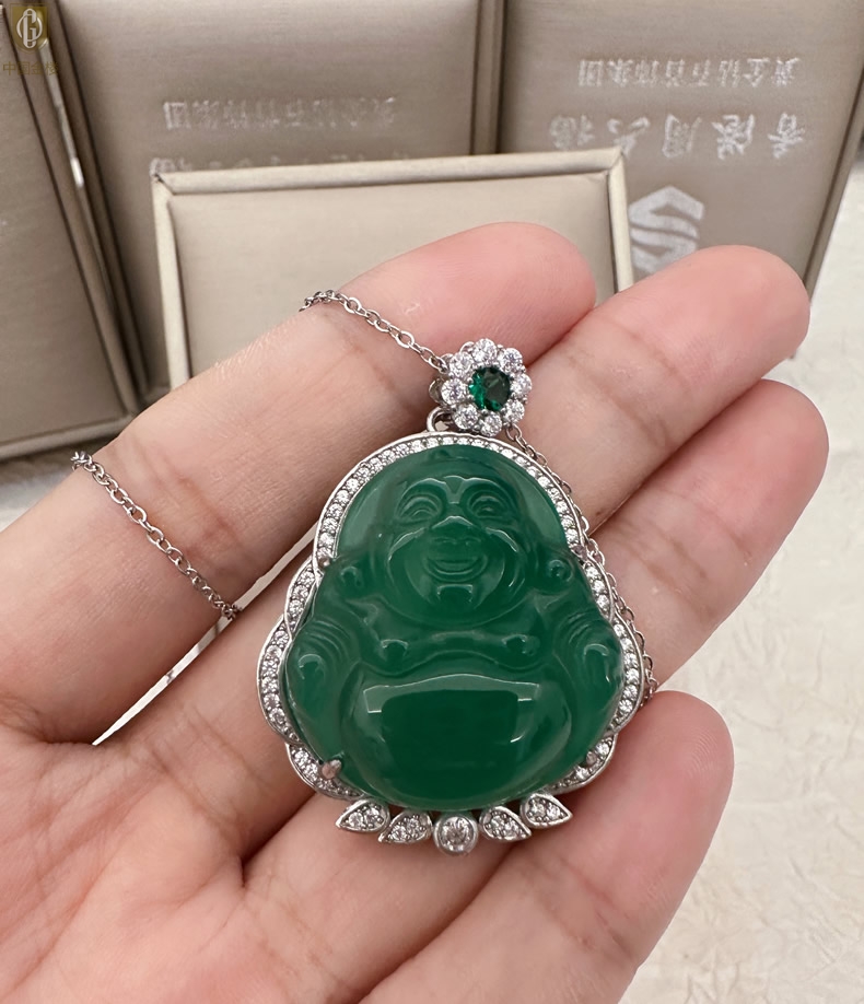 【品名】中国金楼巴西高冰玉髓豪镶满钻弥勒笑佛吊坠