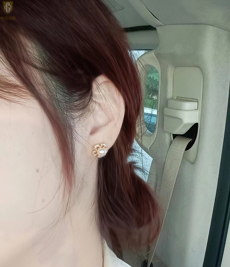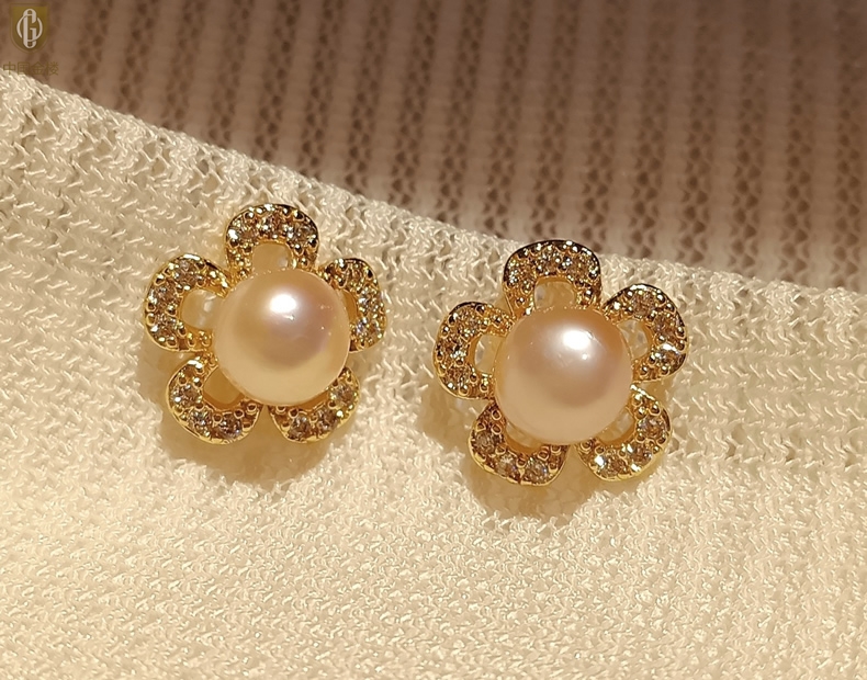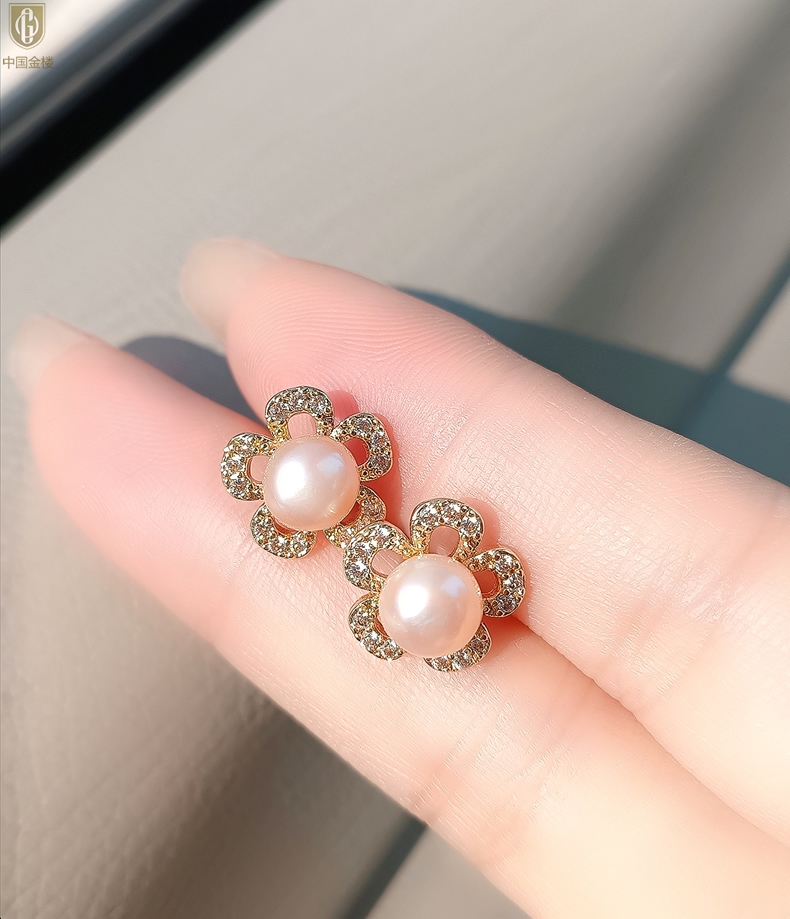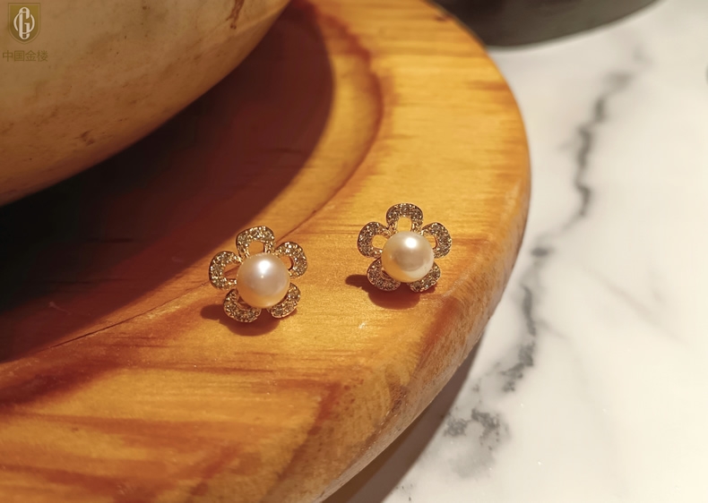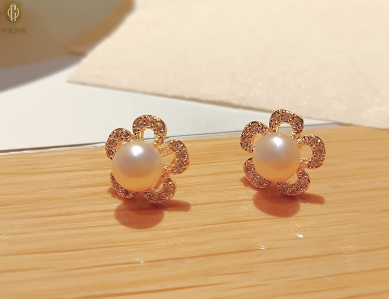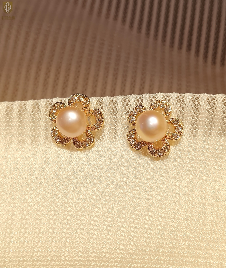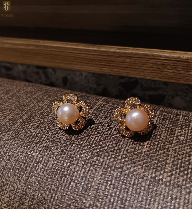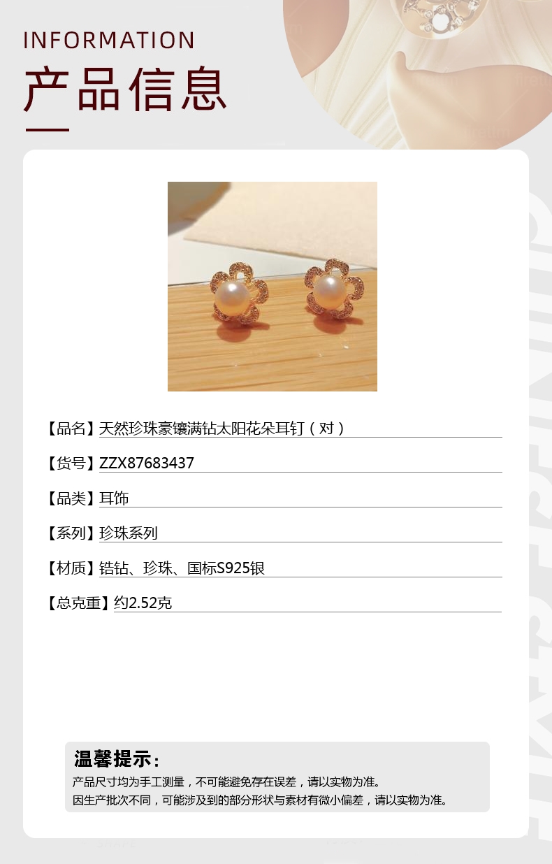 【品名】中国金楼天然珍珠豪镶满钻太阳花朵耳钉(对)