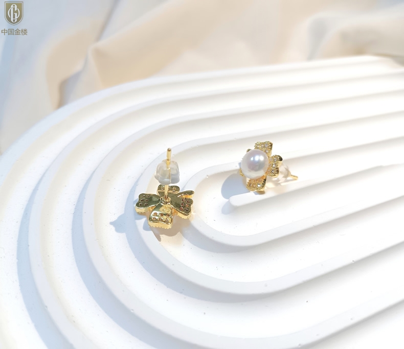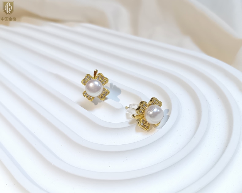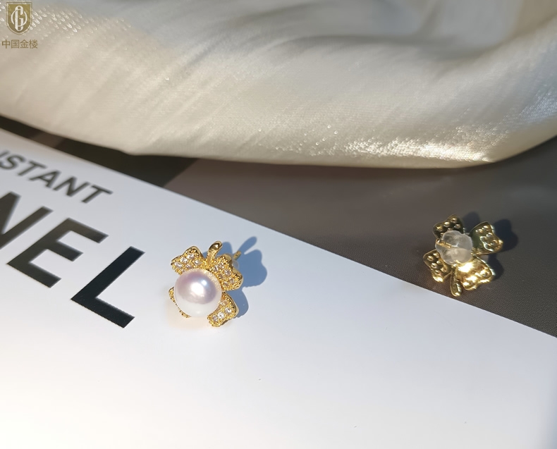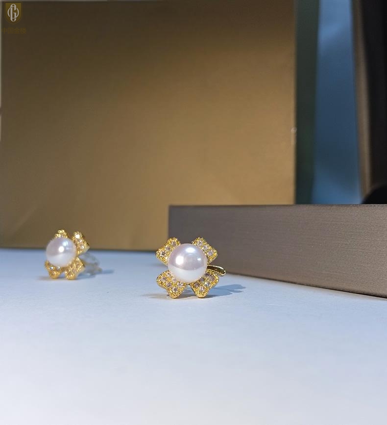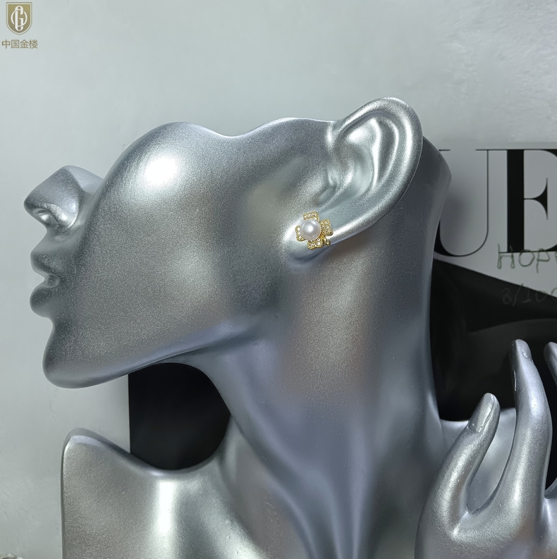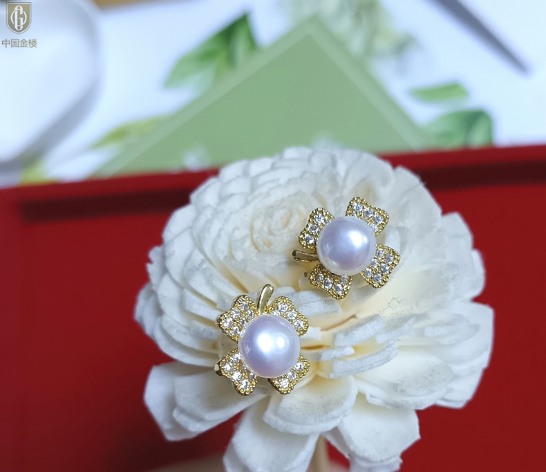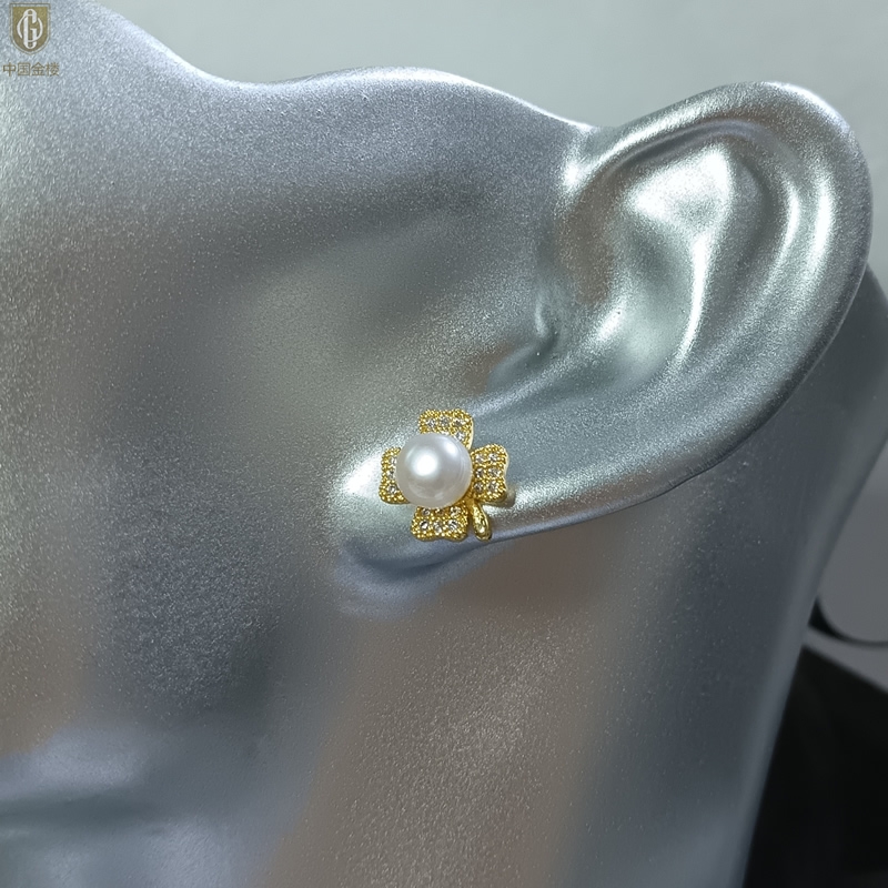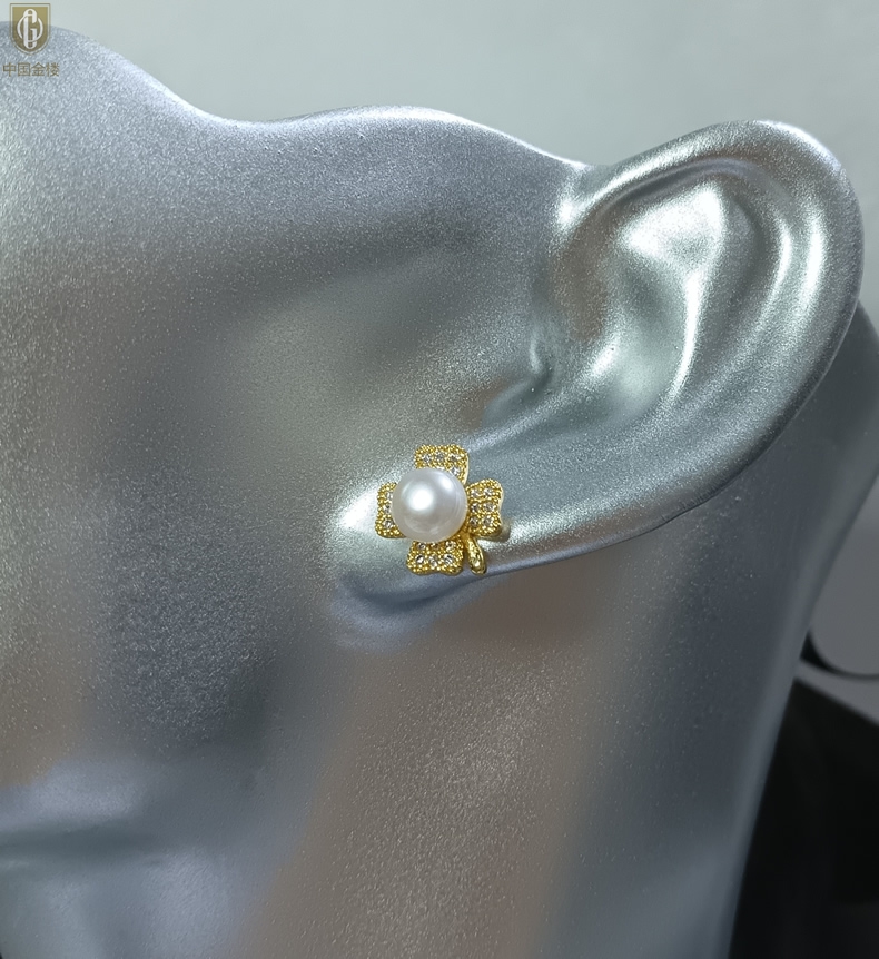 【品名】中国金楼天然珍珠豪镶满钻云南花耳钉(对)