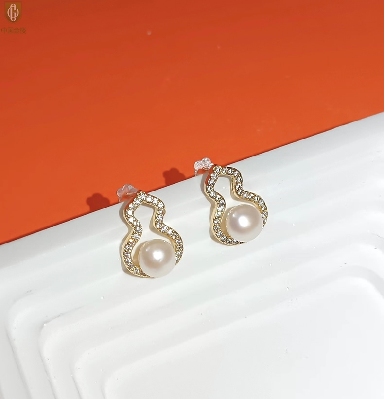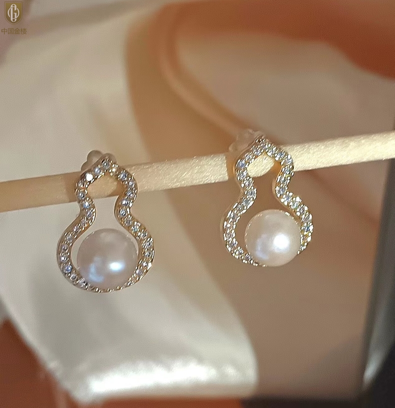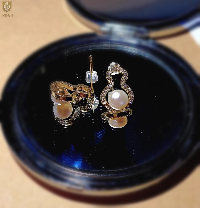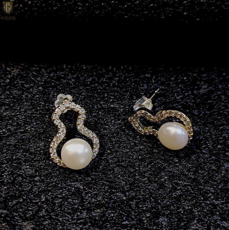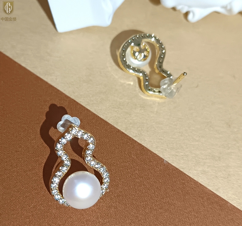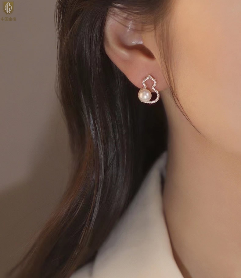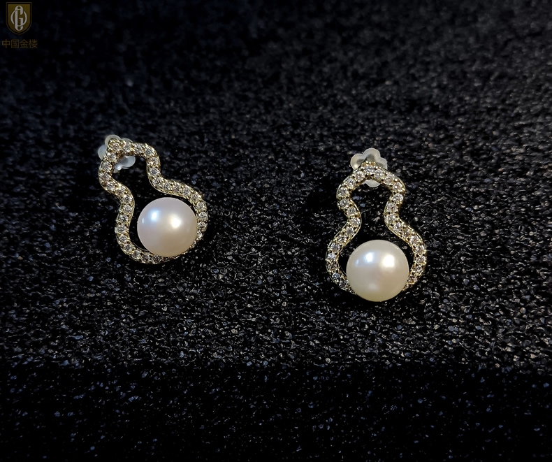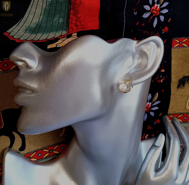 【品名】中国金楼天然珍珠豪镶满钻福禄耳钉(对)