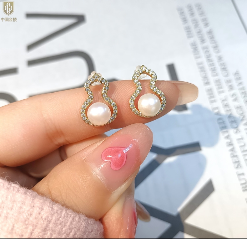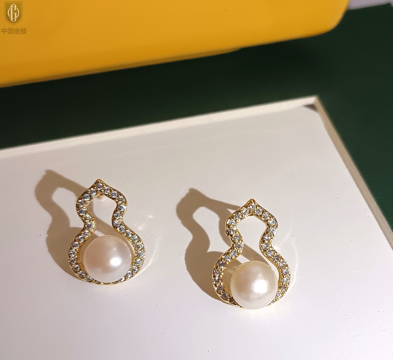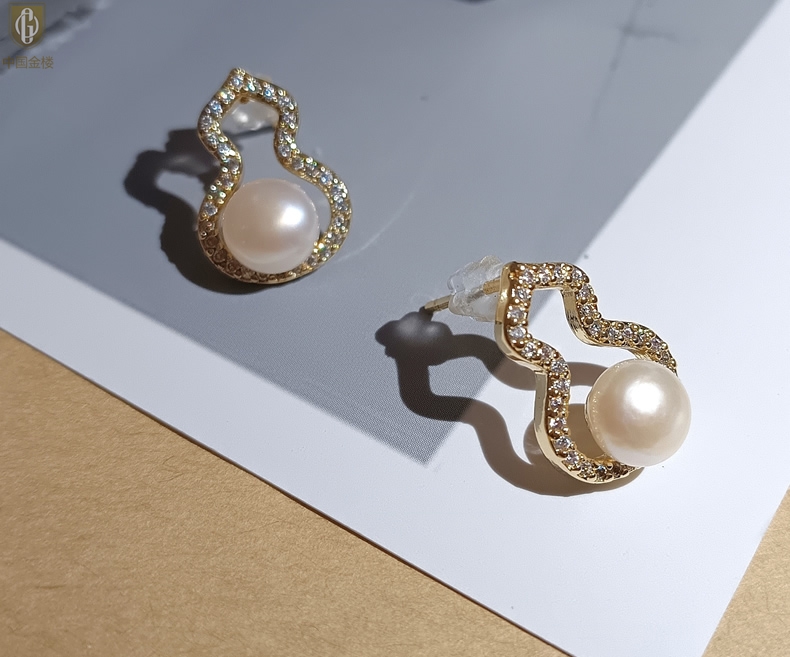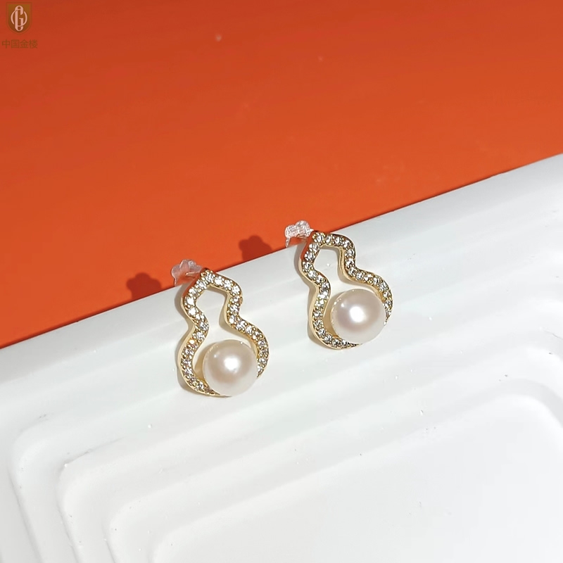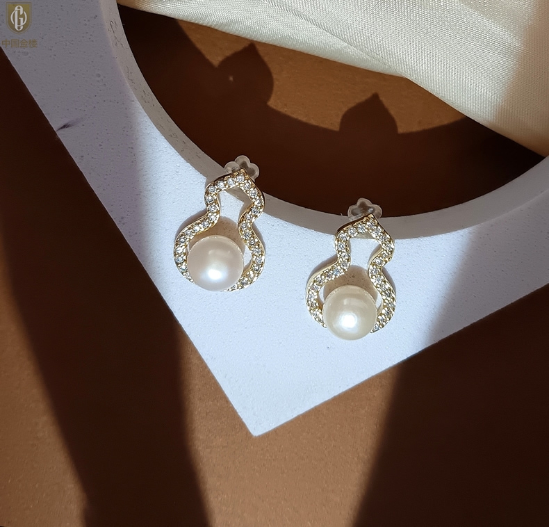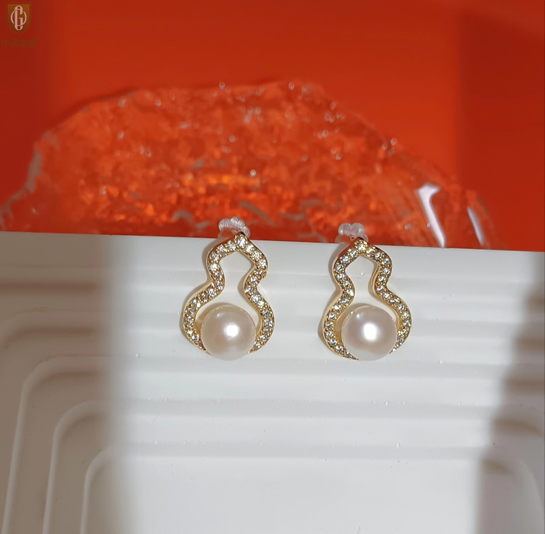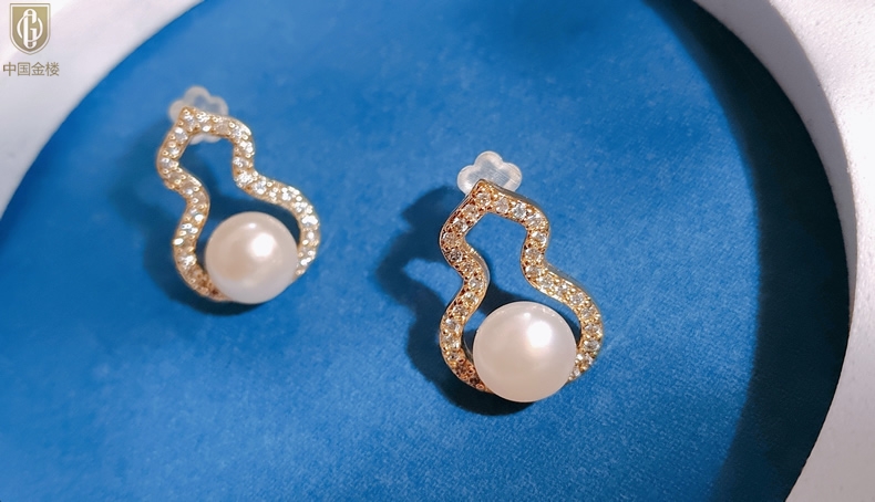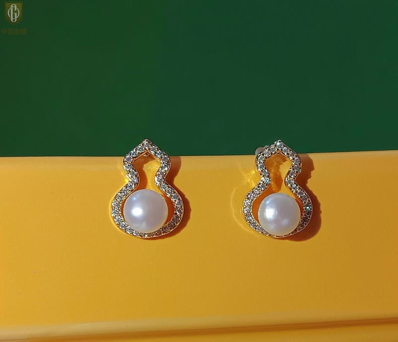 【品名】中国金楼天然珍珠豪镶满钻福禄耳钉(对)