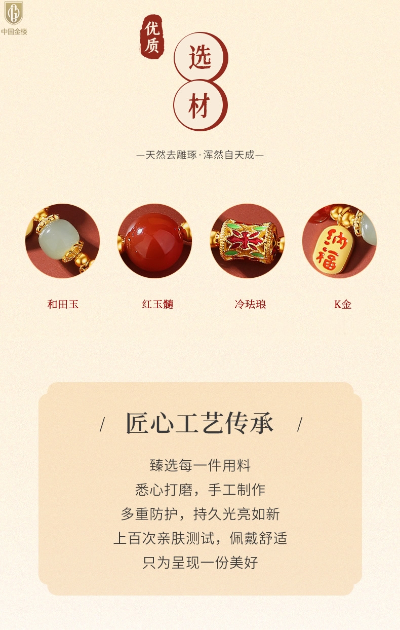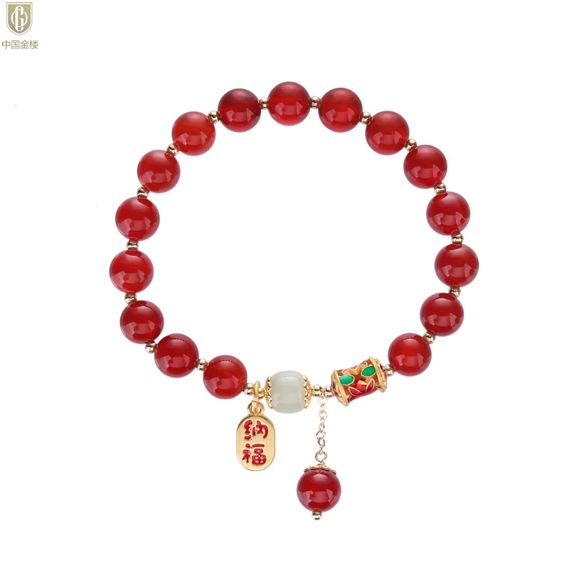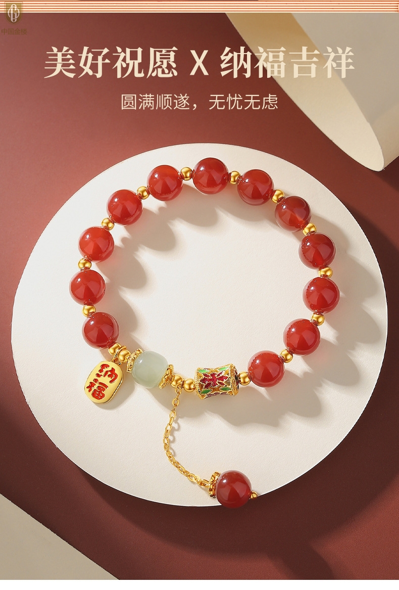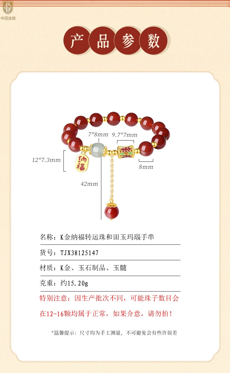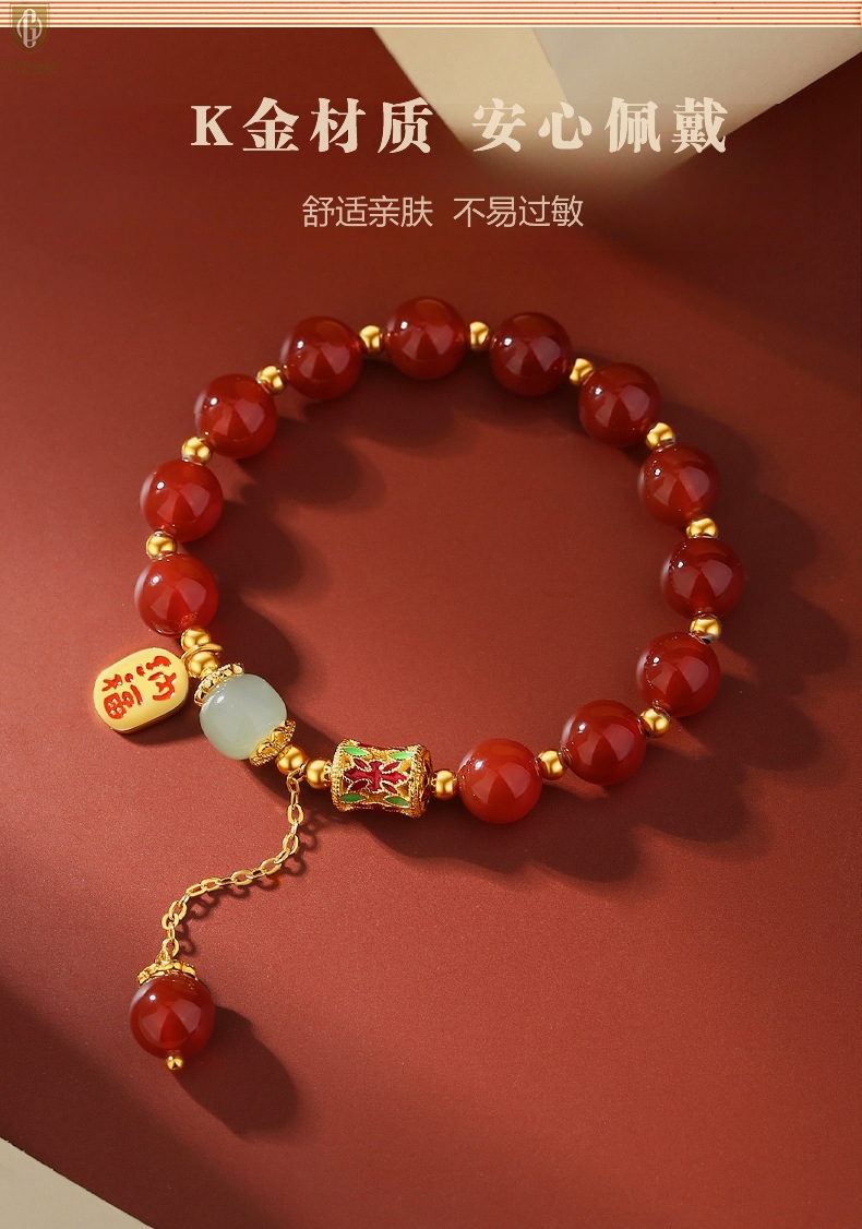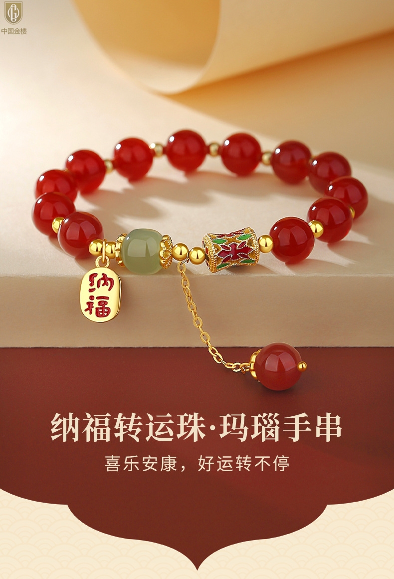 【品名】中国金楼K金纳福转运珠和田玉玛瑙手串
