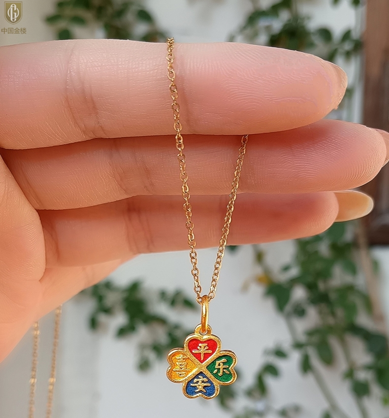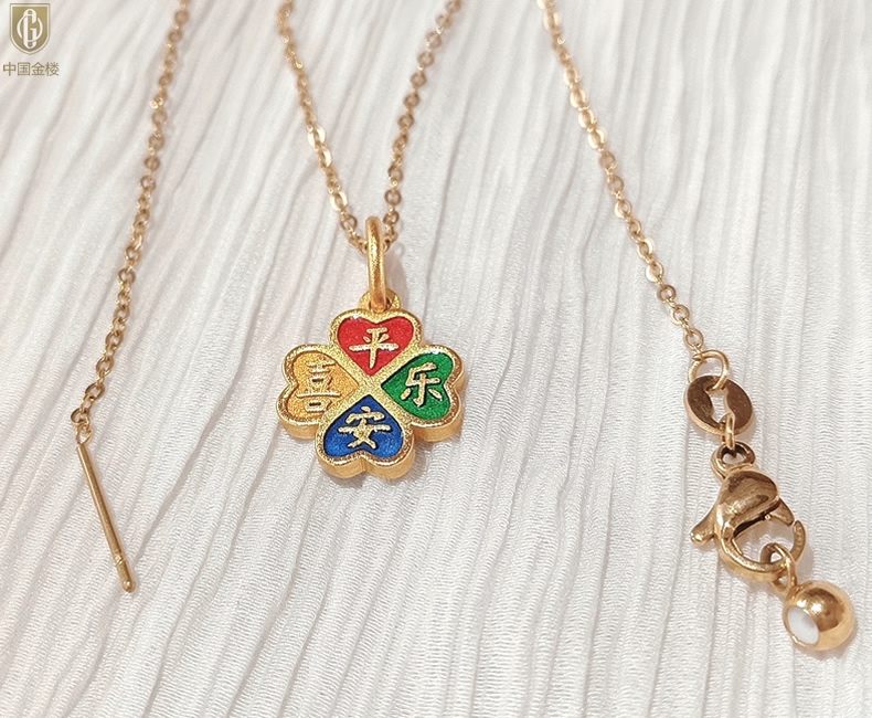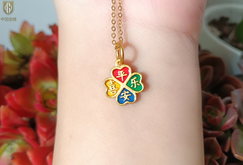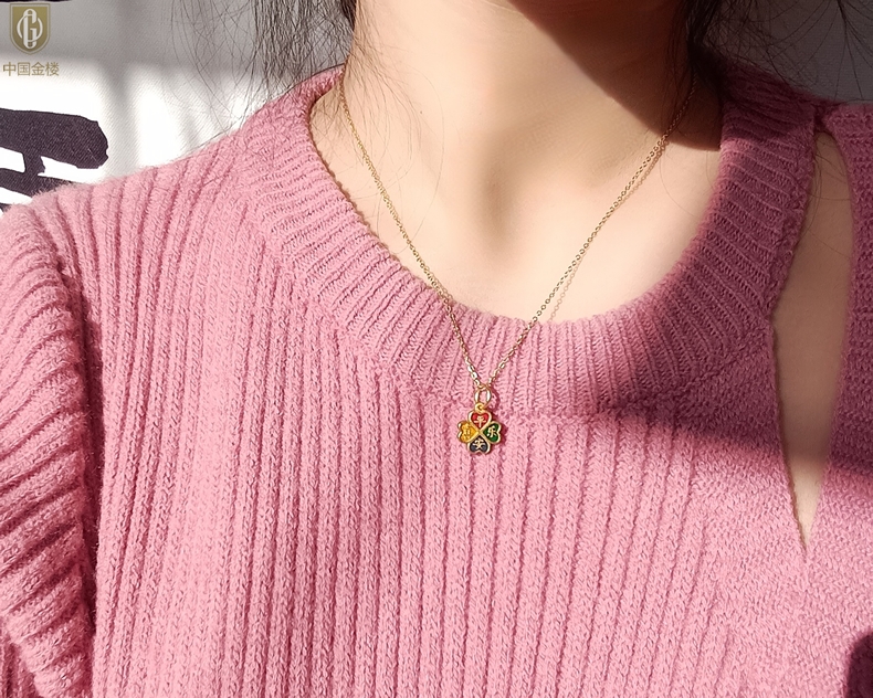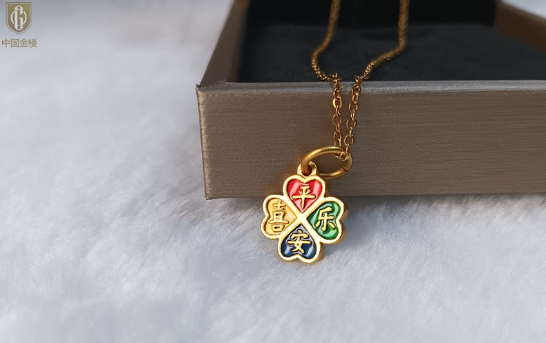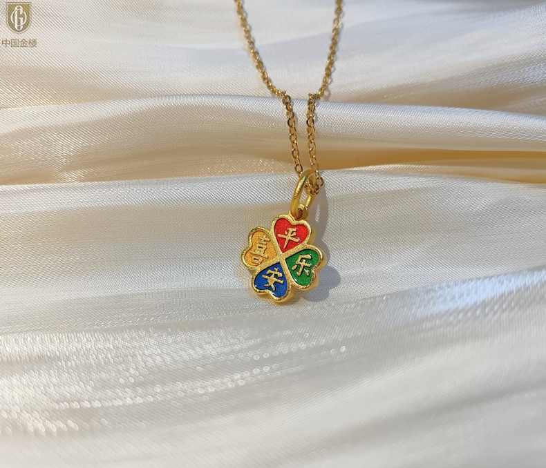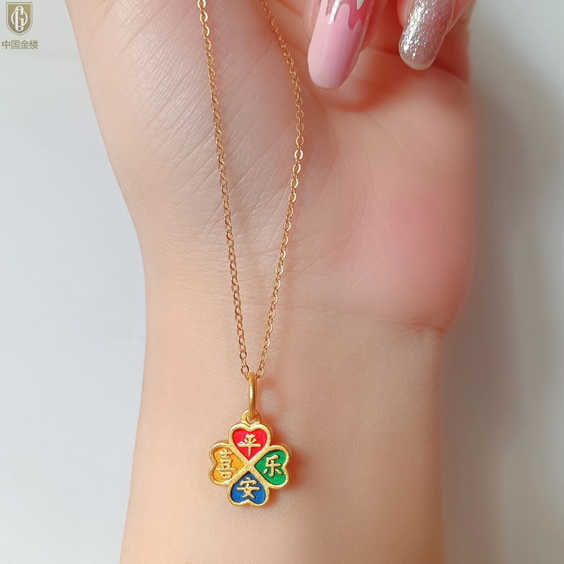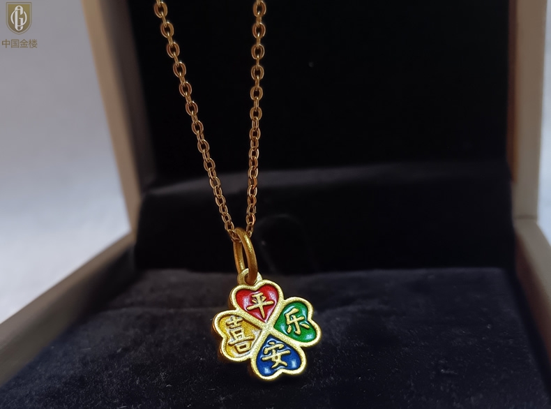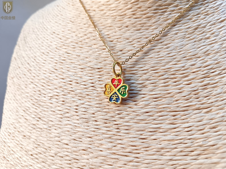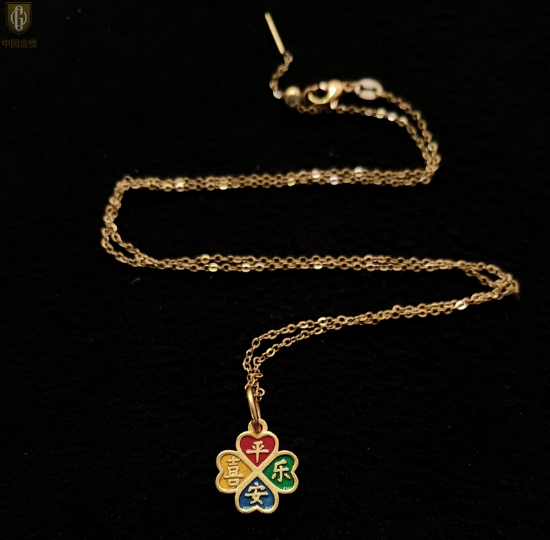 【品名】中国金楼K金珐琅手绘平安喜乐四叶草吊坠(附赠K金项链)