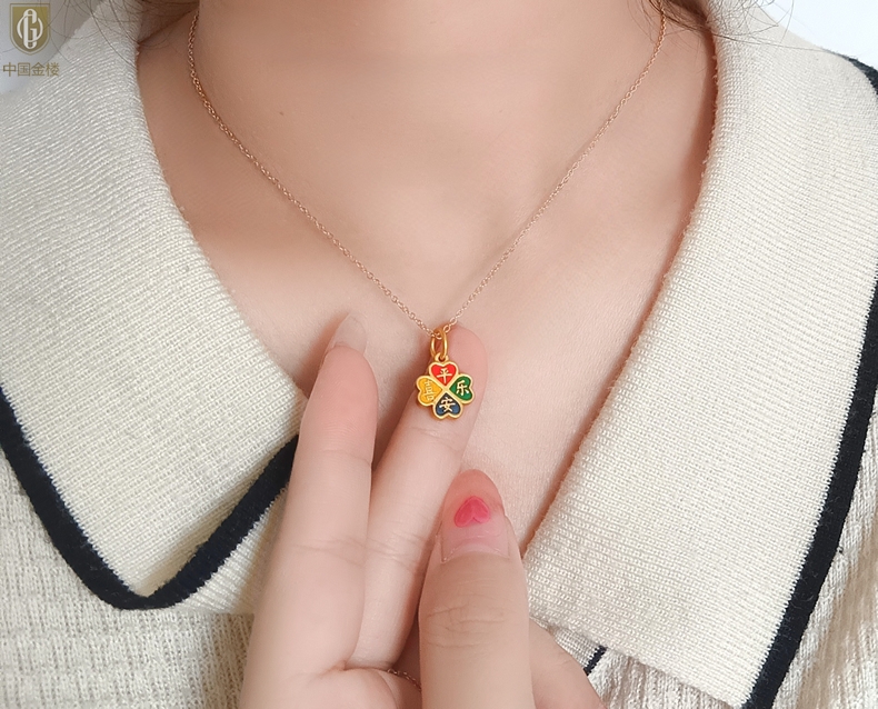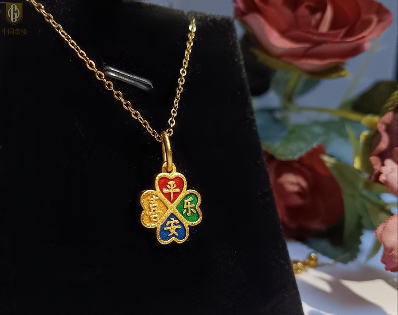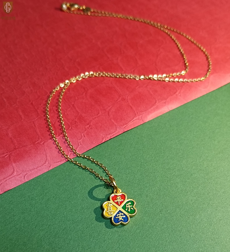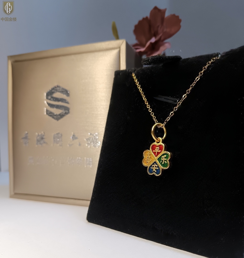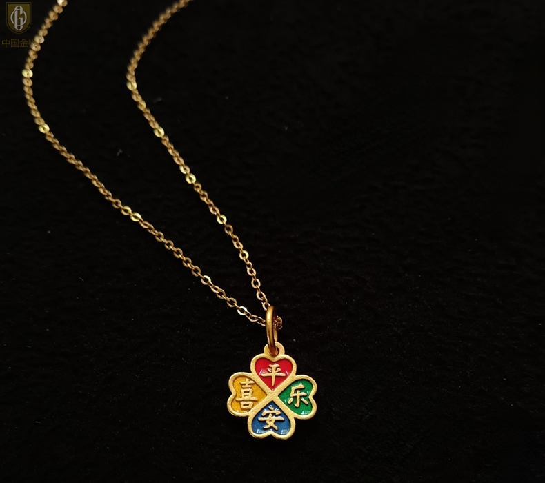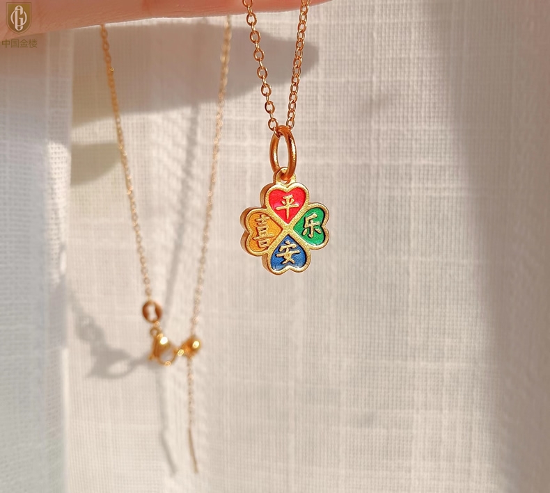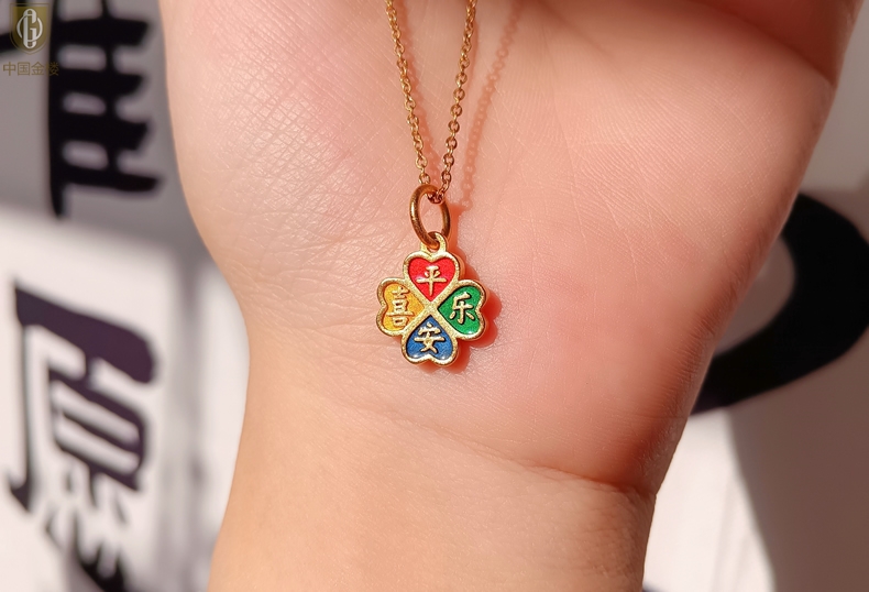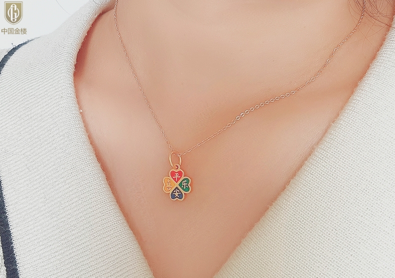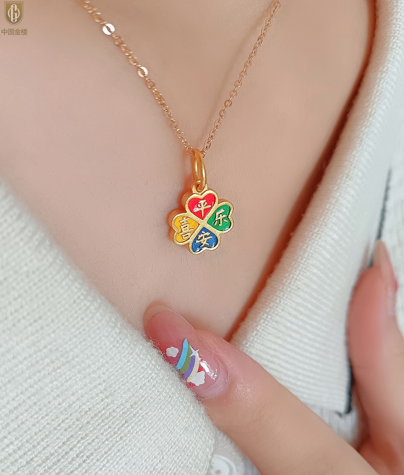 【品名】中国金楼K金珐琅手绘平安喜乐四叶草吊坠(附赠K金项链)
