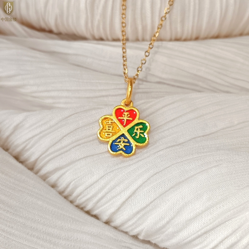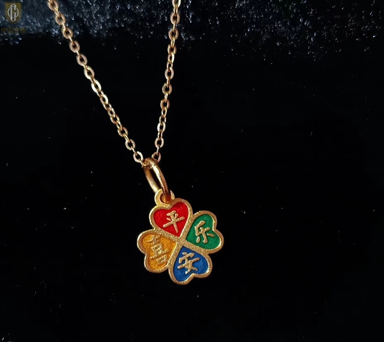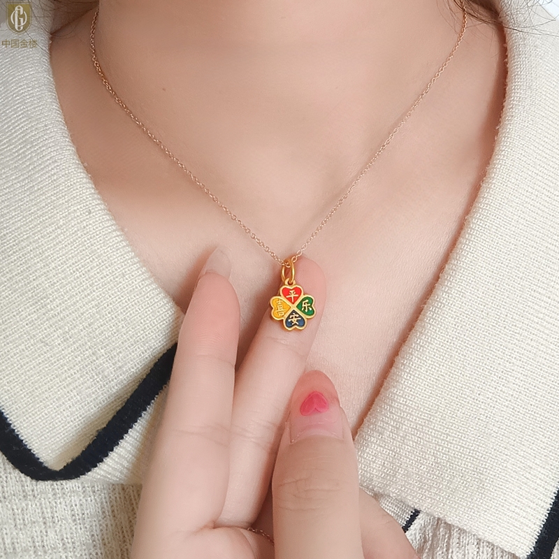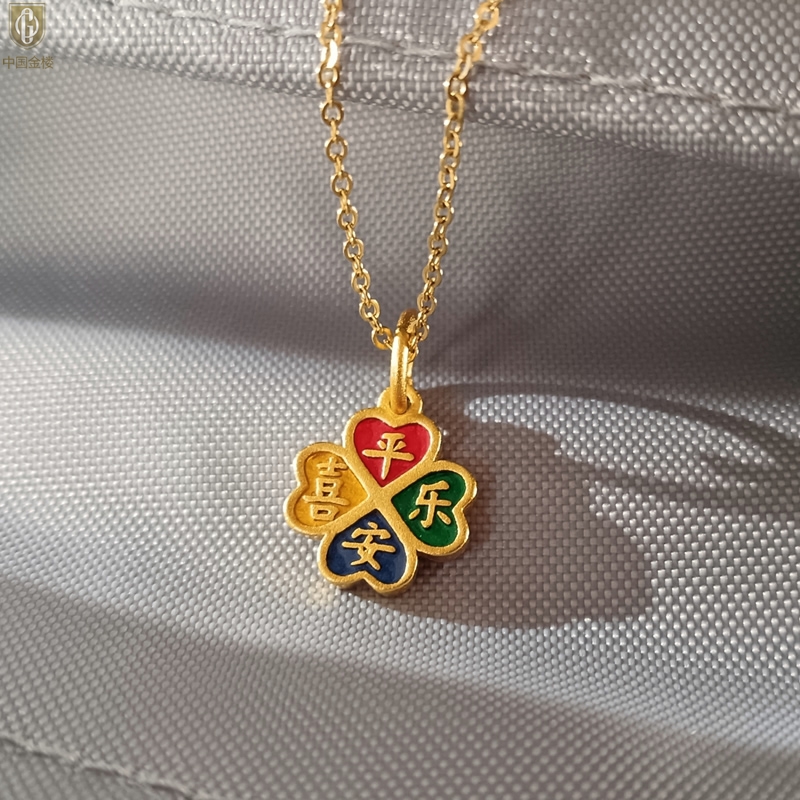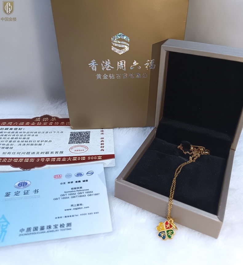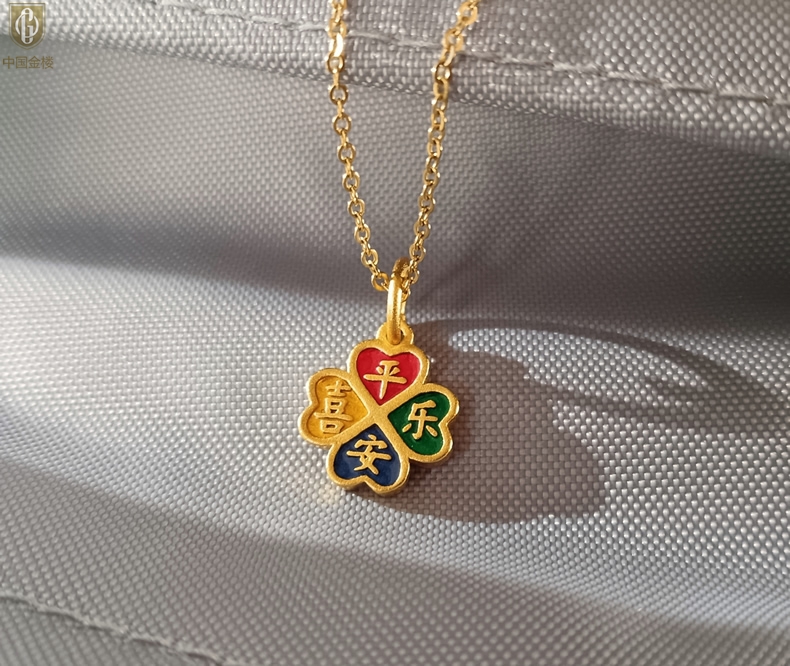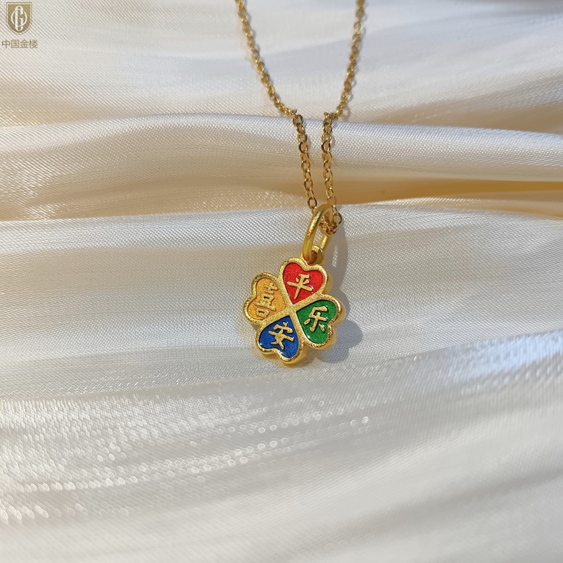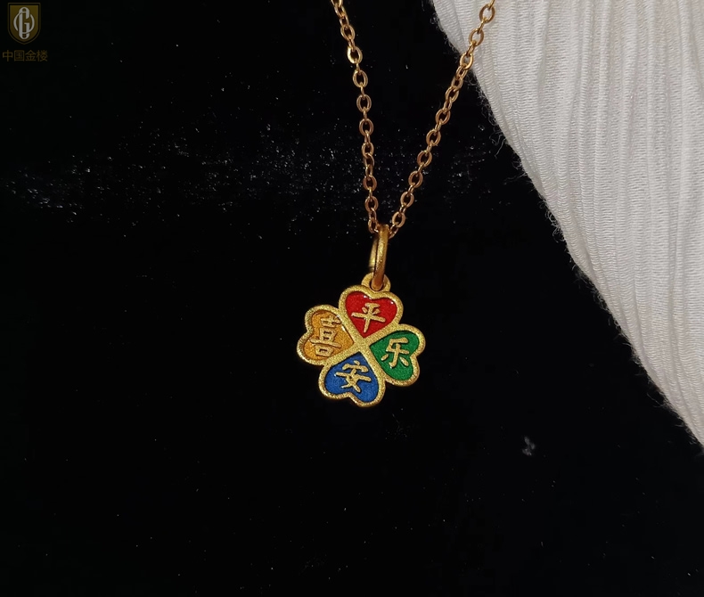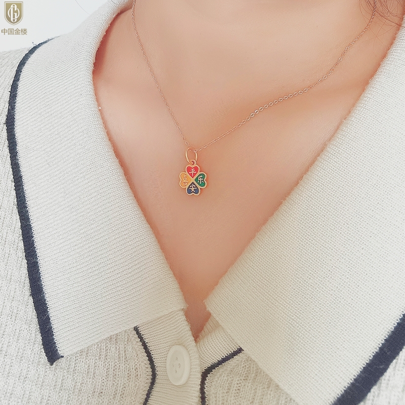 【品名】中国金楼K金珐琅手绘平安喜乐四叶草吊坠(附赠K金项链)