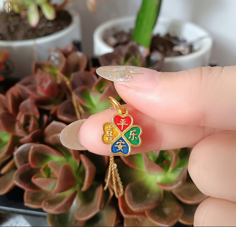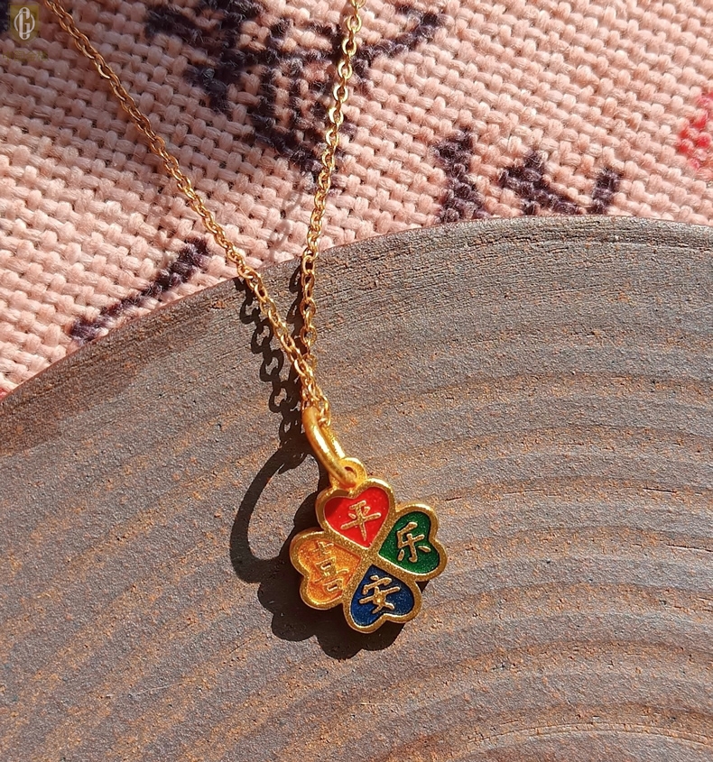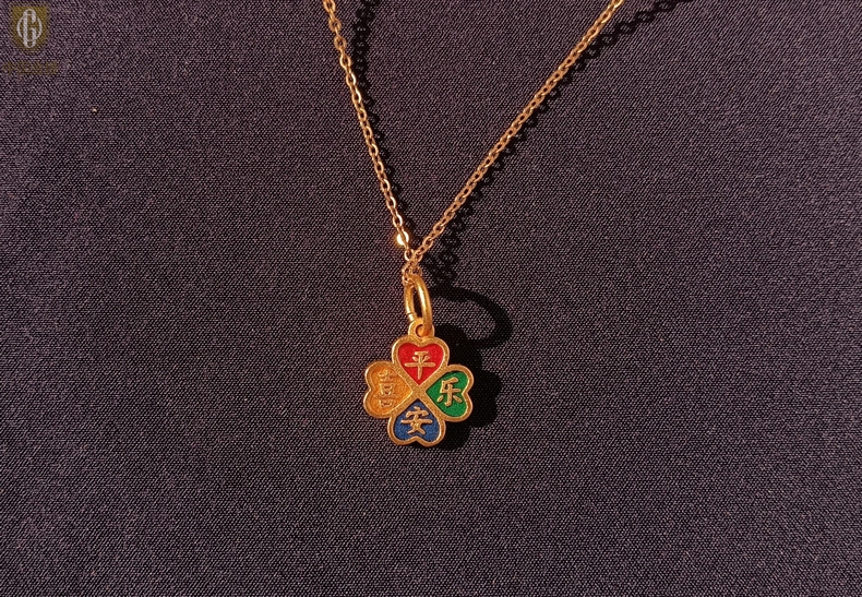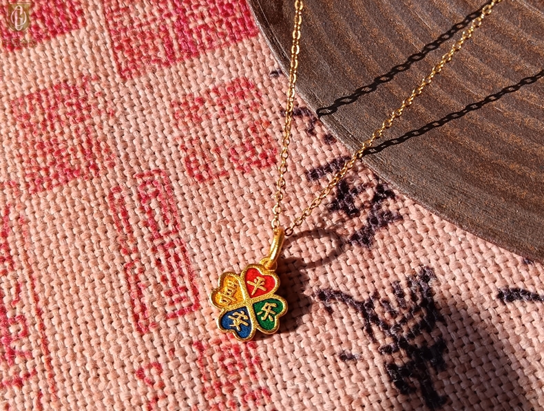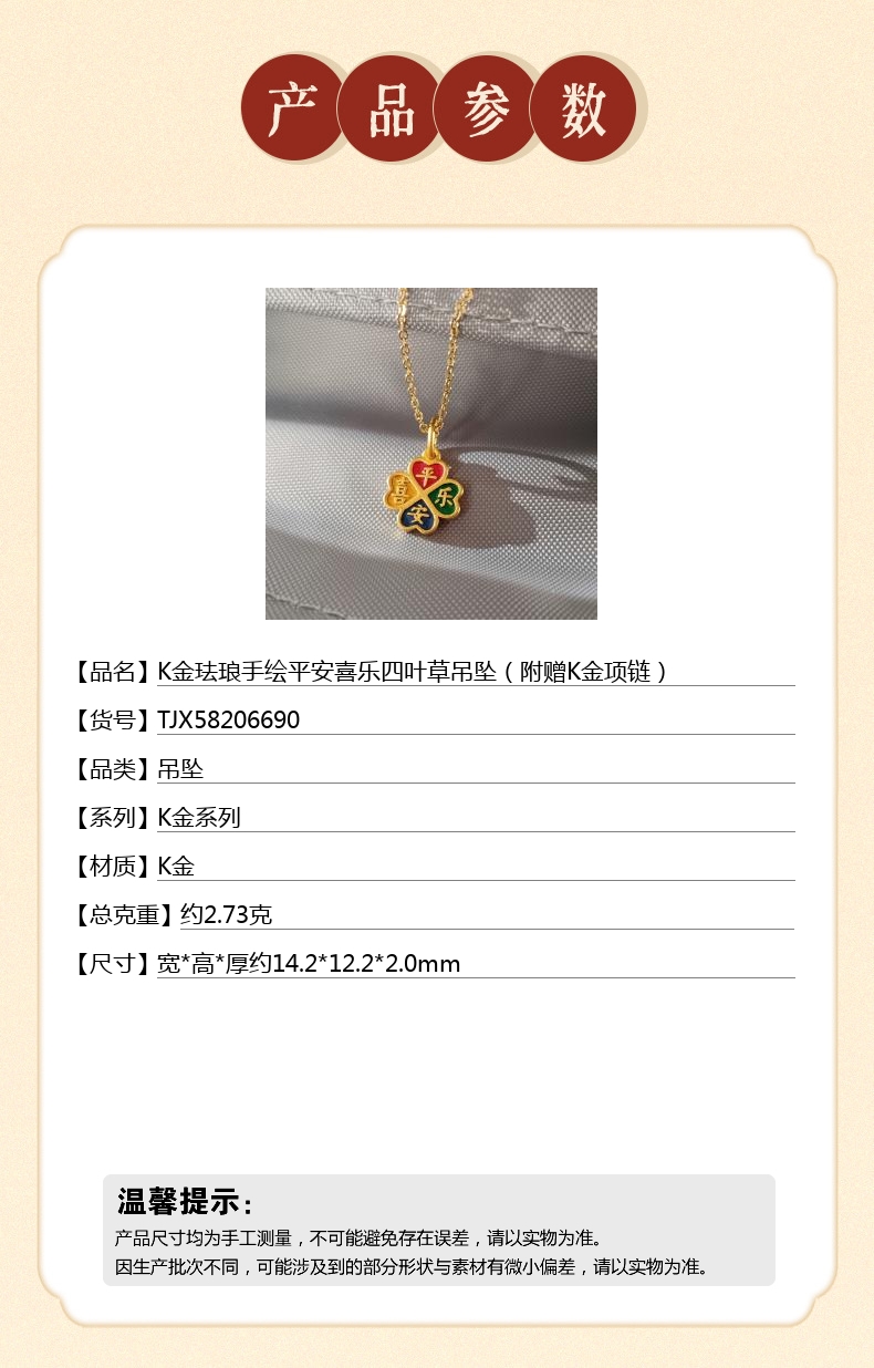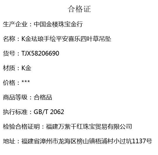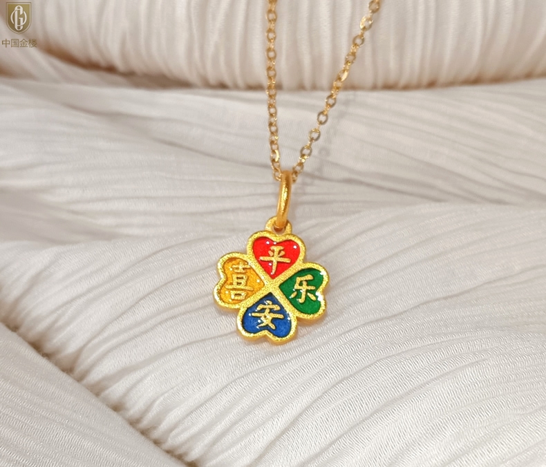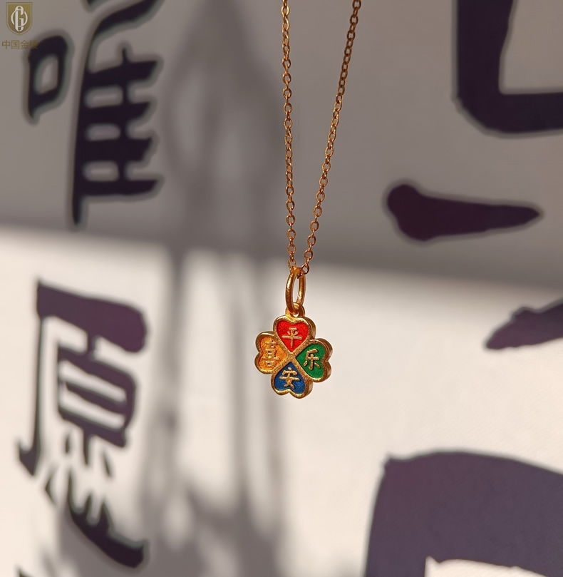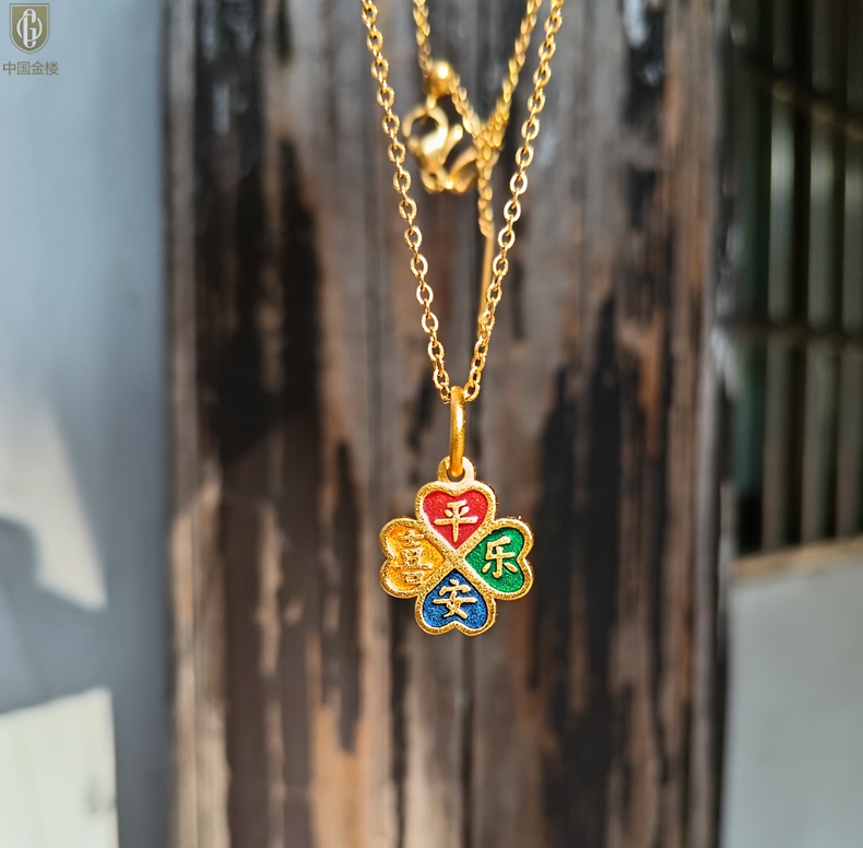 【品名】中国金楼K金珐琅手绘平安喜乐四叶草吊坠(附赠K金项链)