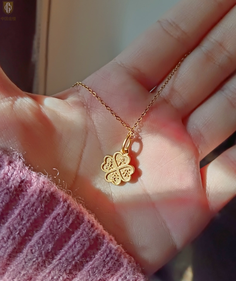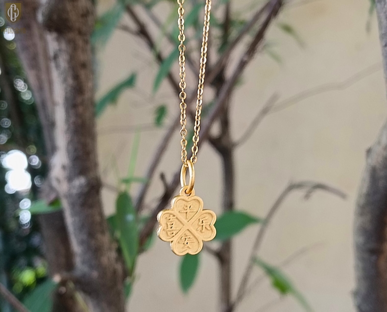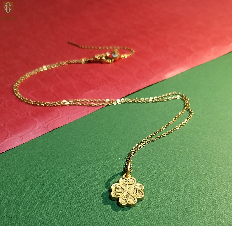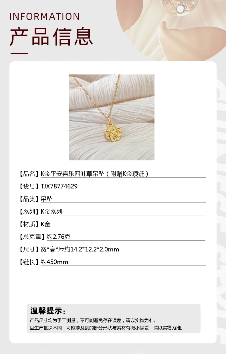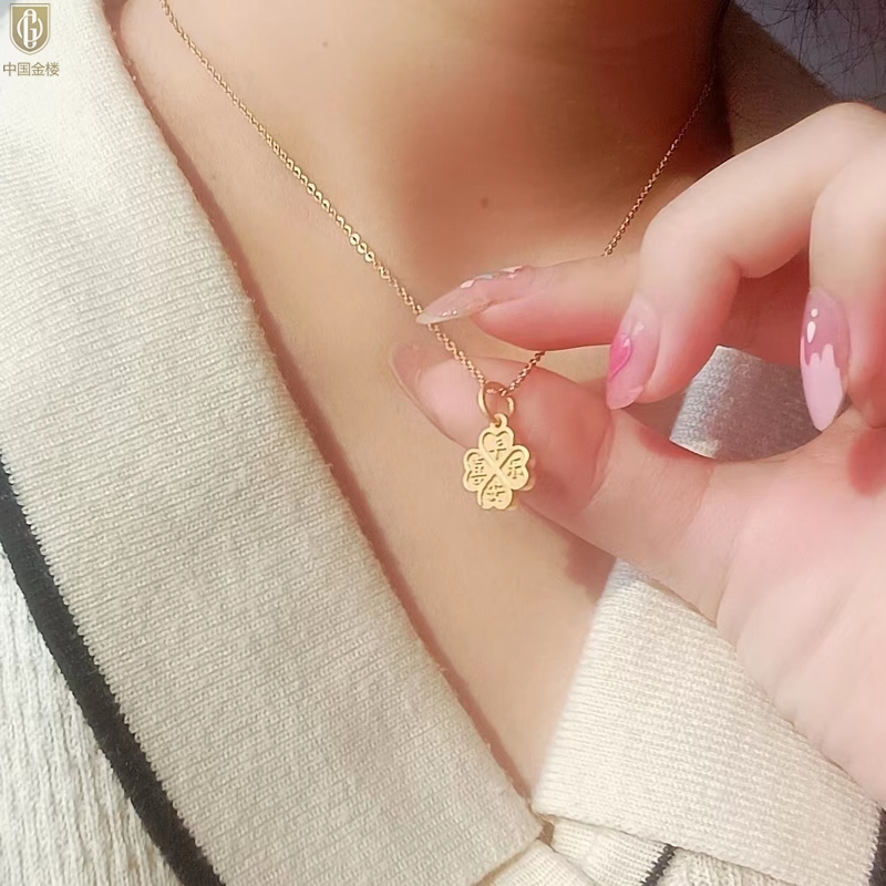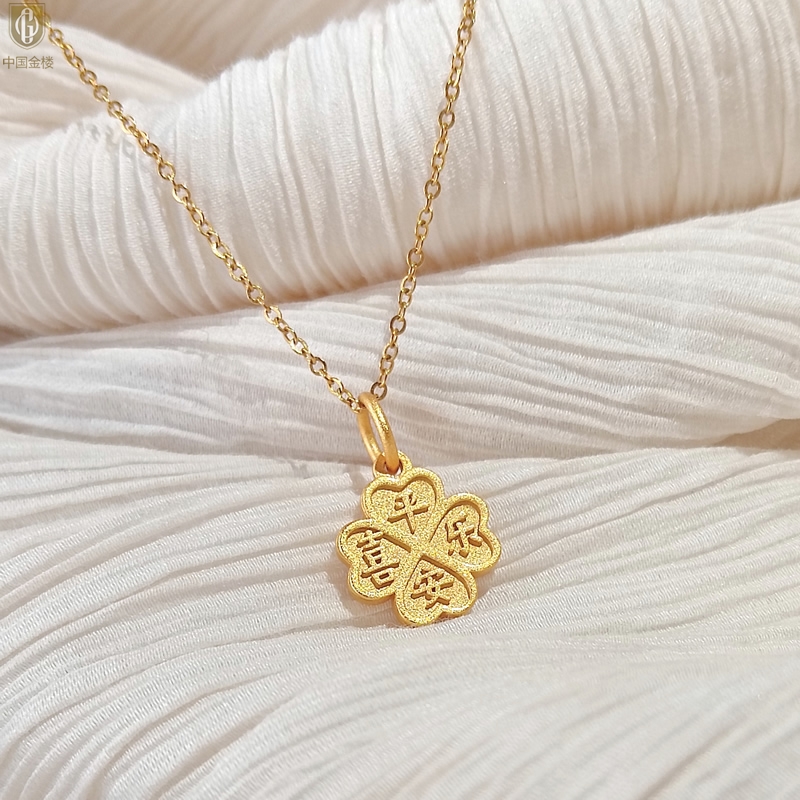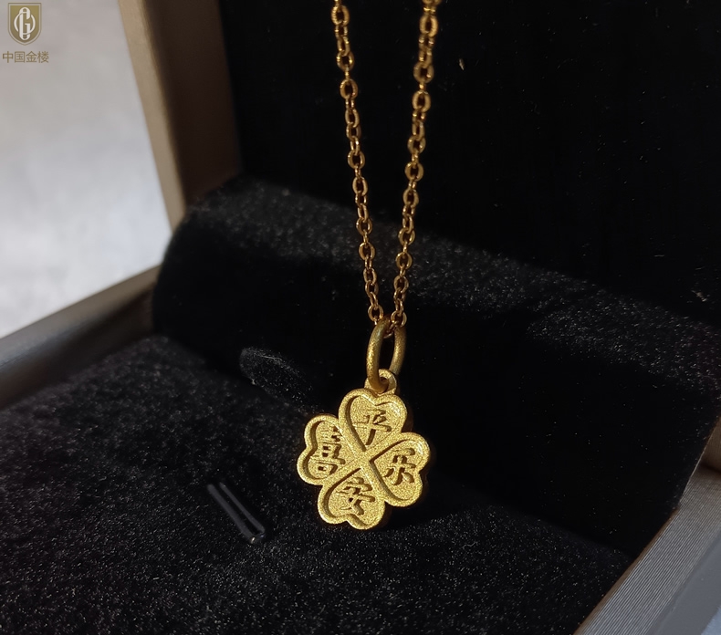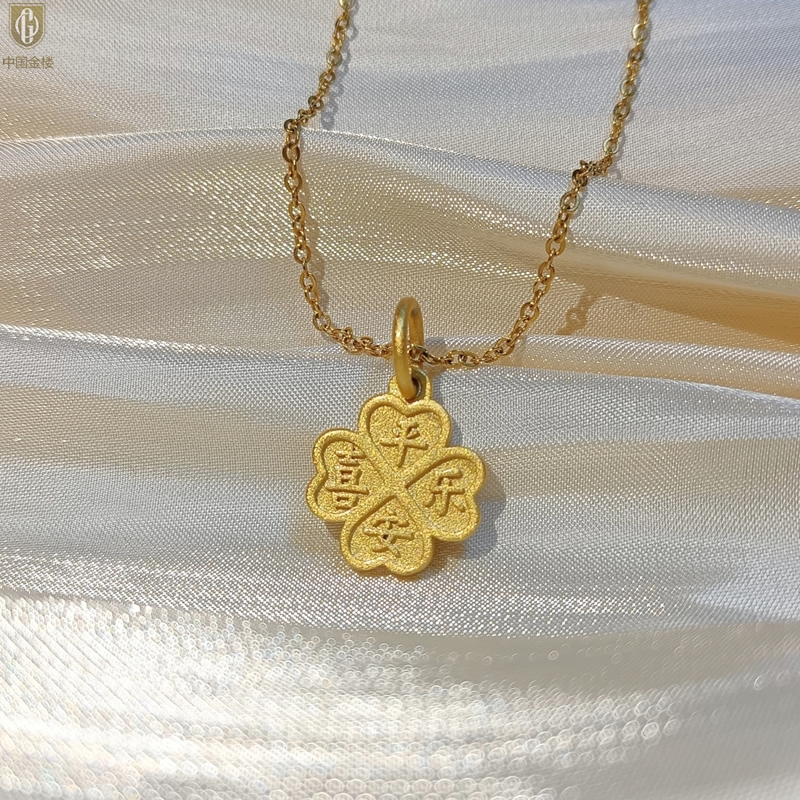 【品名】中国金楼K金平安喜乐四叶草吊坠(附赠K金项链)