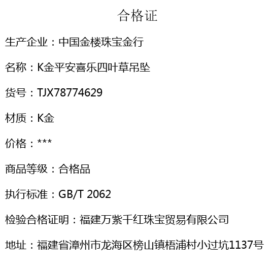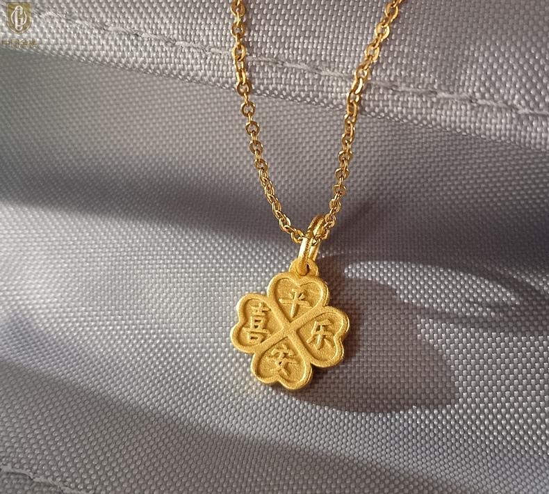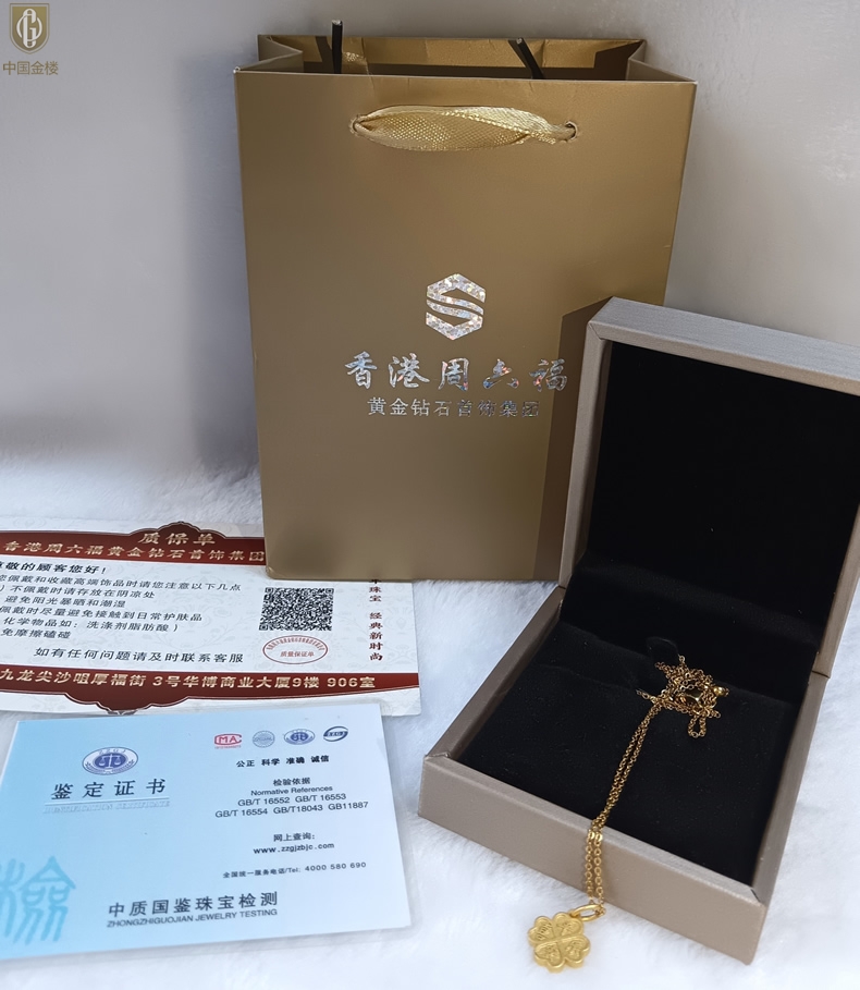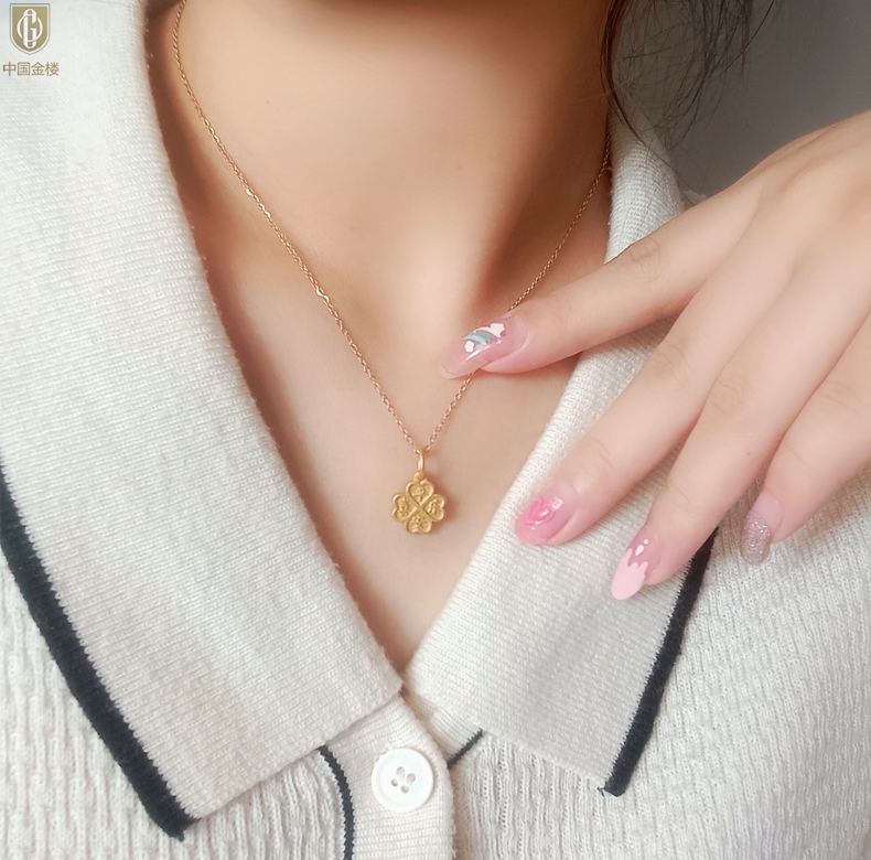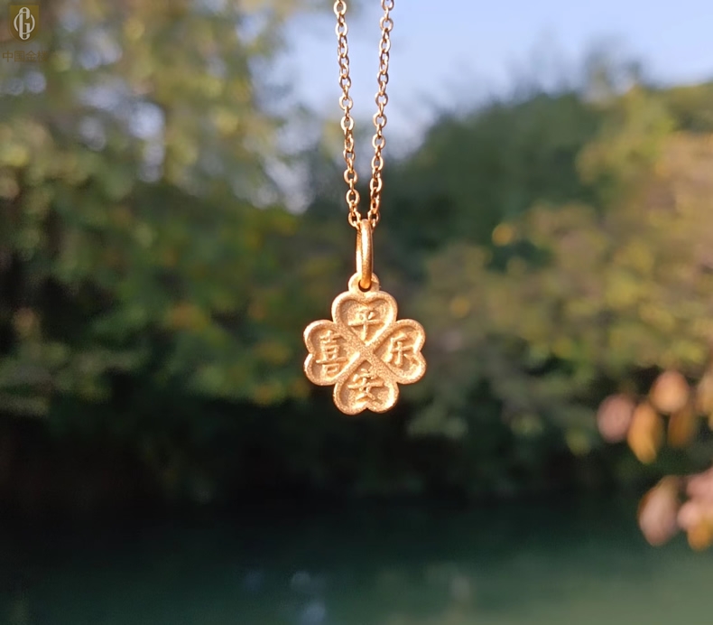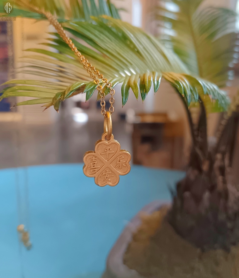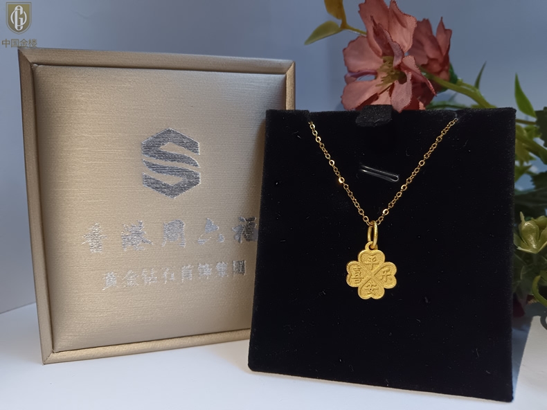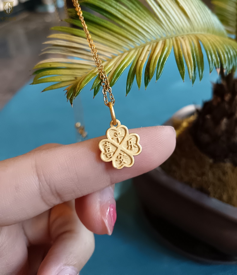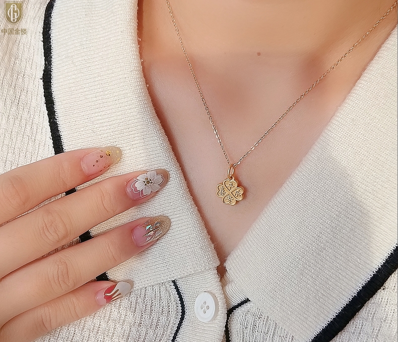 【品名】中国金楼K金平安喜乐四叶草吊坠(附赠K金项链)