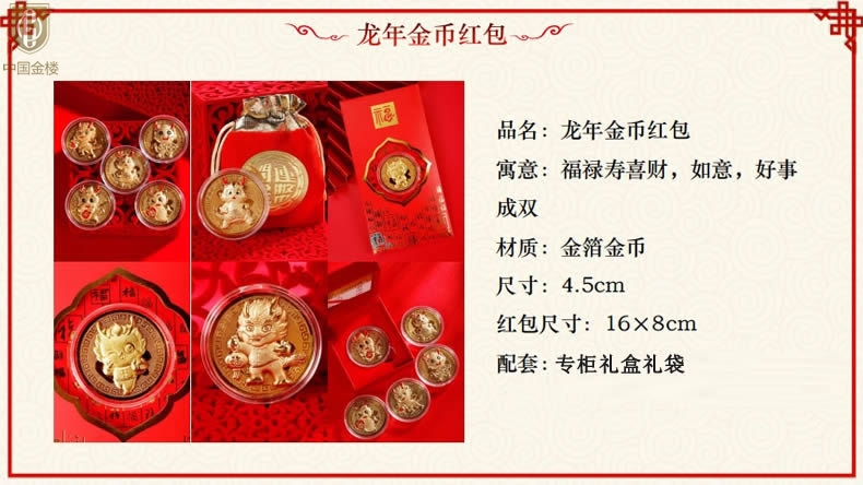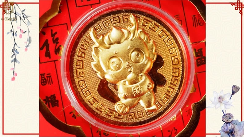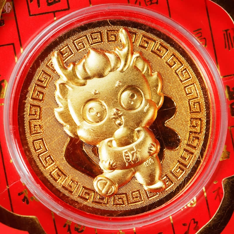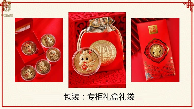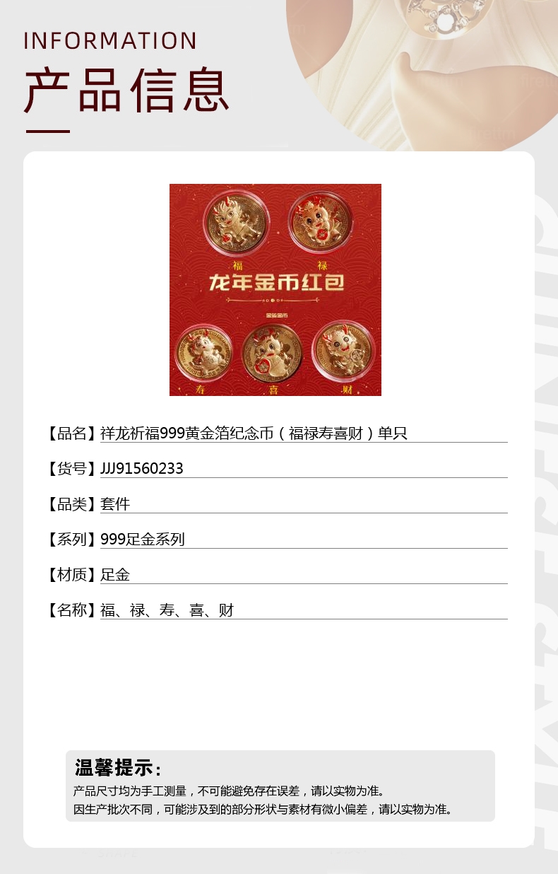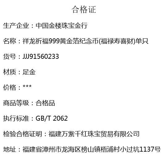【品名】中国金楼祥龙祈福999黄金箔纪念币(福禄寿喜财)单只
