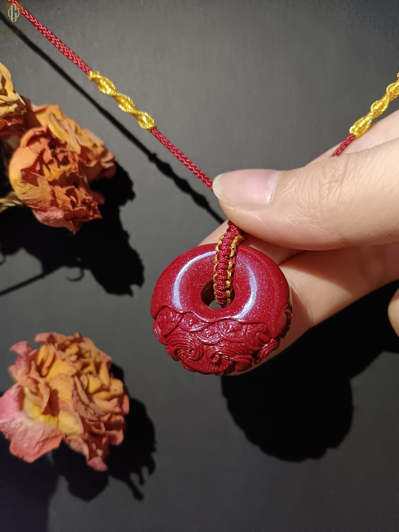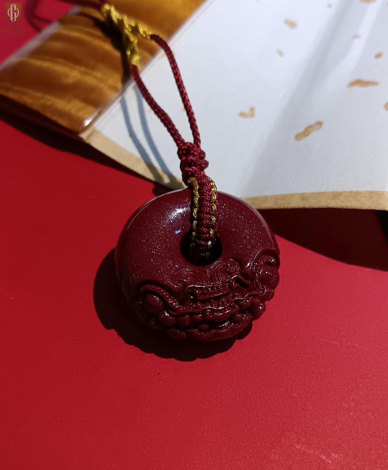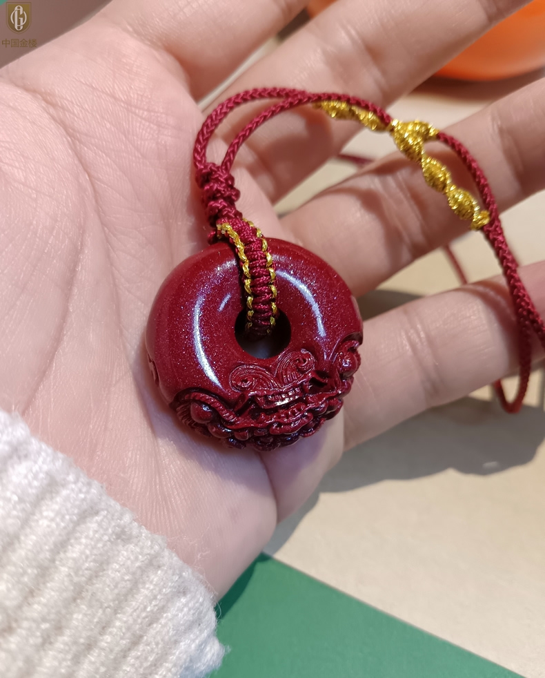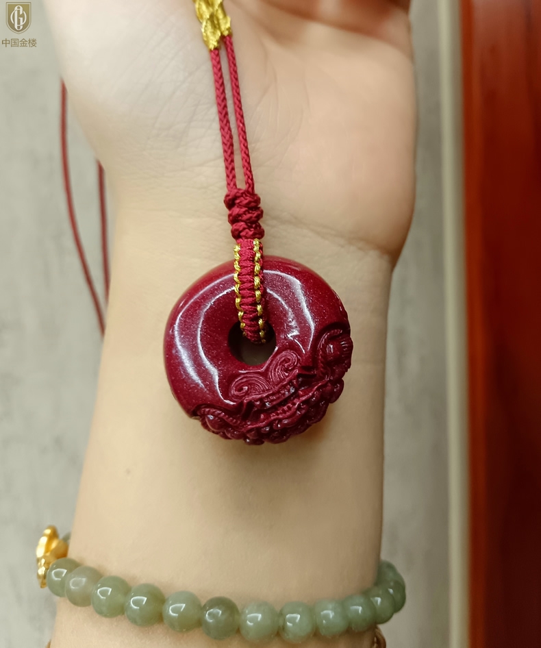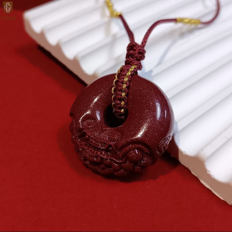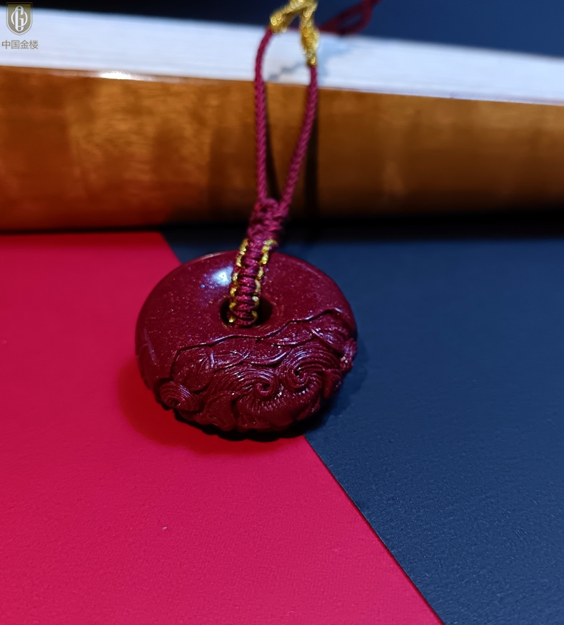 【品名】中国金楼天然原矿朱砂微雕麒麟平安扣吊坠