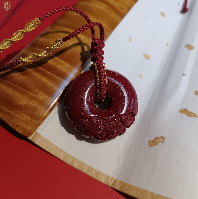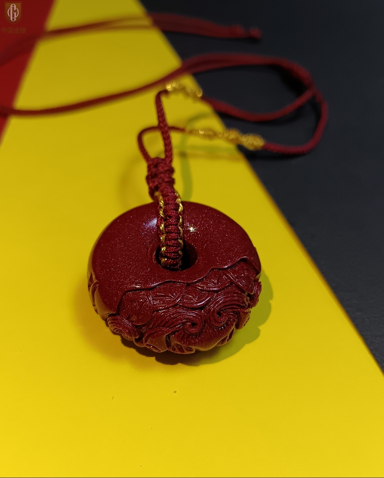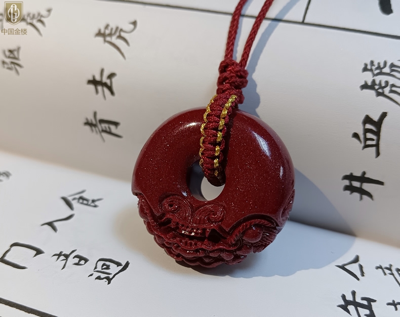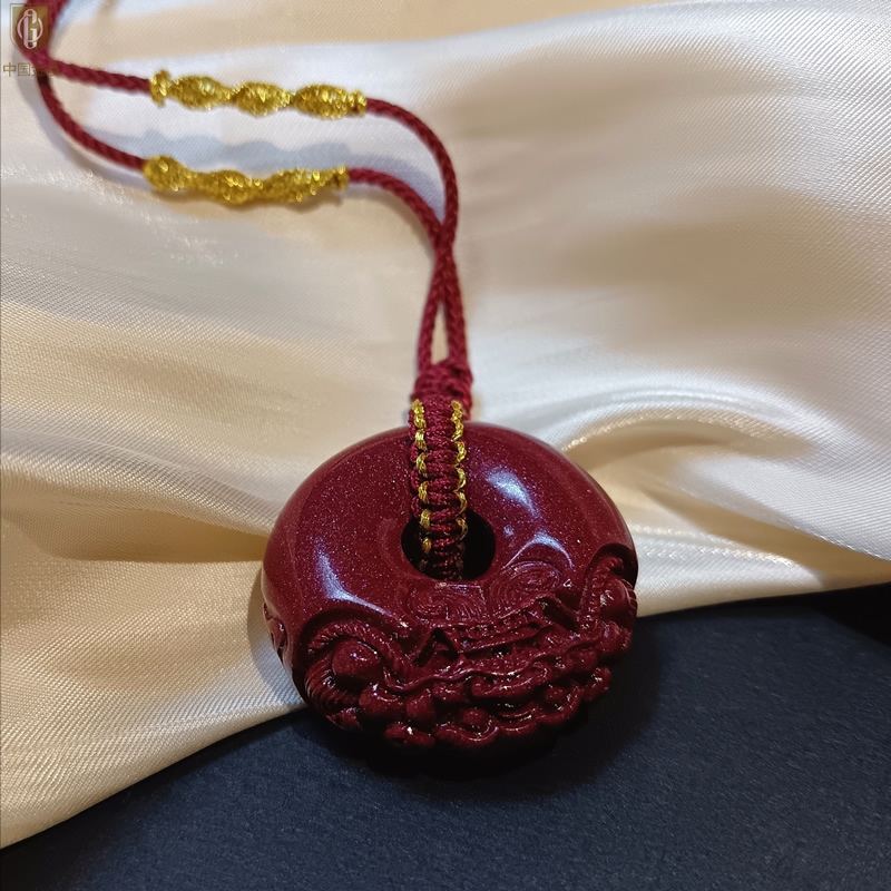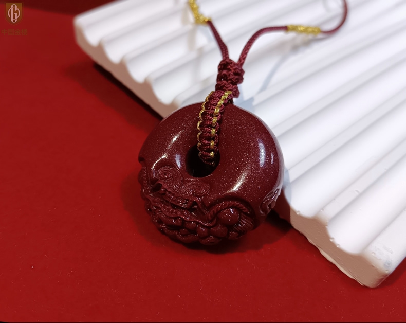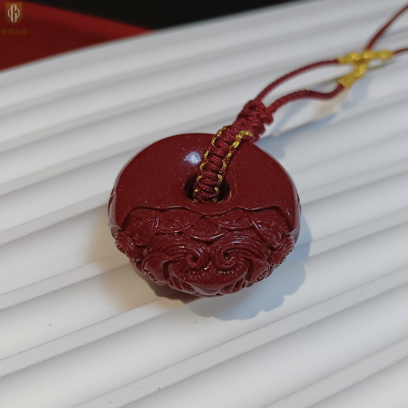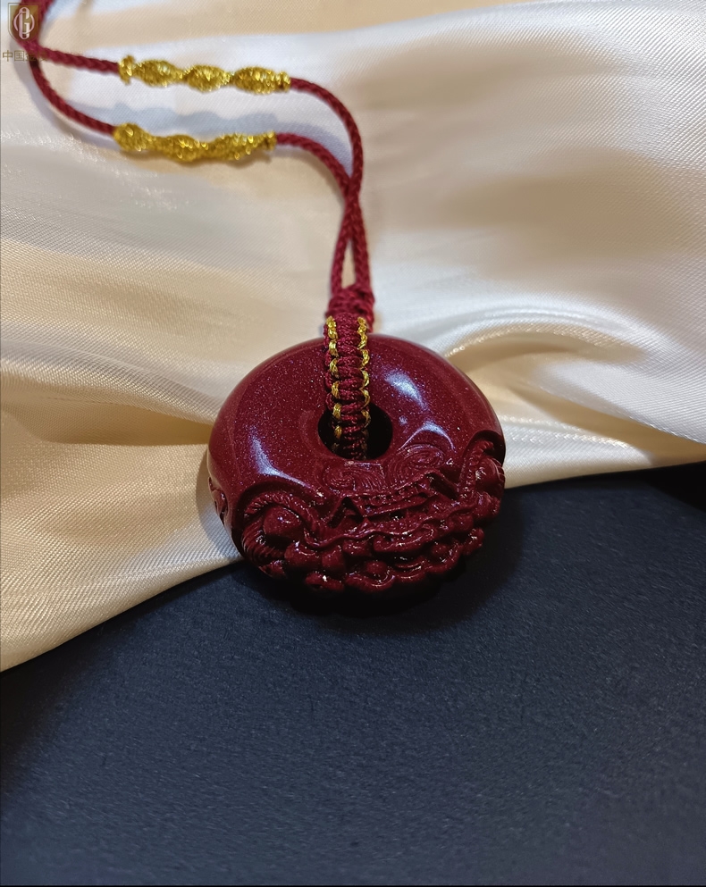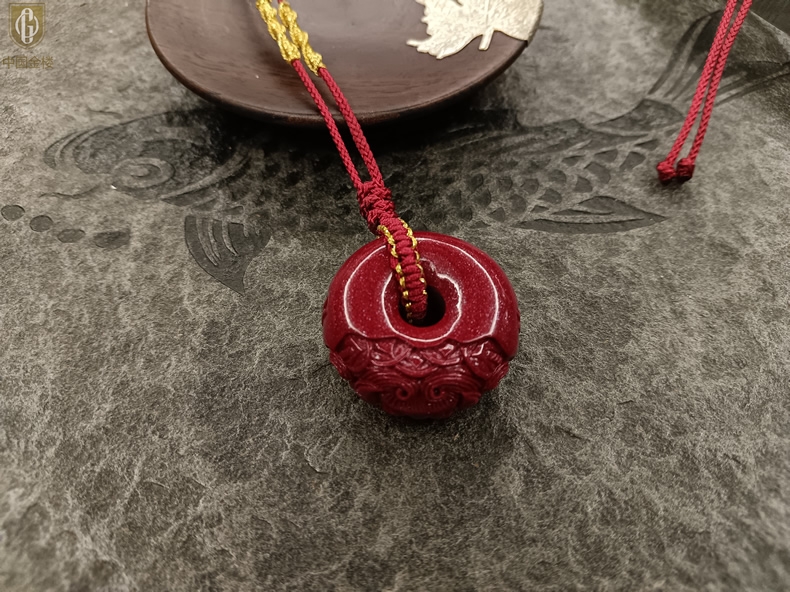 【品名】中国金楼天然原矿朱砂微雕麒麟平安扣吊坠
