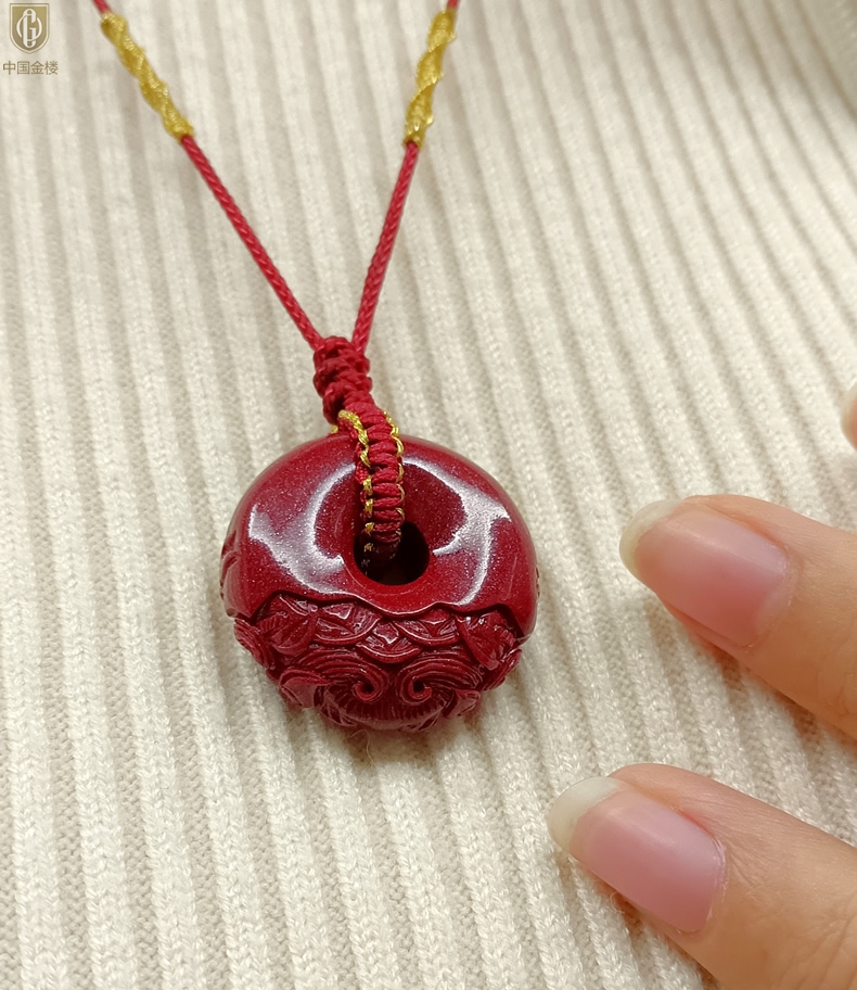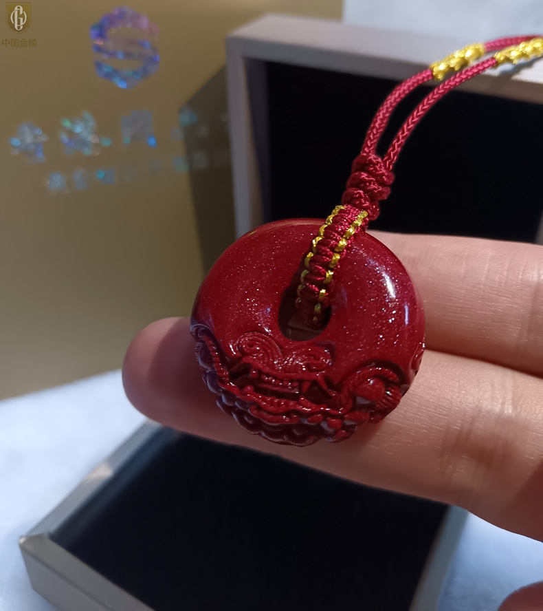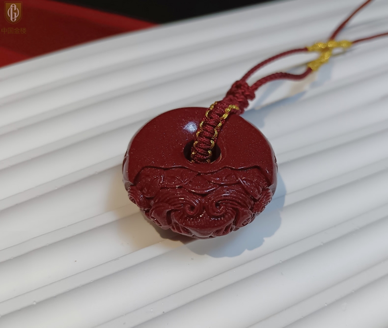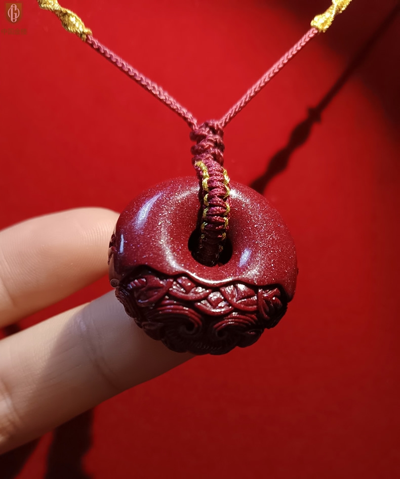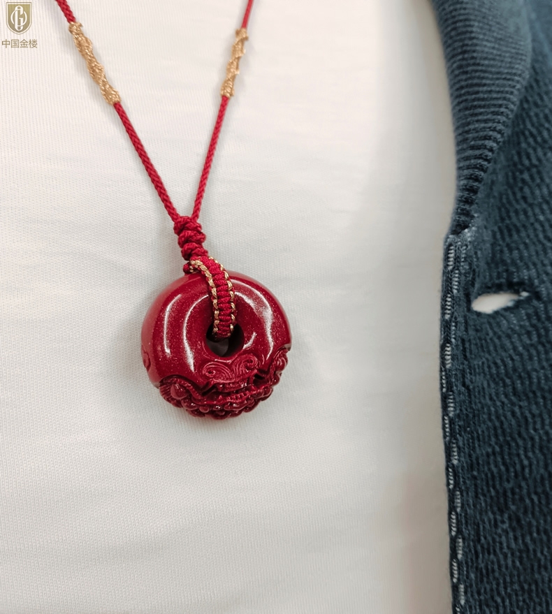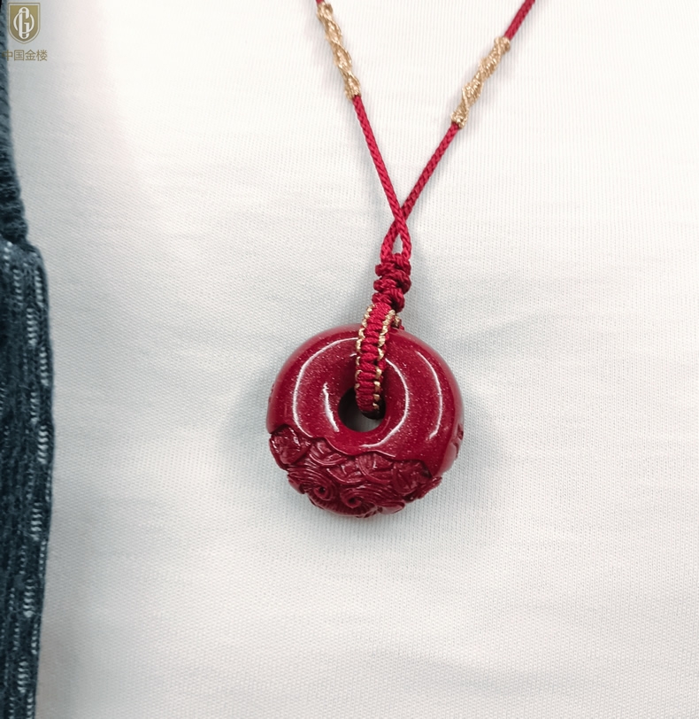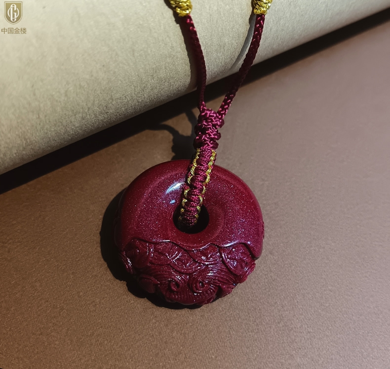 【品名】中国金楼天然原矿朱砂微雕麒麟平安扣吊坠