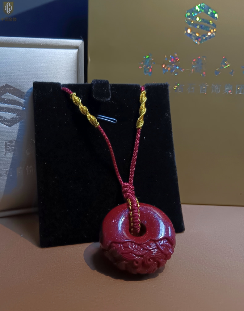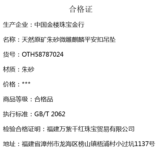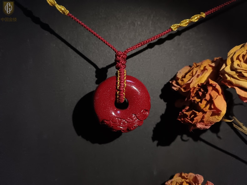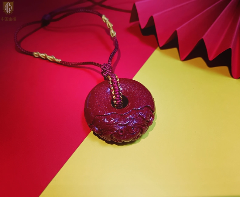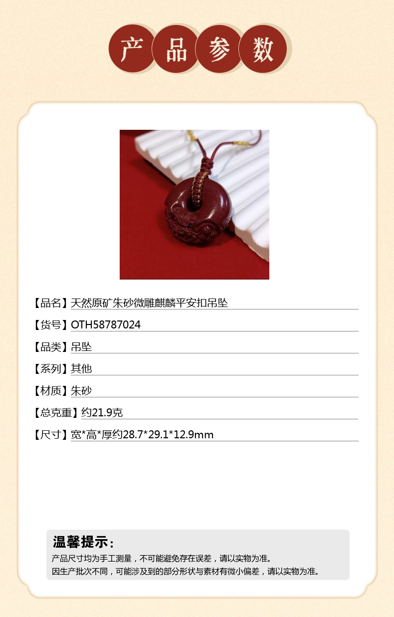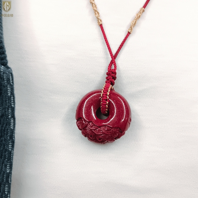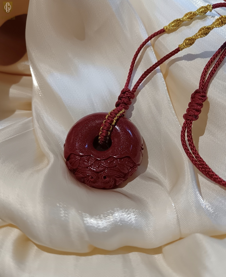【品名】中国金楼天然原矿朱砂微雕麒麟平安扣吊坠