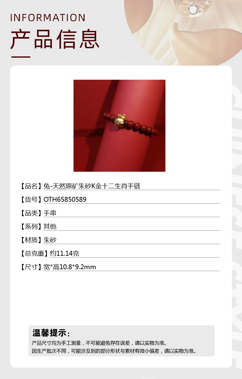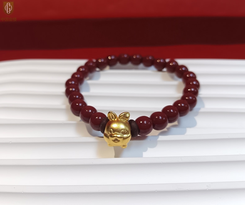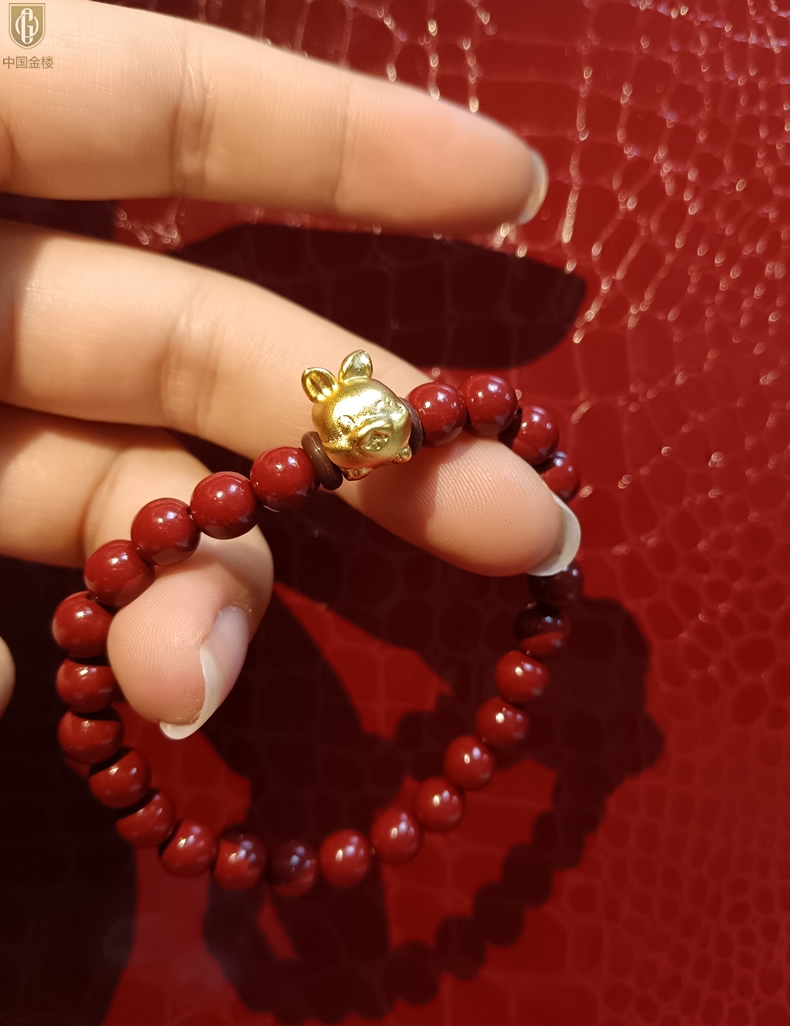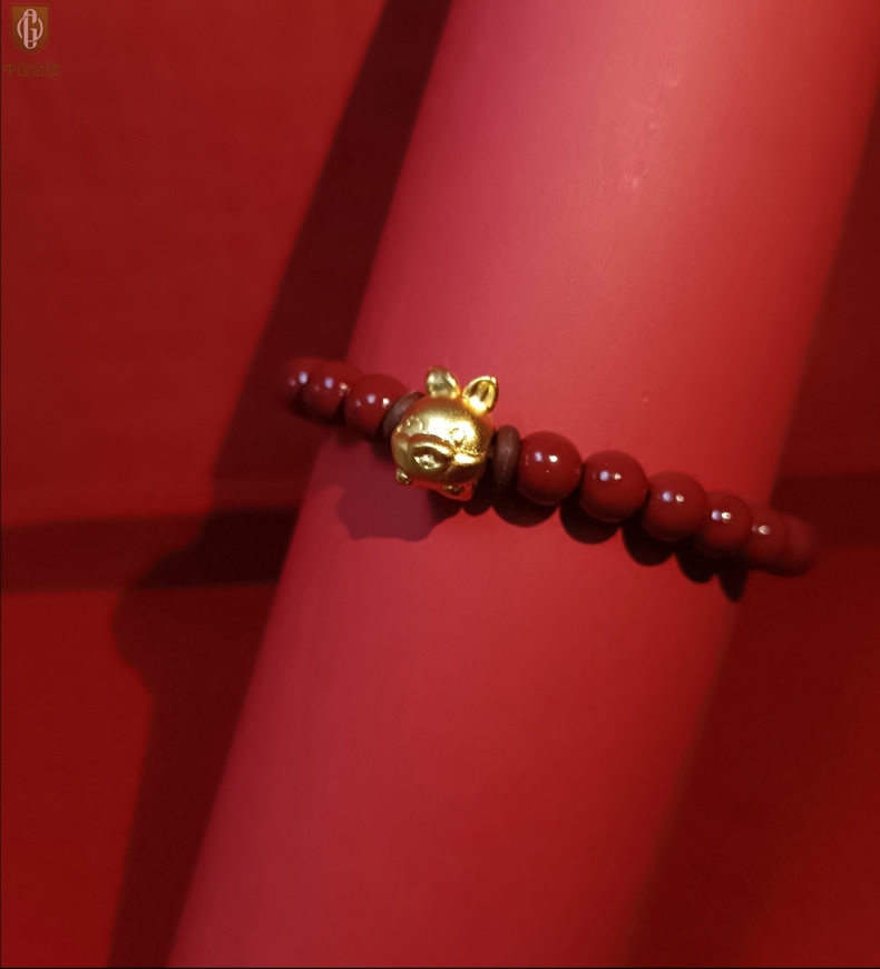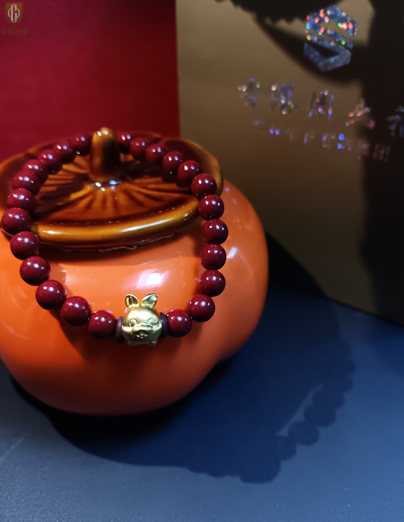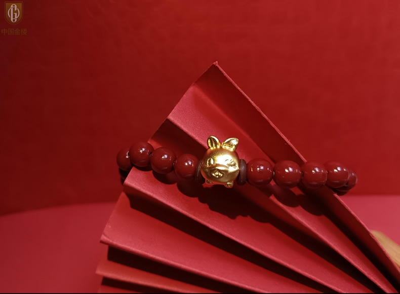 【品名】中国金楼兔-天然原矿朱砂K金十二生肖手链