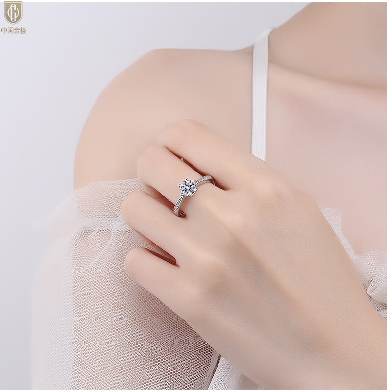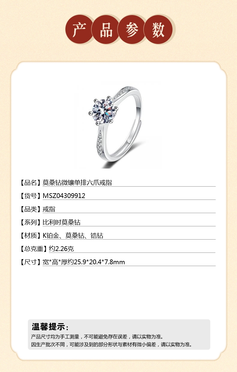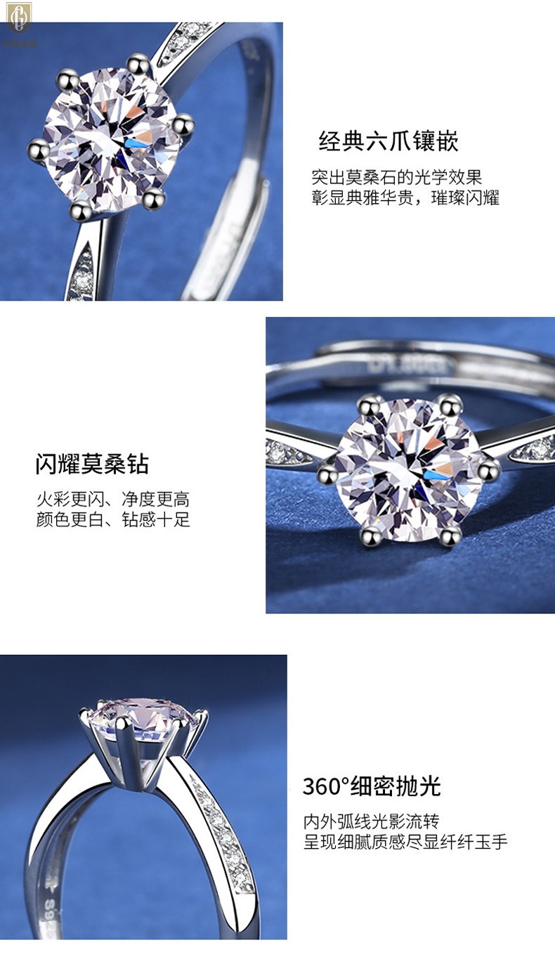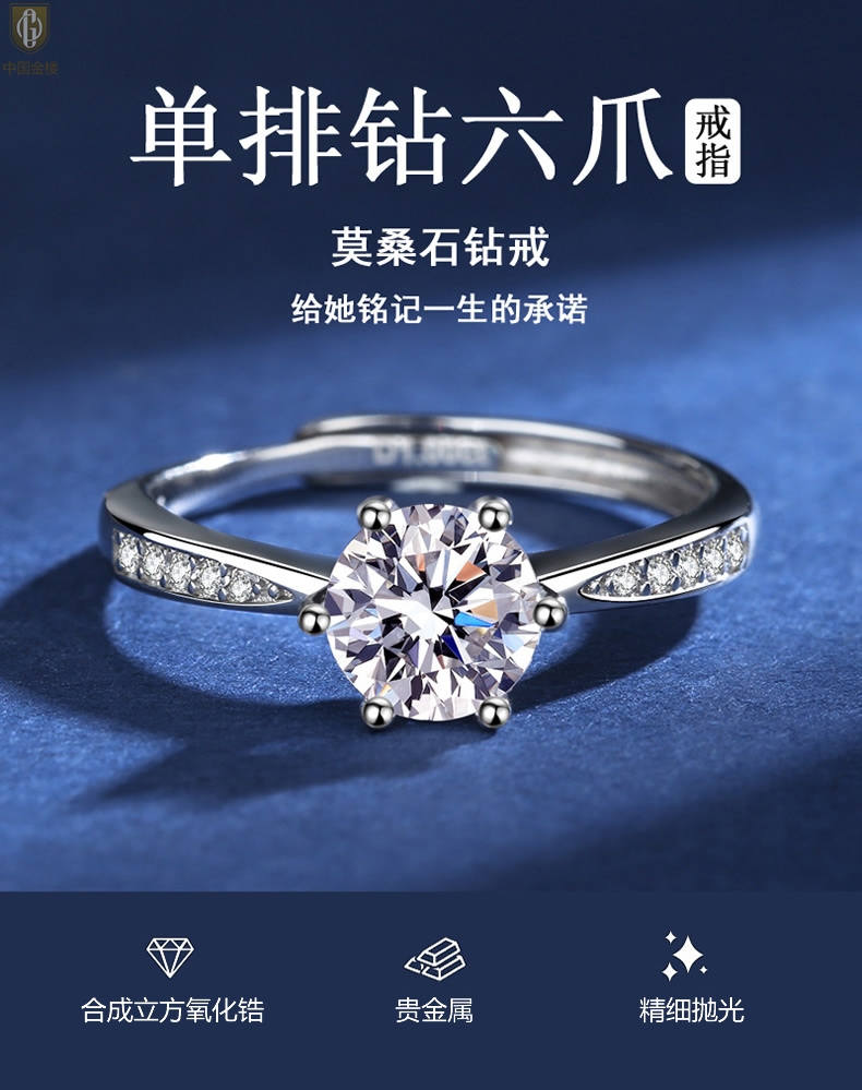 【品名】中国金楼莫桑钻微镶单排六爪戒指