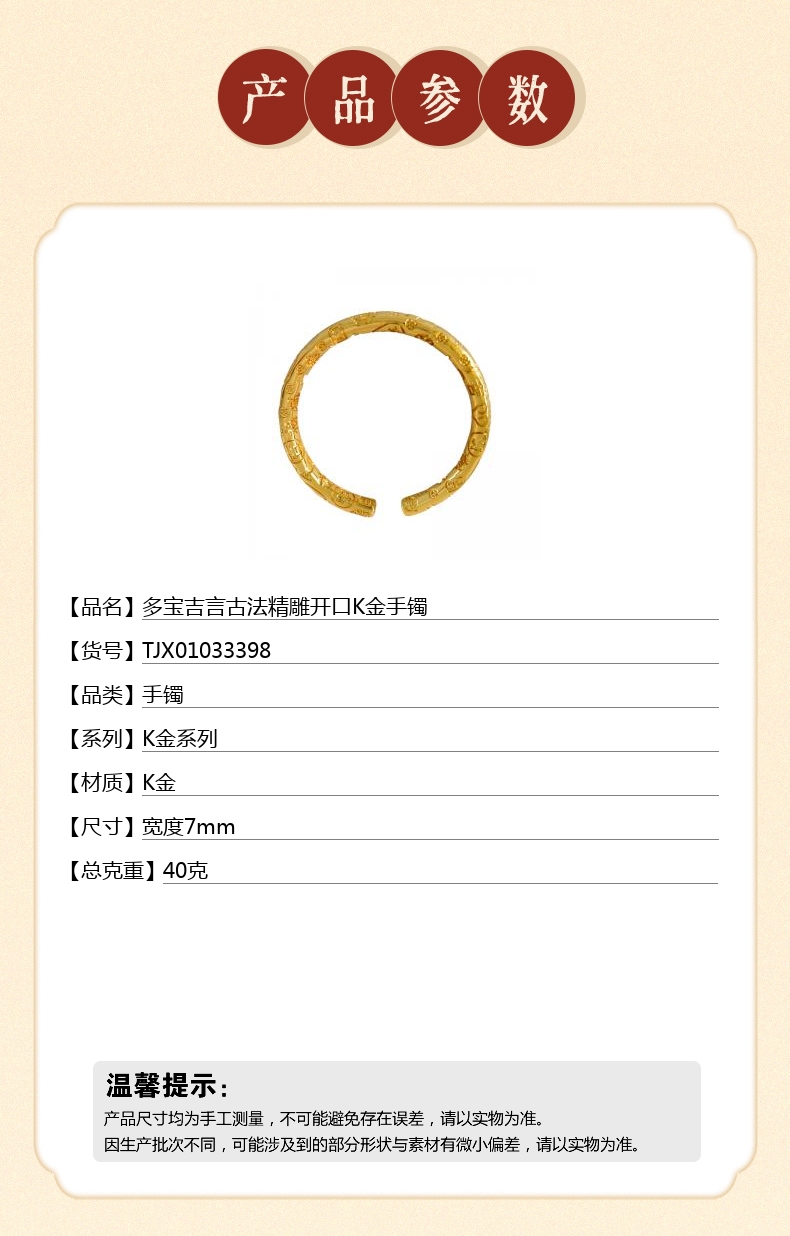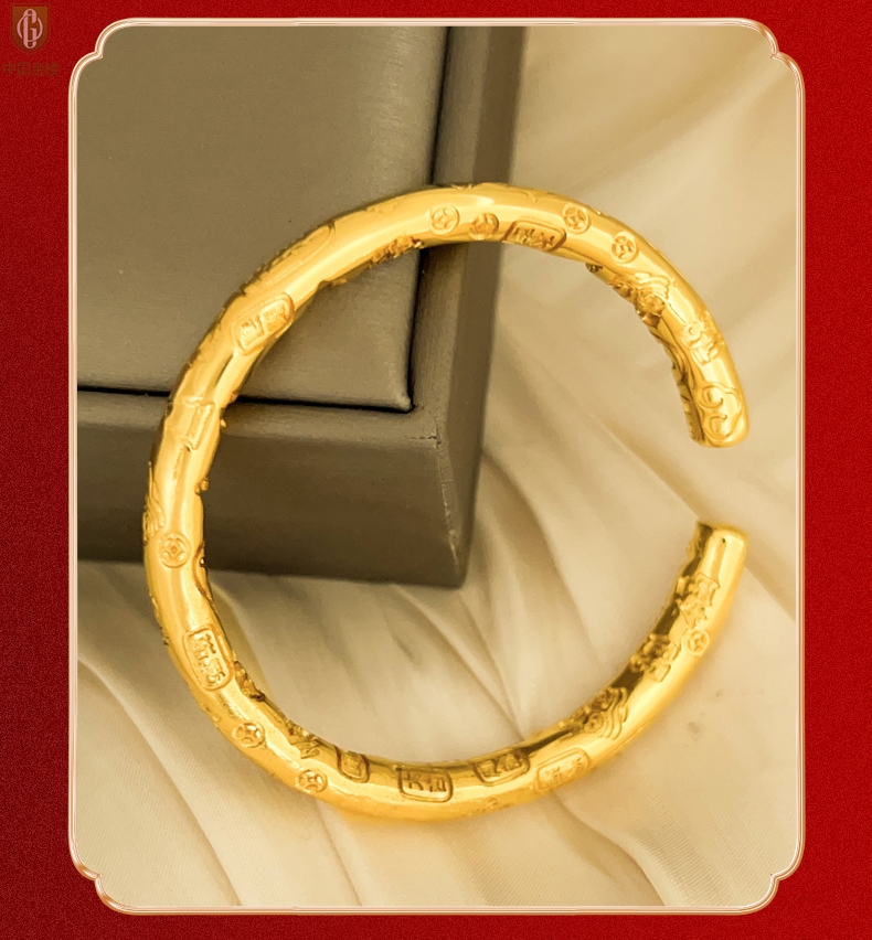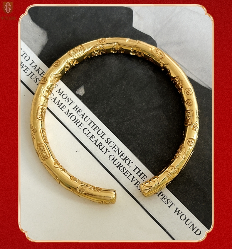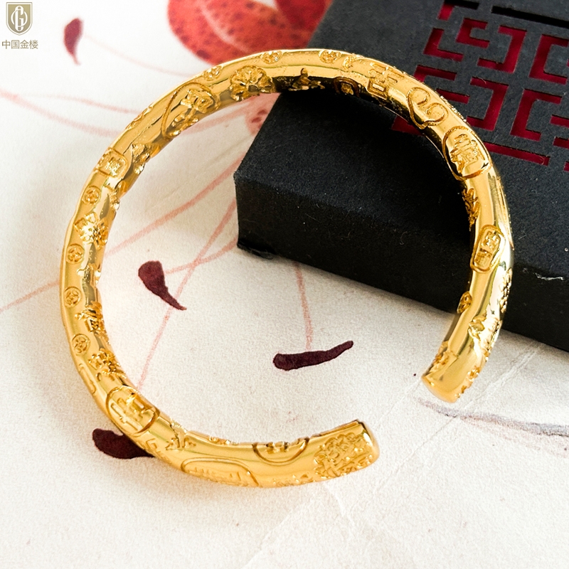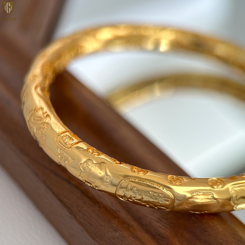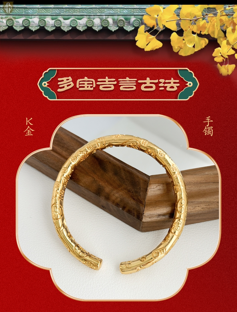 【品名】中国金楼多宝吉言古法精雕开口K金手镯