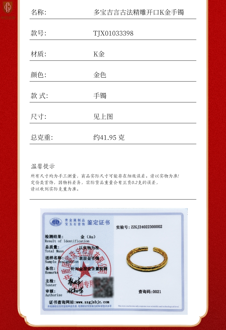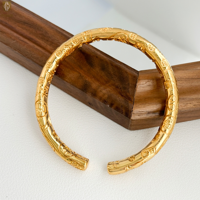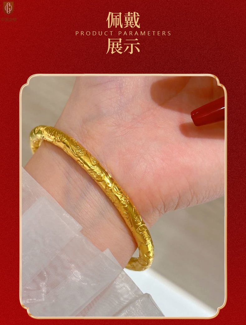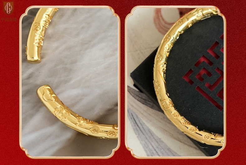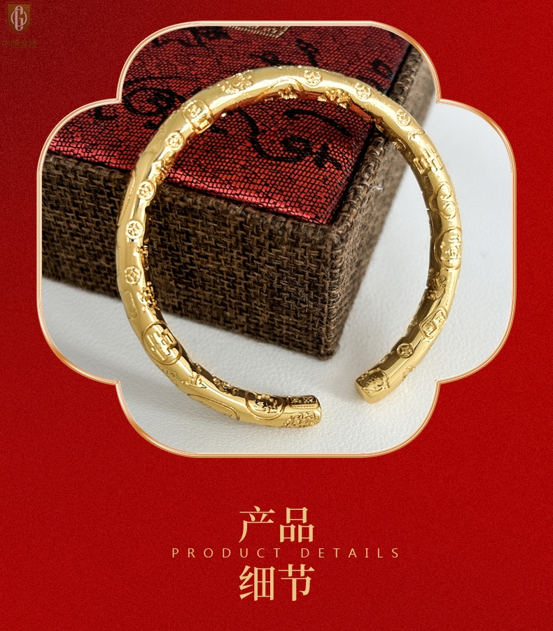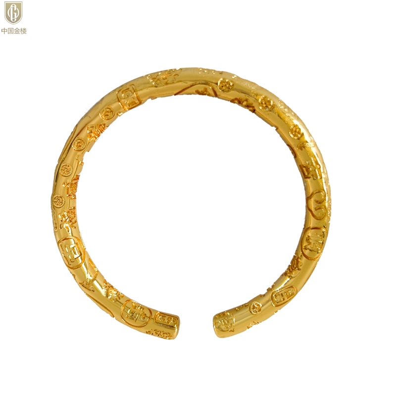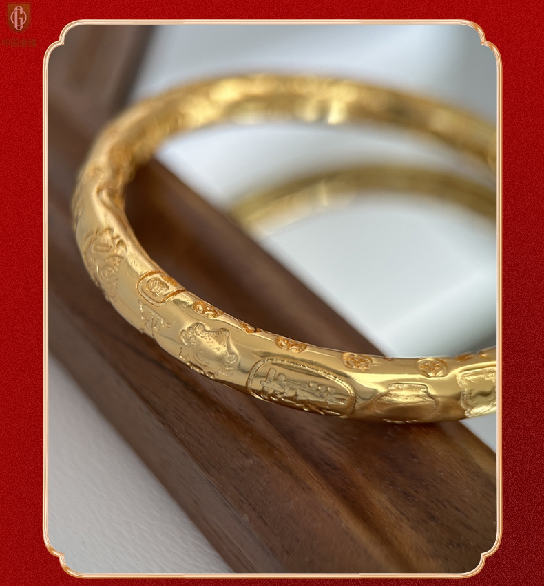 【品名】中国金楼多宝吉言古法精雕开口K金手镯