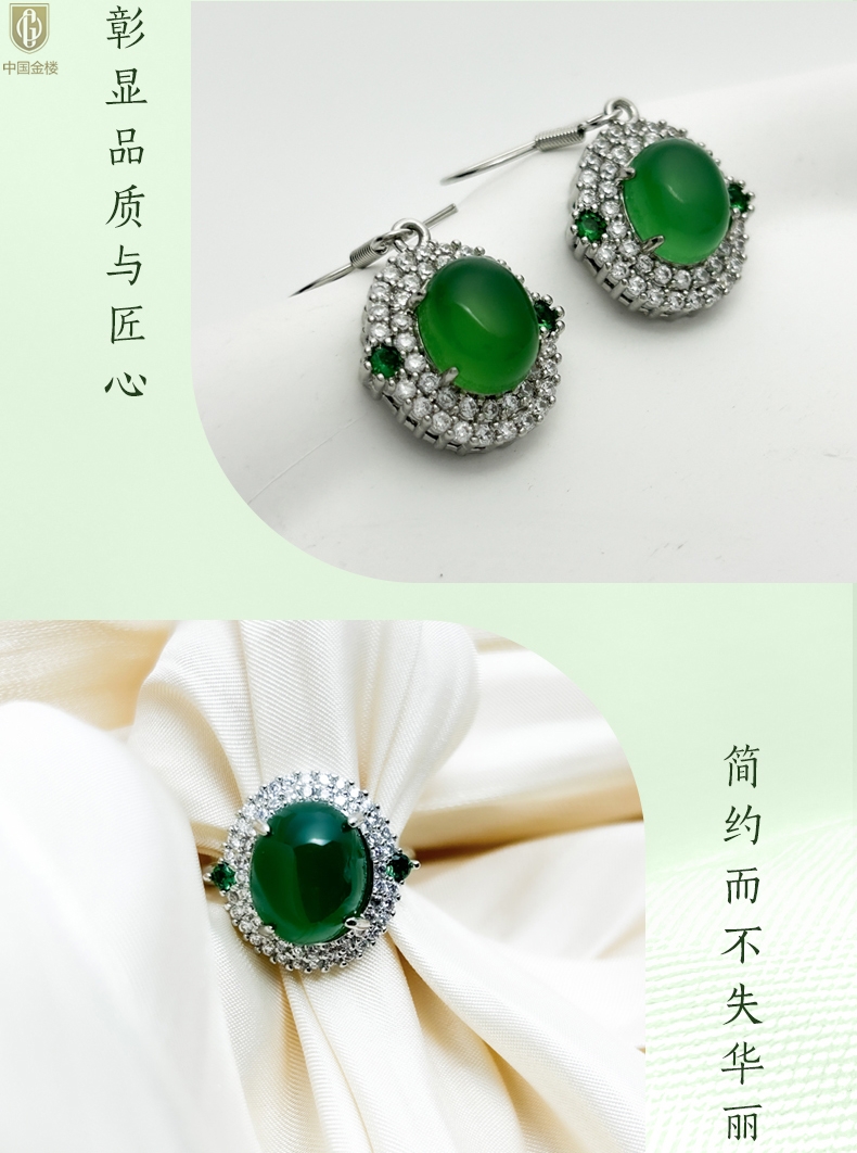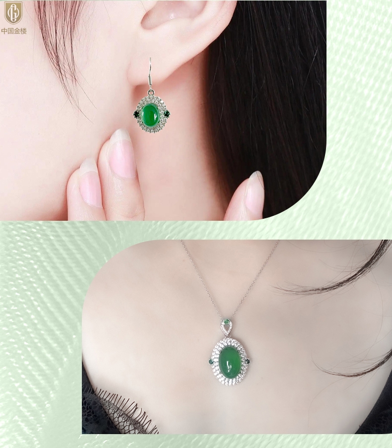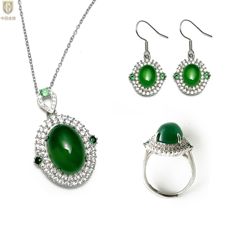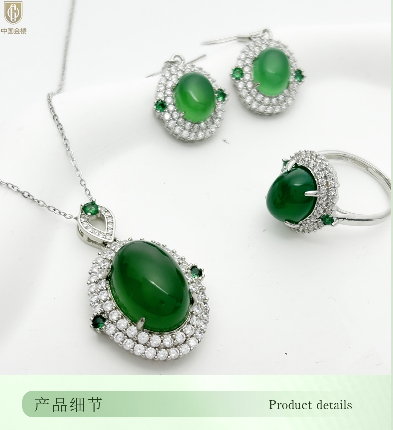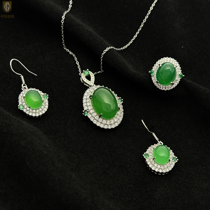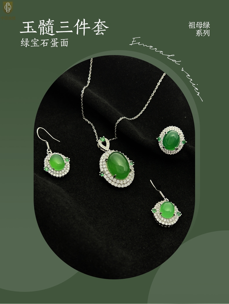 【品名】中国金楼祖母绿玉髓三件套(绿宝石蛋面)