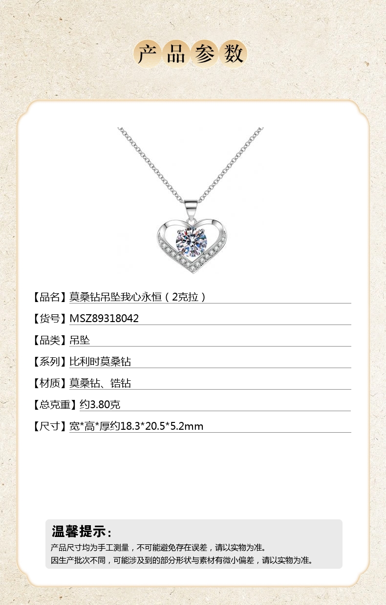 【品名】中国金楼莫桑钻吊坠我心永恒(2克拉)